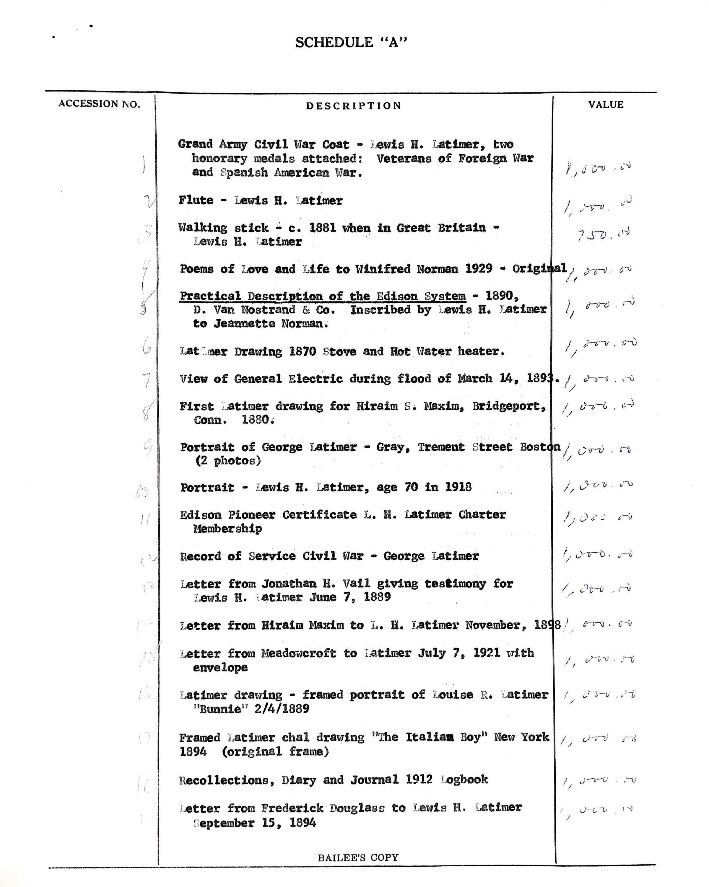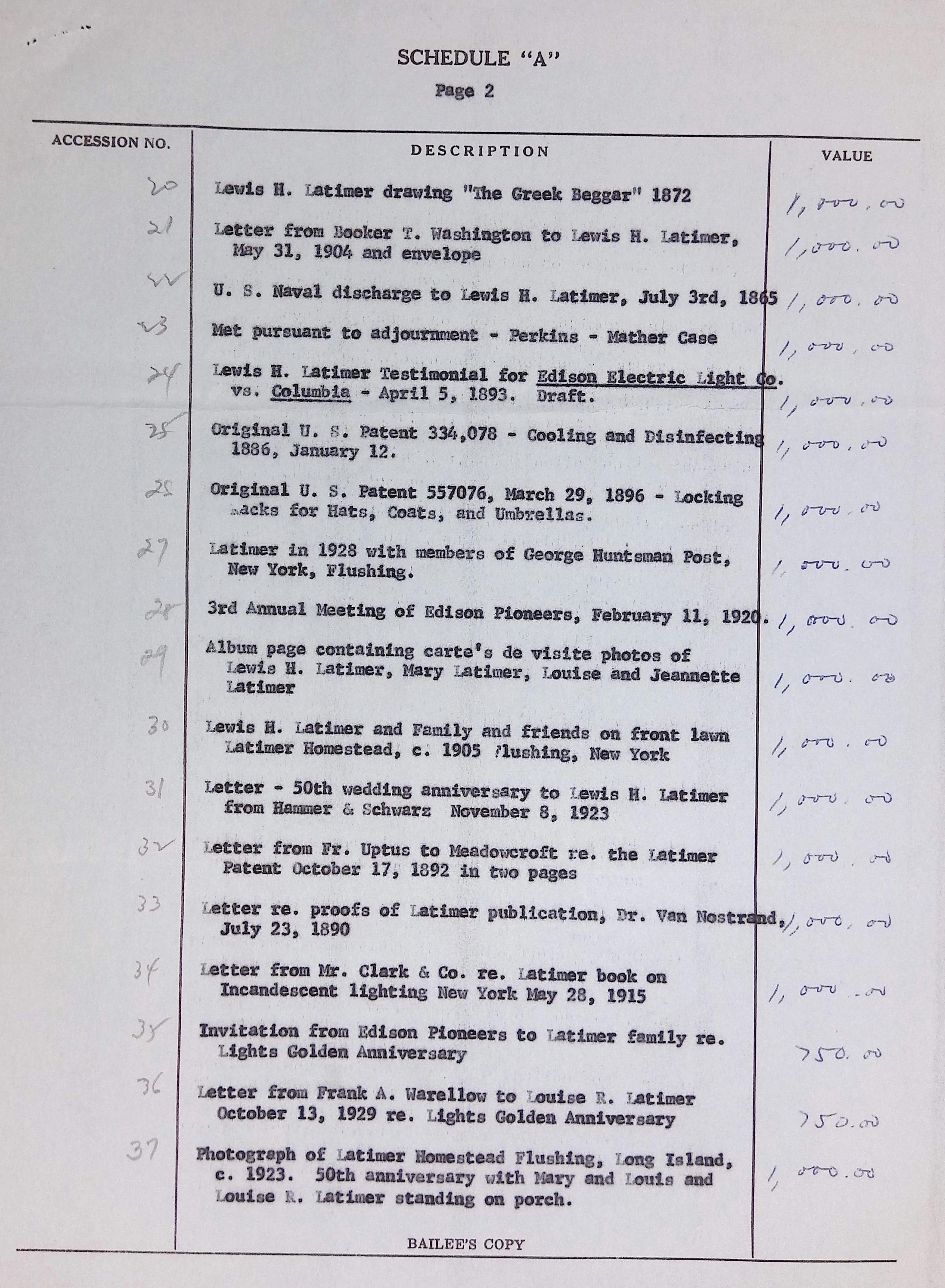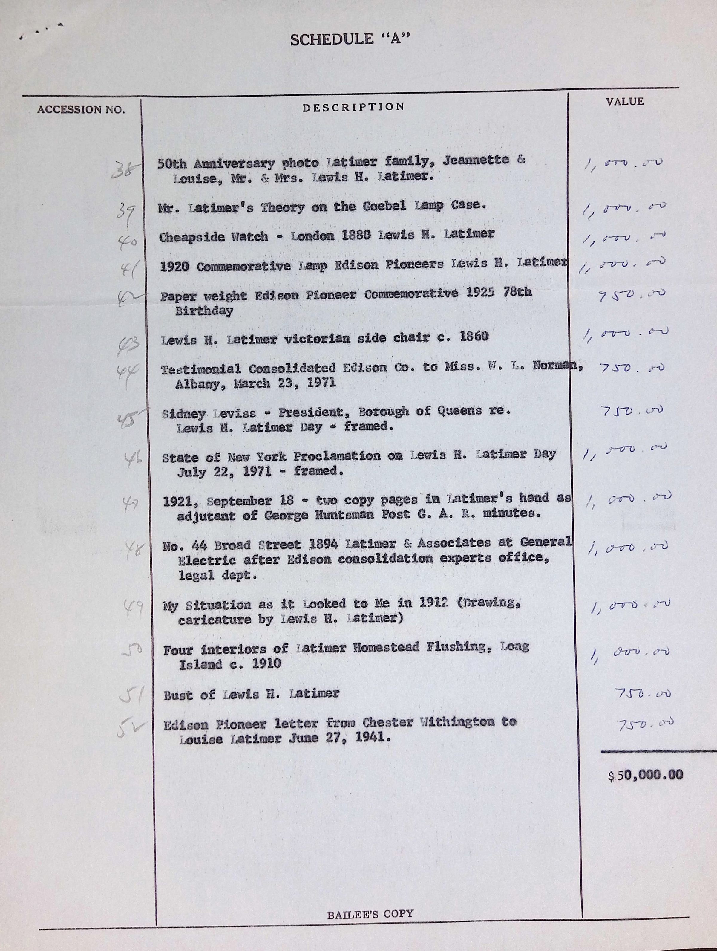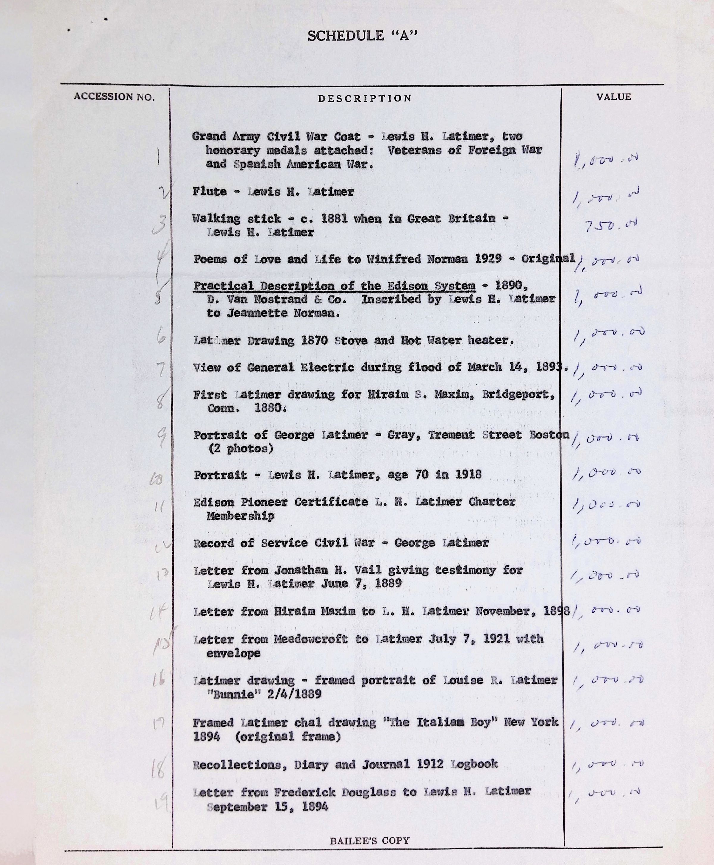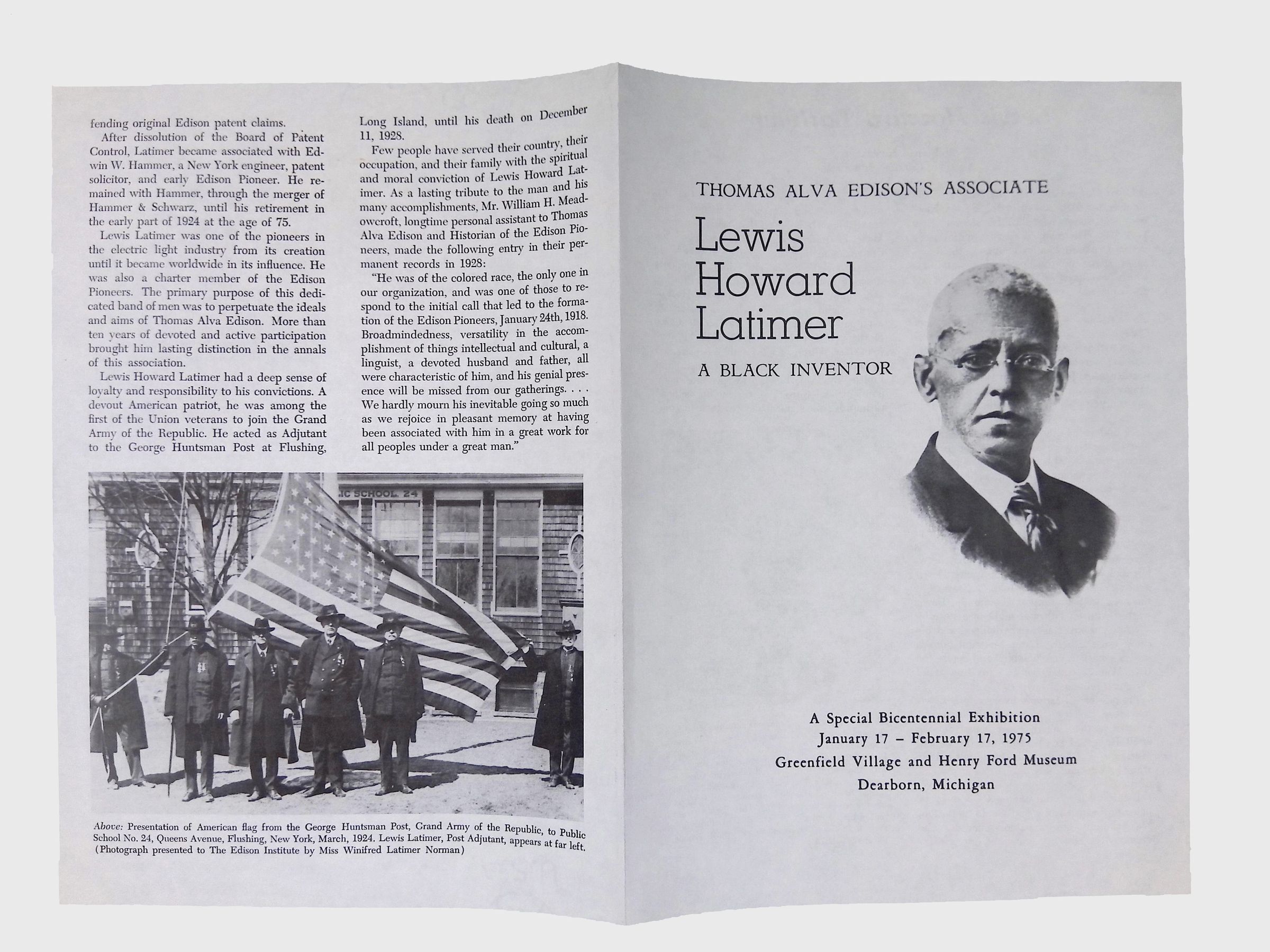 Notably, the folder includes a typed inventory (with stated monetary values) of items associated with Lewis Latimer and evidently loaned for a special exhibition, “Thomas Alva Edison’s Associate Lewis Howard Latimer: A Black Inventor,” displayed in 1975 at Greenfield Village and Henry Ford Museum in Dearborn, Michigan. Also included is a brochure for that exhibition.Context