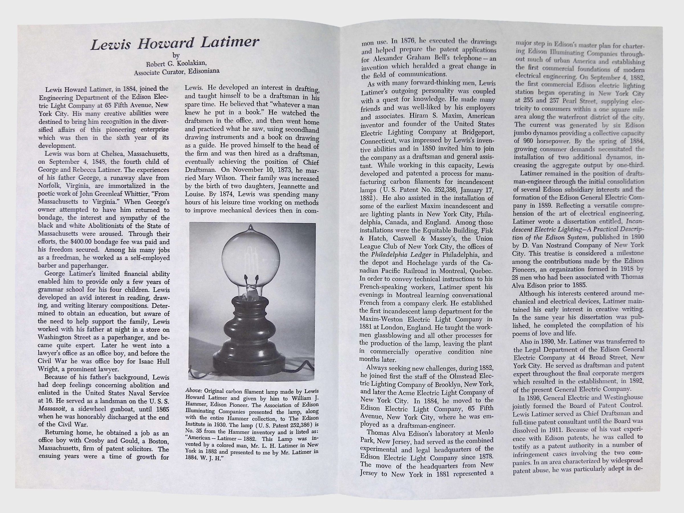 This folder contains biographical booklets, and archival documentation related to Lewis Howard Latimer. The materials include transcripts of speeches or discussions, printed publications detailing Latimer’s contributions, and historical references to his work in electrical engineering and innovation.
