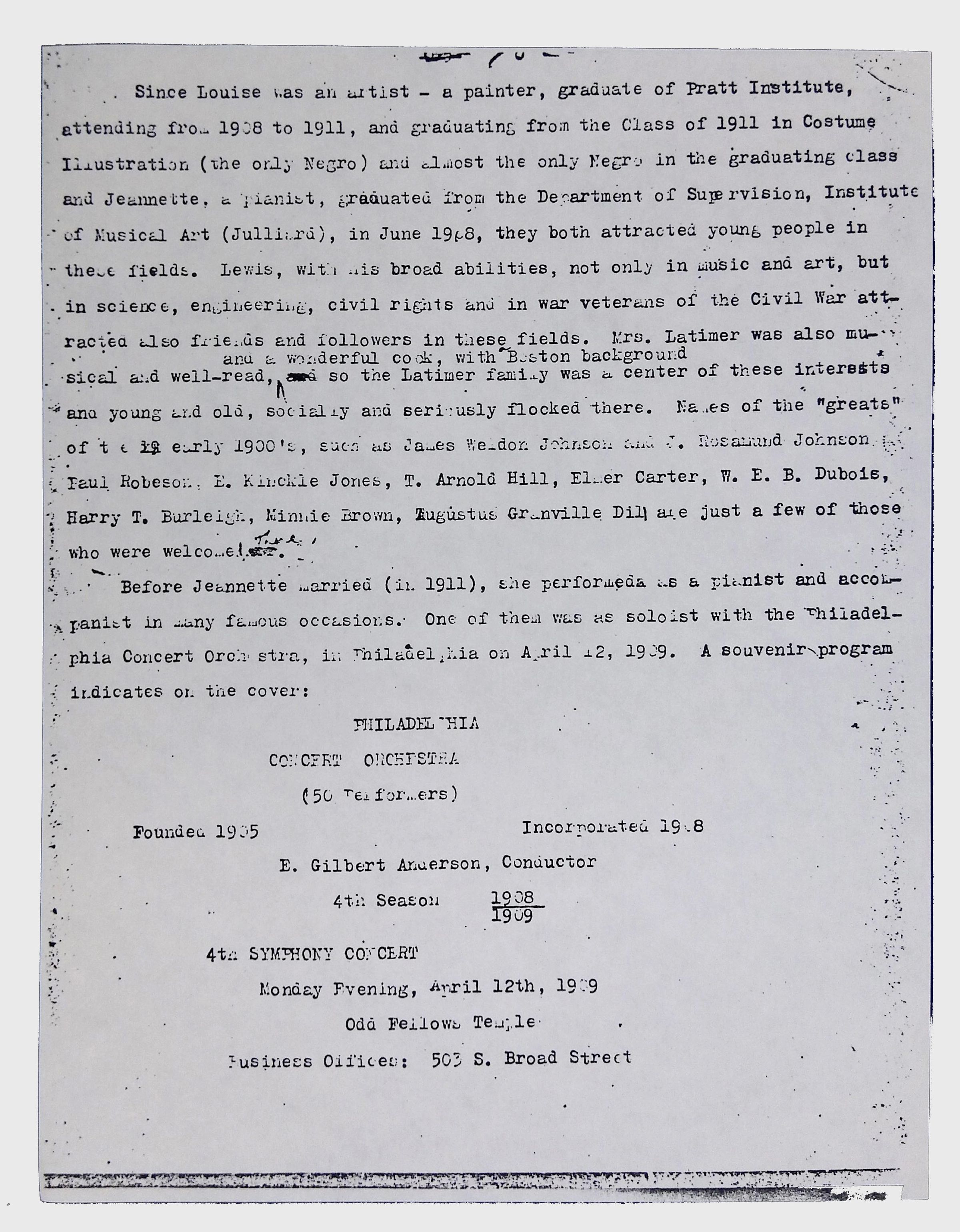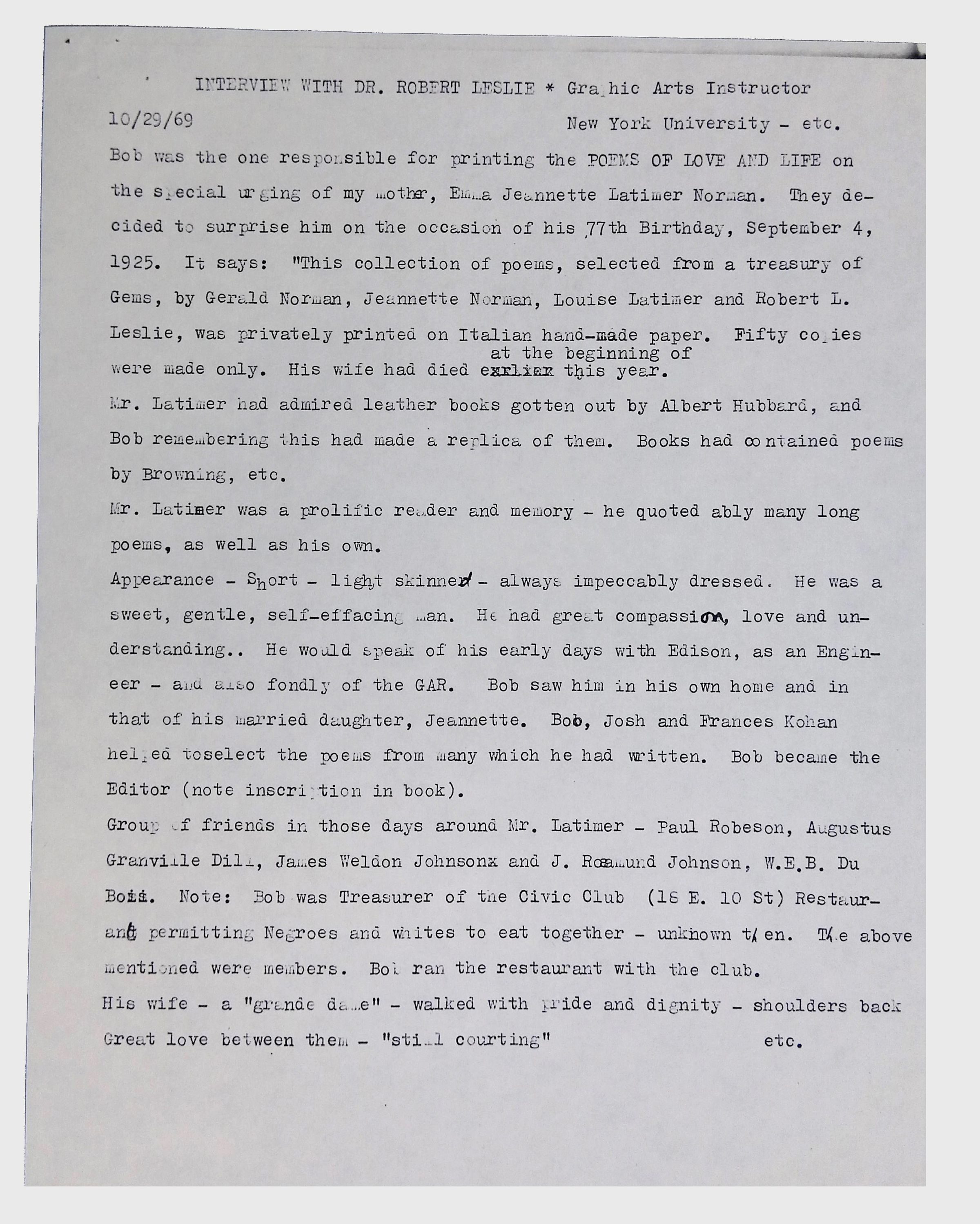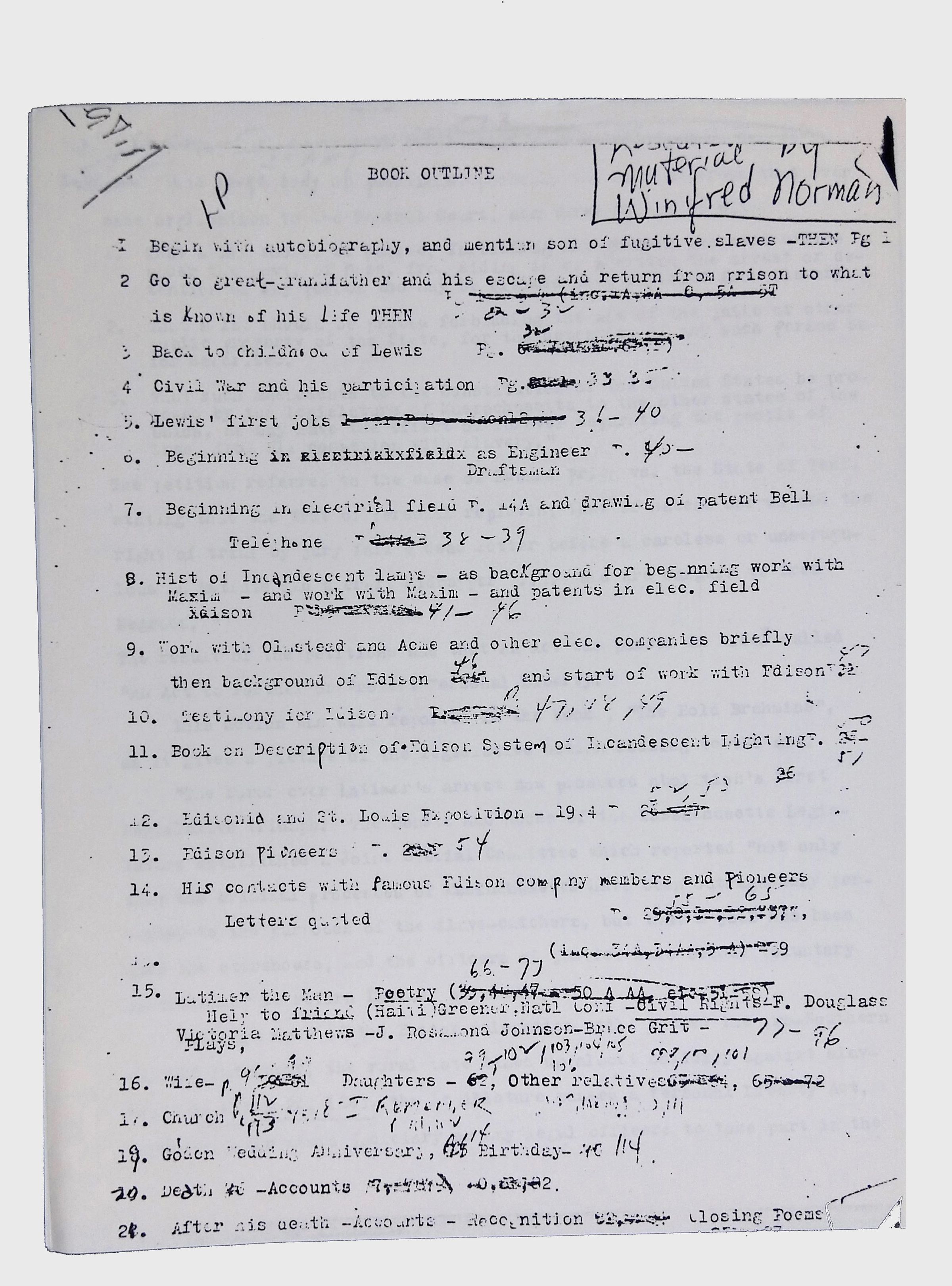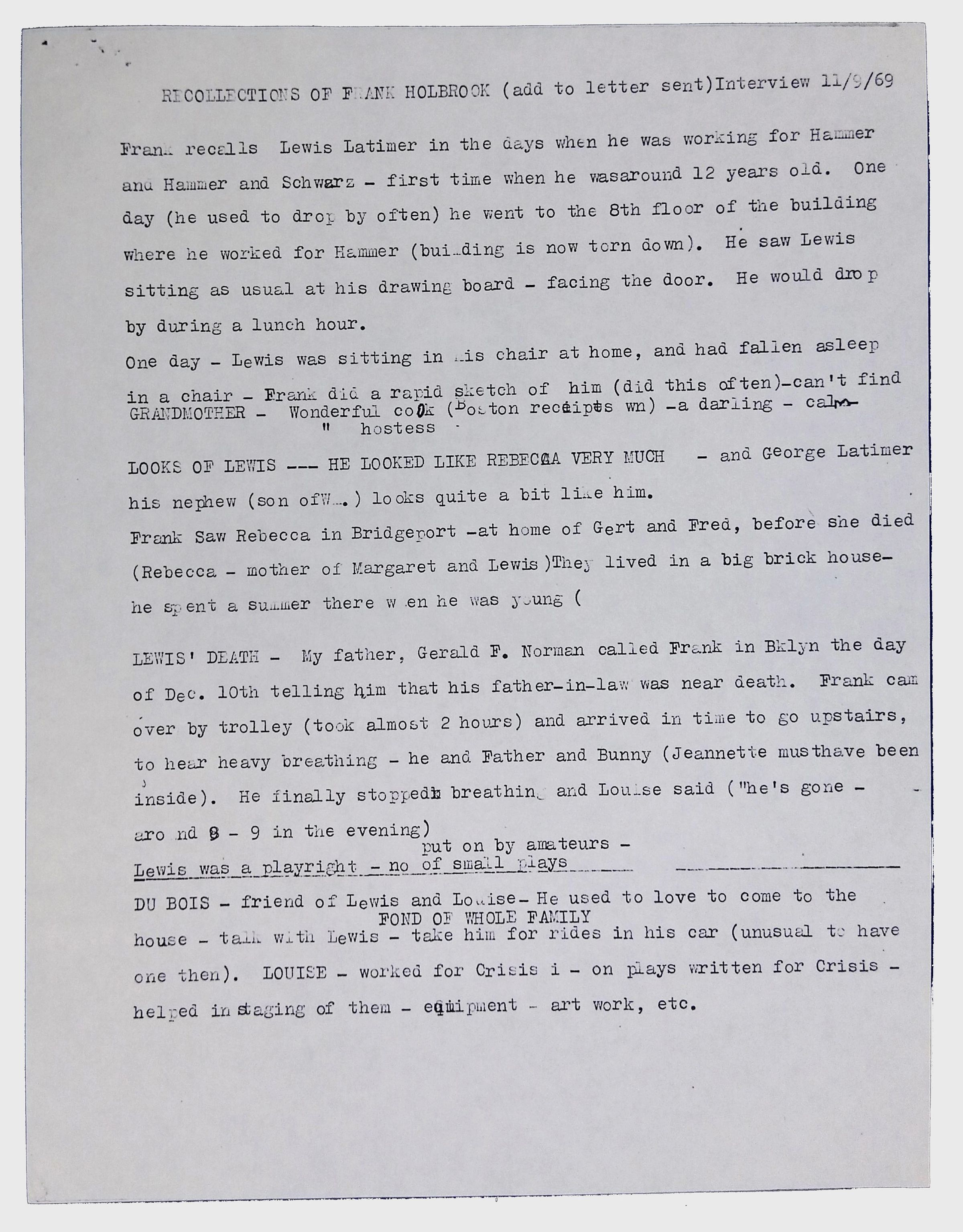 The folder includes important typescripts of interviews about the Latimer family, inherited family documents, and a Latimer family tree, all researched and compiled by Winifred Norman. Some of these documents are unique in the historical and biographical details they provide about Lewis Latimer’s career and family life.Context