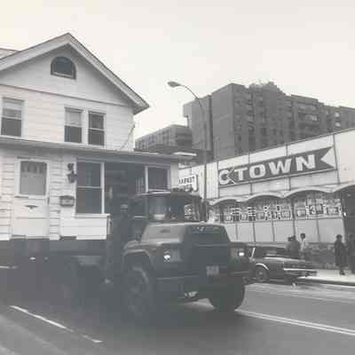 2: This image documents the moving of the historic Lewis Latimer House to its new location for preservation.