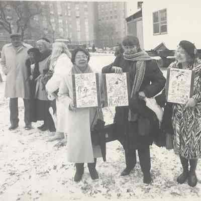 Image 3: A group of individuals standing in the snow, holding illustrated signs, possibly advocating for the house’s preservation.