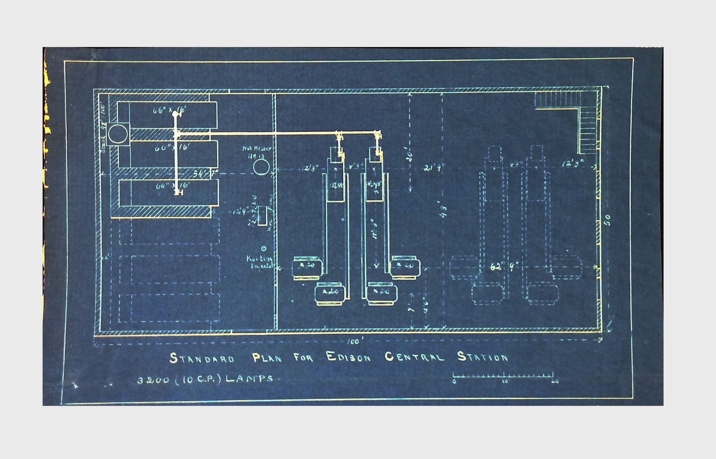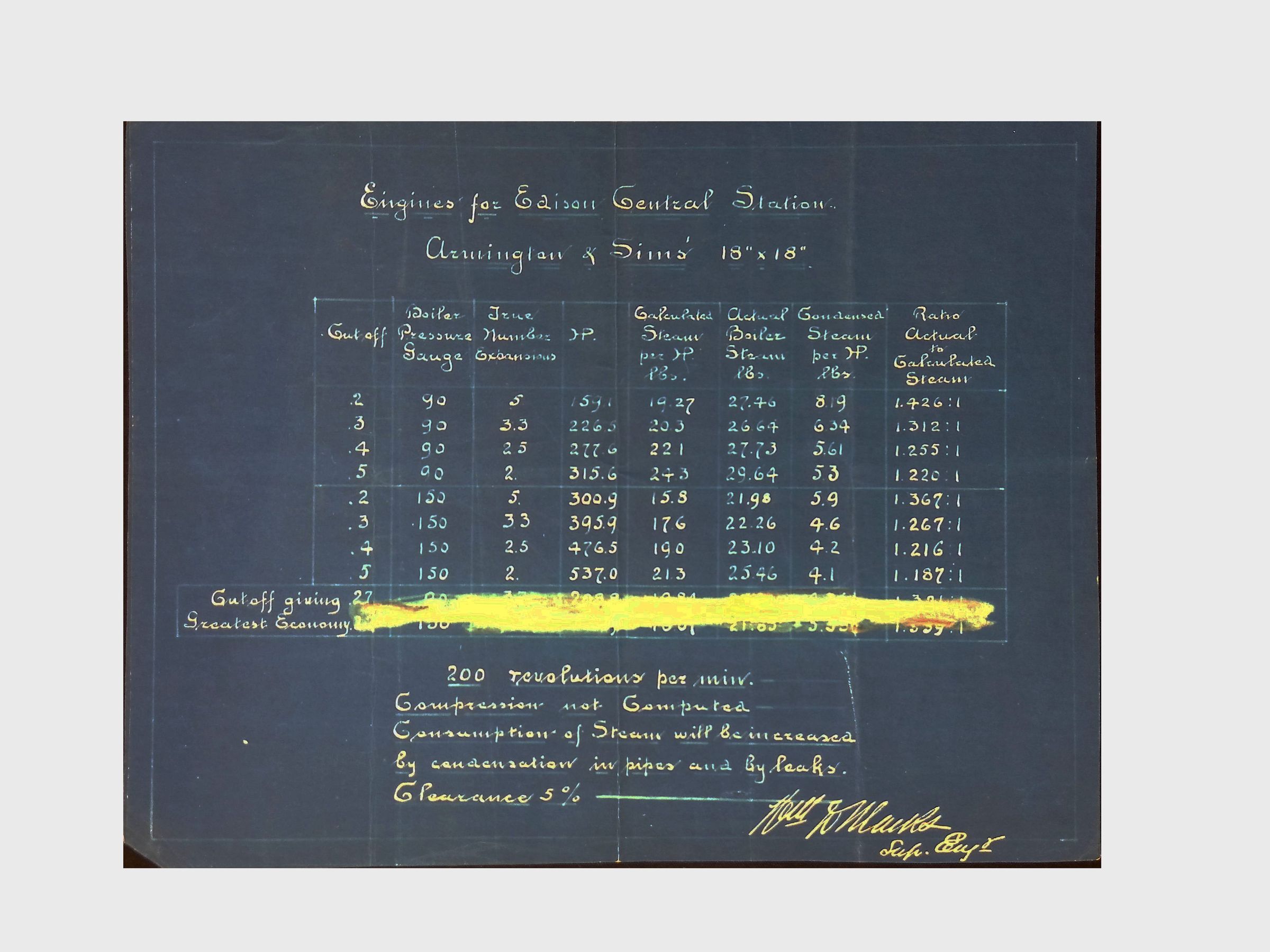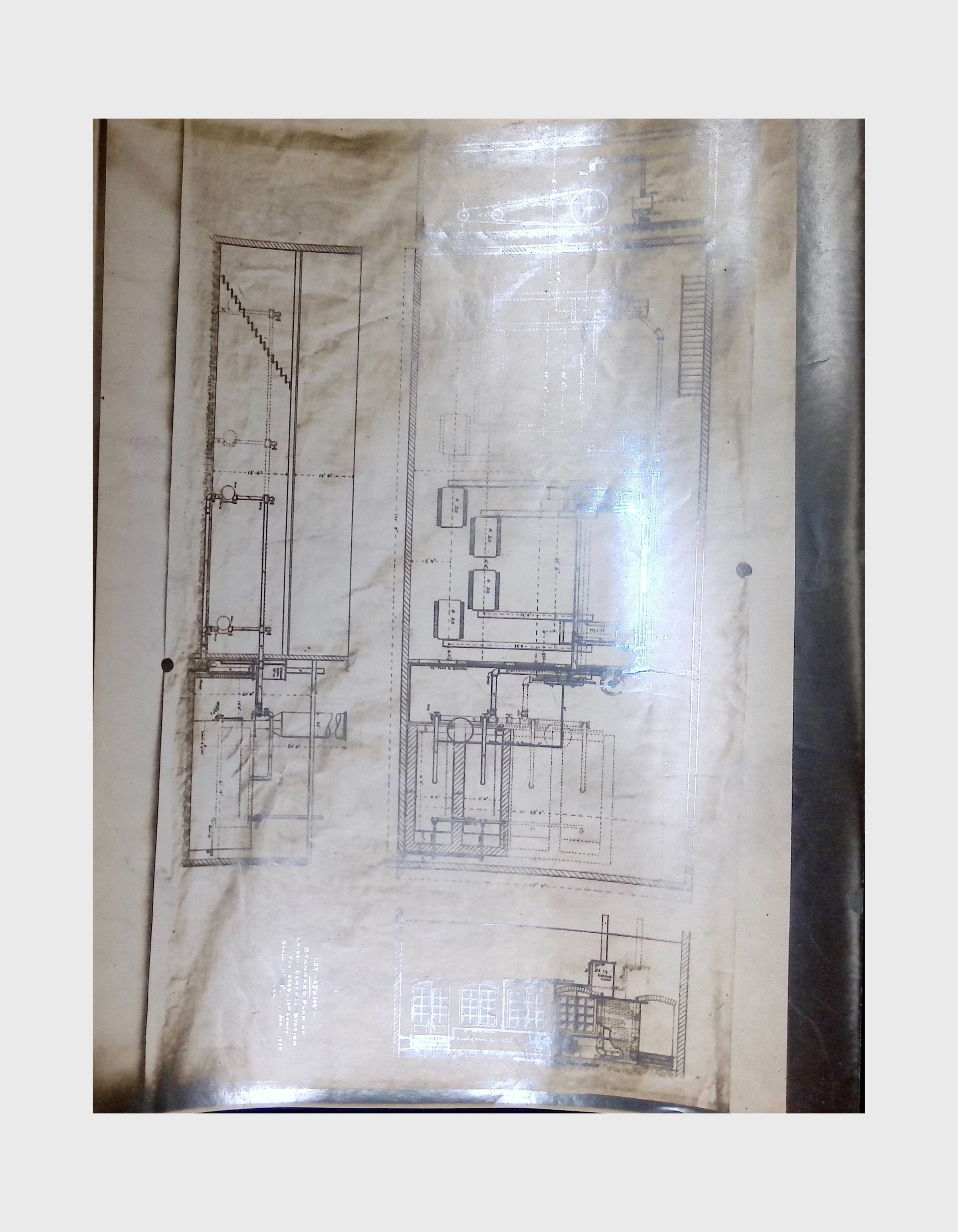 Blueprints and a photostat relating to the “Edison Central Station,” probably referring to Edison’s commercial power plant built on Pearl Street in New York City in 1882. One of the blueprints bears the date “Feb. 1889,” while another blueprint refers to Armington & Sims, the firm whose coal-fired steam engines powered the Pearl Street plant’s six dynamos. Index pages with handwritten or typed labels, possibly cataloging the documents. Blueprint tables and calculations detailing machine capacities, dimensions, and operational parameters. Schematics of electrical systems, illustrating configurations for electrical circuits and mechanical components. Handwritten or printed tables listing data, possibly performance metrics for electrical machinery. Large-format engineering diagrams, some rolled or folded, indicating oversized technical schematics used in industrial settings.Context