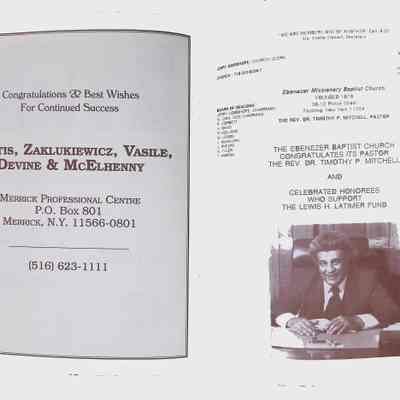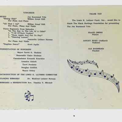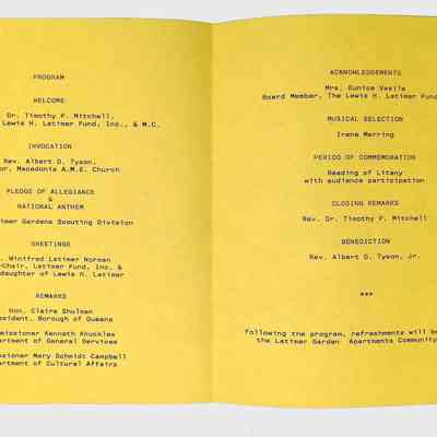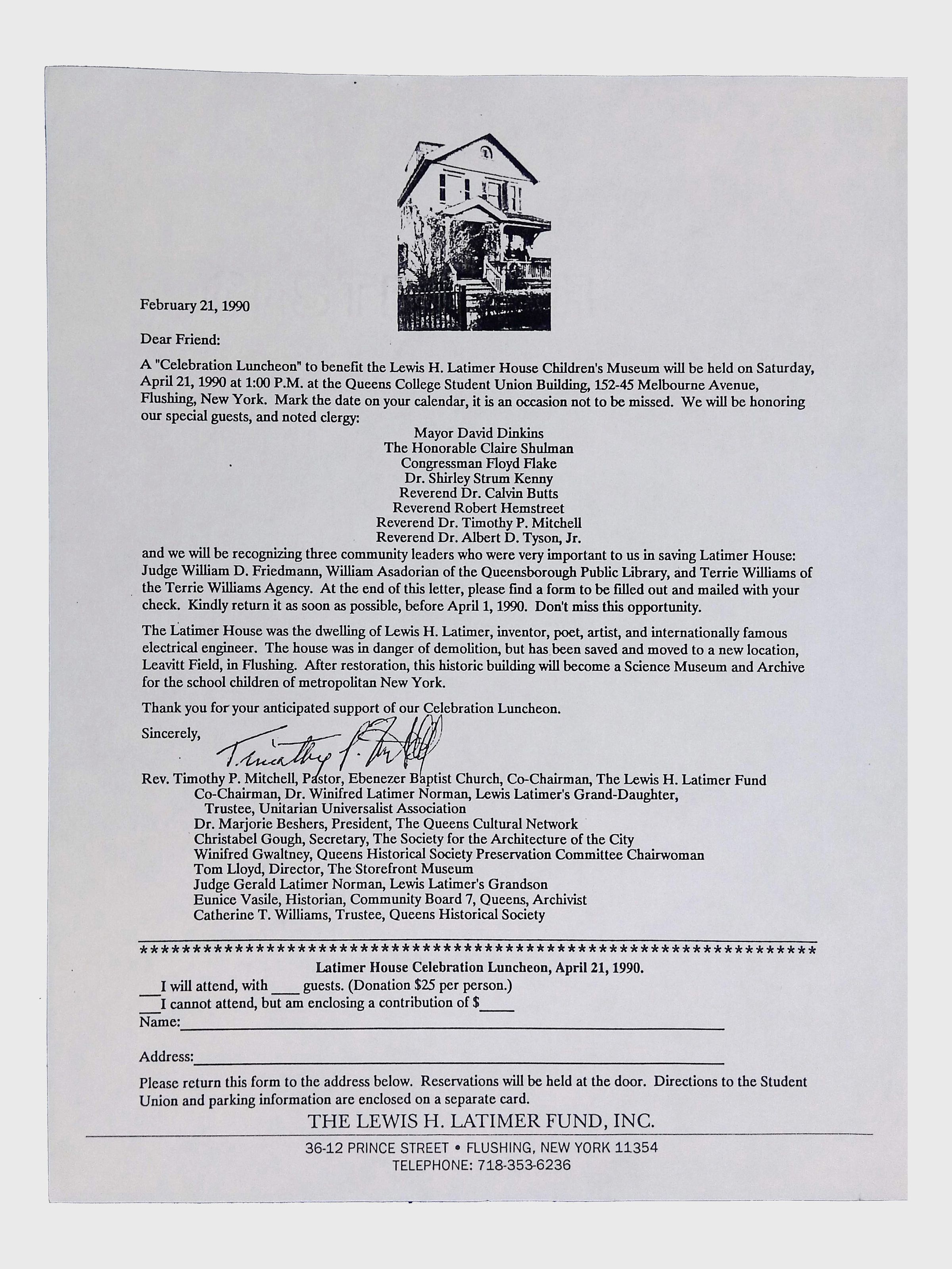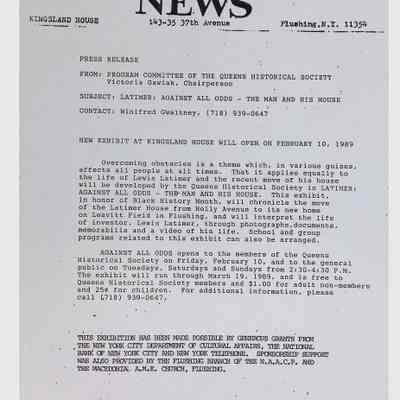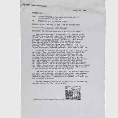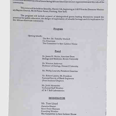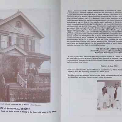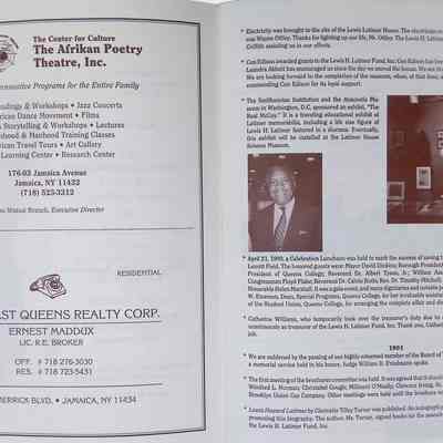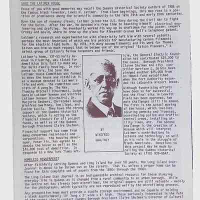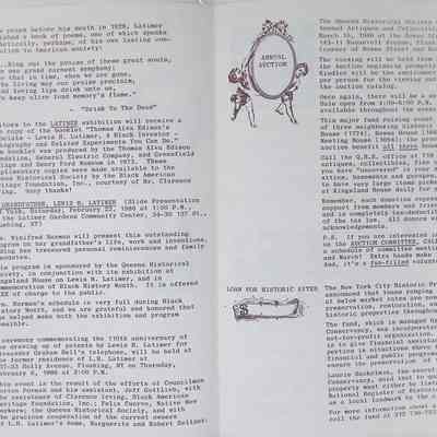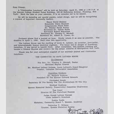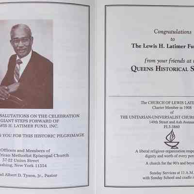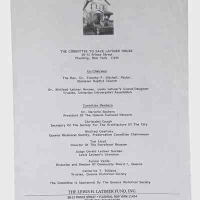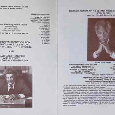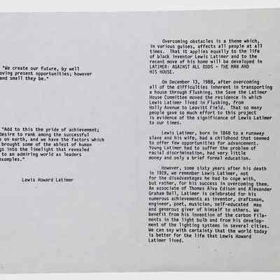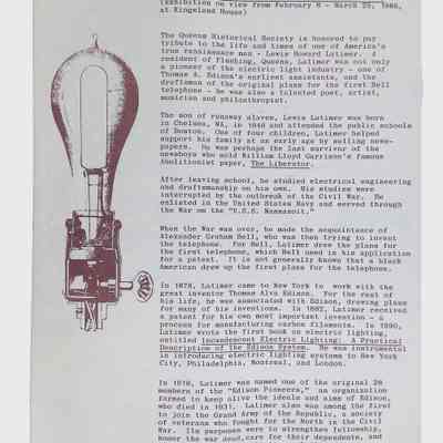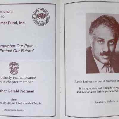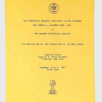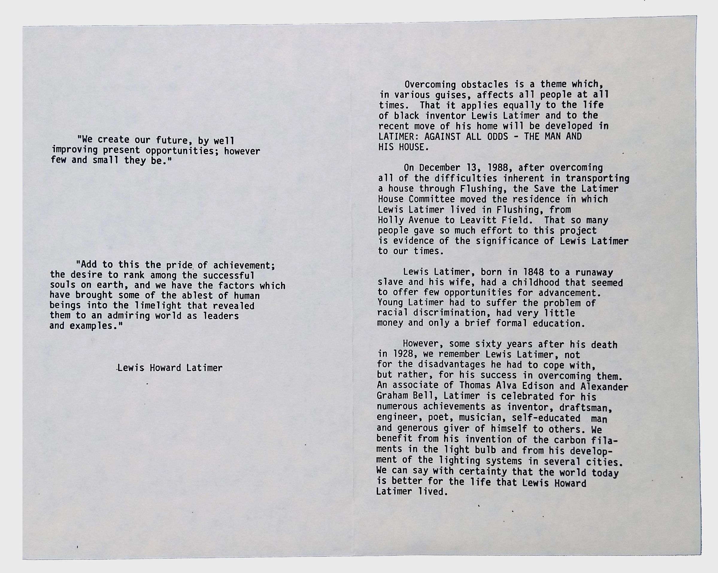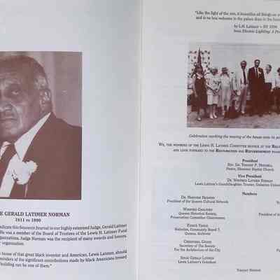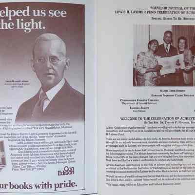 A collection of event programs, community outreach materials, and historical overviews celebrating the legacy of Lewis H. Latimer generated by the Lewis Latimer Fund, Inc. during the 1990s. Among those pictured or mentioned at Lewis Latimer’s grandchildren Winifred Norman and Gerald L. Norman, New York City Mayor David Dinkins, and Queens Borough President Claire Shulman..Context