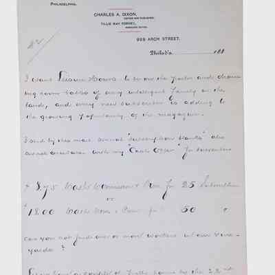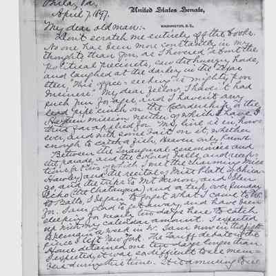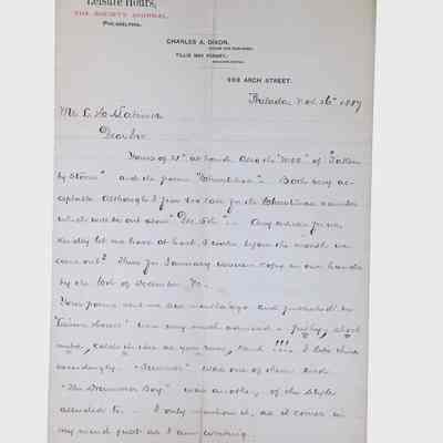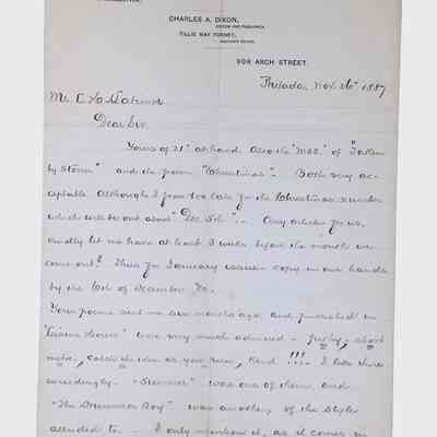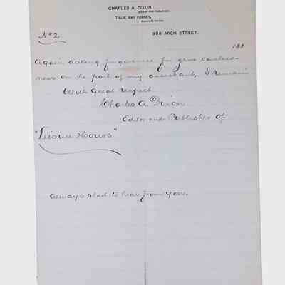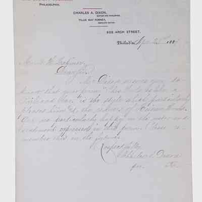 Includes miscellaneous letters, including correspondence relating to Latimer’s book on electricity (1890), a letter from his friend the Black activist and diplomat Richard T. Greener, a letter from Latimer’s acquaintance the African American missionary in Haiti, James Theodore Holly, a note from his friend John F. Randolph writing from Thomas Edison’s lab in [West] Orange, New Jersey, and several letters from staff at the Philadelphia magazine Leisure Hours relating to poetry Latimer had submitted for publication. Some letters feature handwritten annotations and official stamps.Context