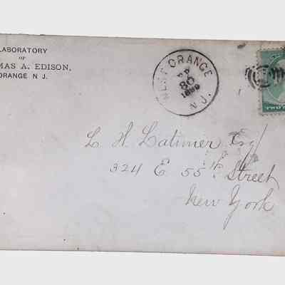 A letter from John F. Randolph, Lewis Latimer’s friend and former colleague, written from Thomas Edison’s laboratory at Orange [today West Orange], New Jersey, dated July 29th, 1889, with envelope. Randolph was working on site with Edison, while Latimer worked in one of Edison’s New York City offices. Writing in response to a letter and poem that Latimer had recently sent him, Randolph reports that “after reading the poem I handed same to Mr. Edison and he read it over very carefully and said it was d—m [i.e., damn] good.”Subject