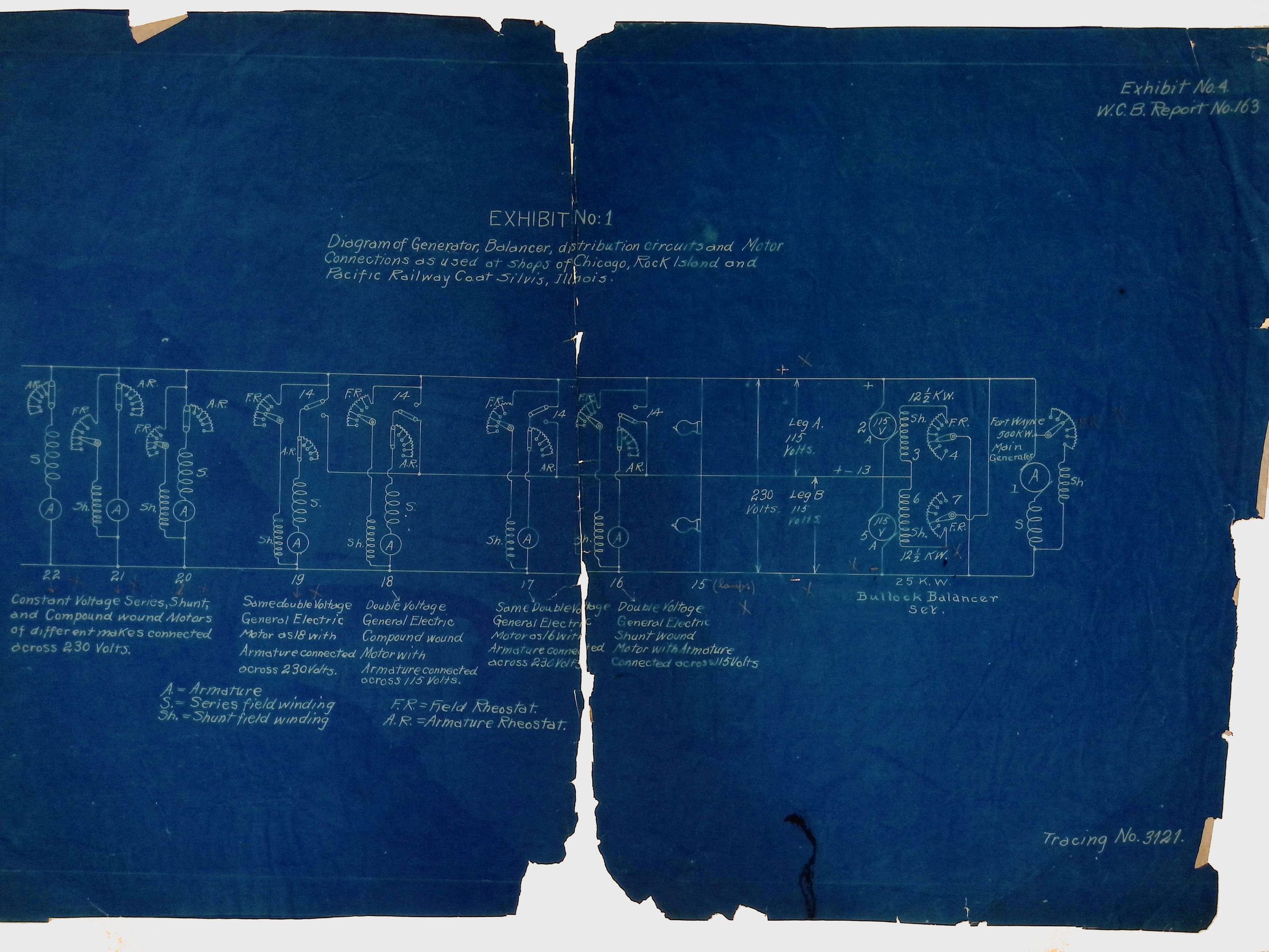 This document is part of Exhibit No. 1, referenced in W.C.B. Report No. 163. It details the electrical systems used at the Chicago, Rock Island & Pacific Railway Co. Shops in Silvis, Illinois. The schematic shows a Bullock Balancer Set, generator, and motor connections, providing insight into early railway electrical engineering and power distribution.Collection