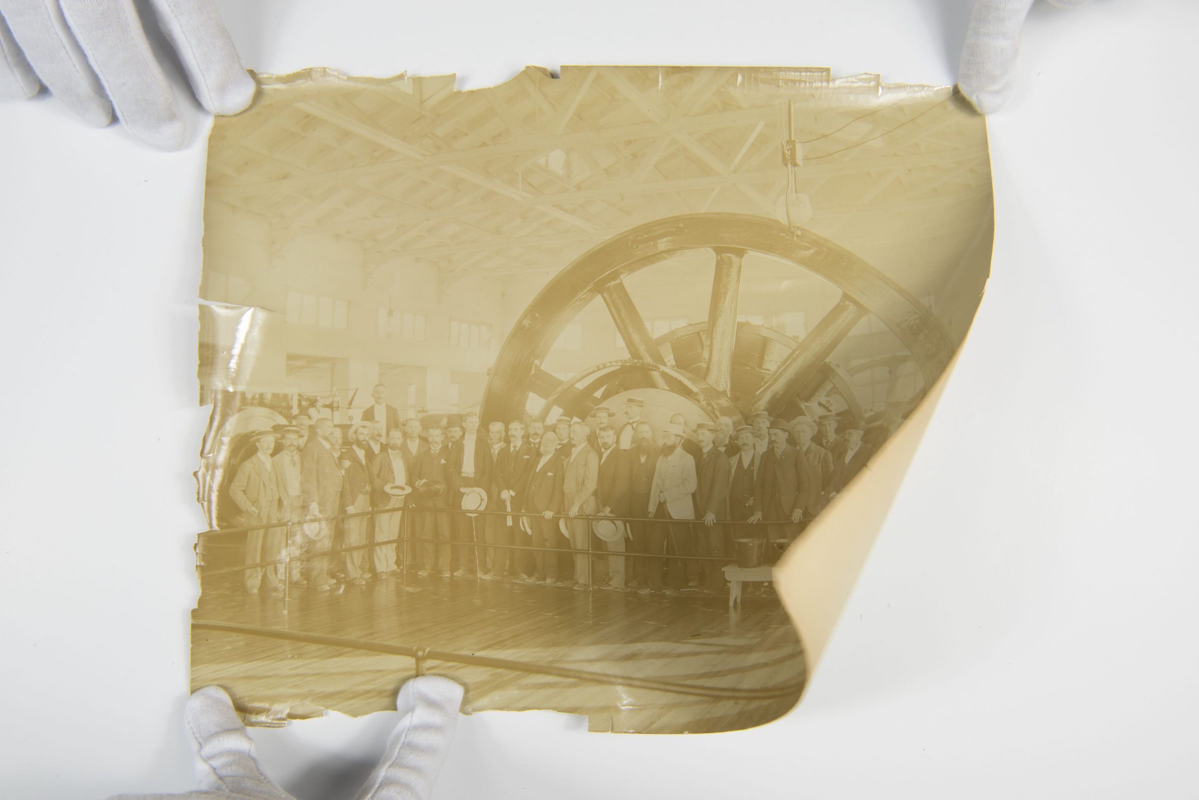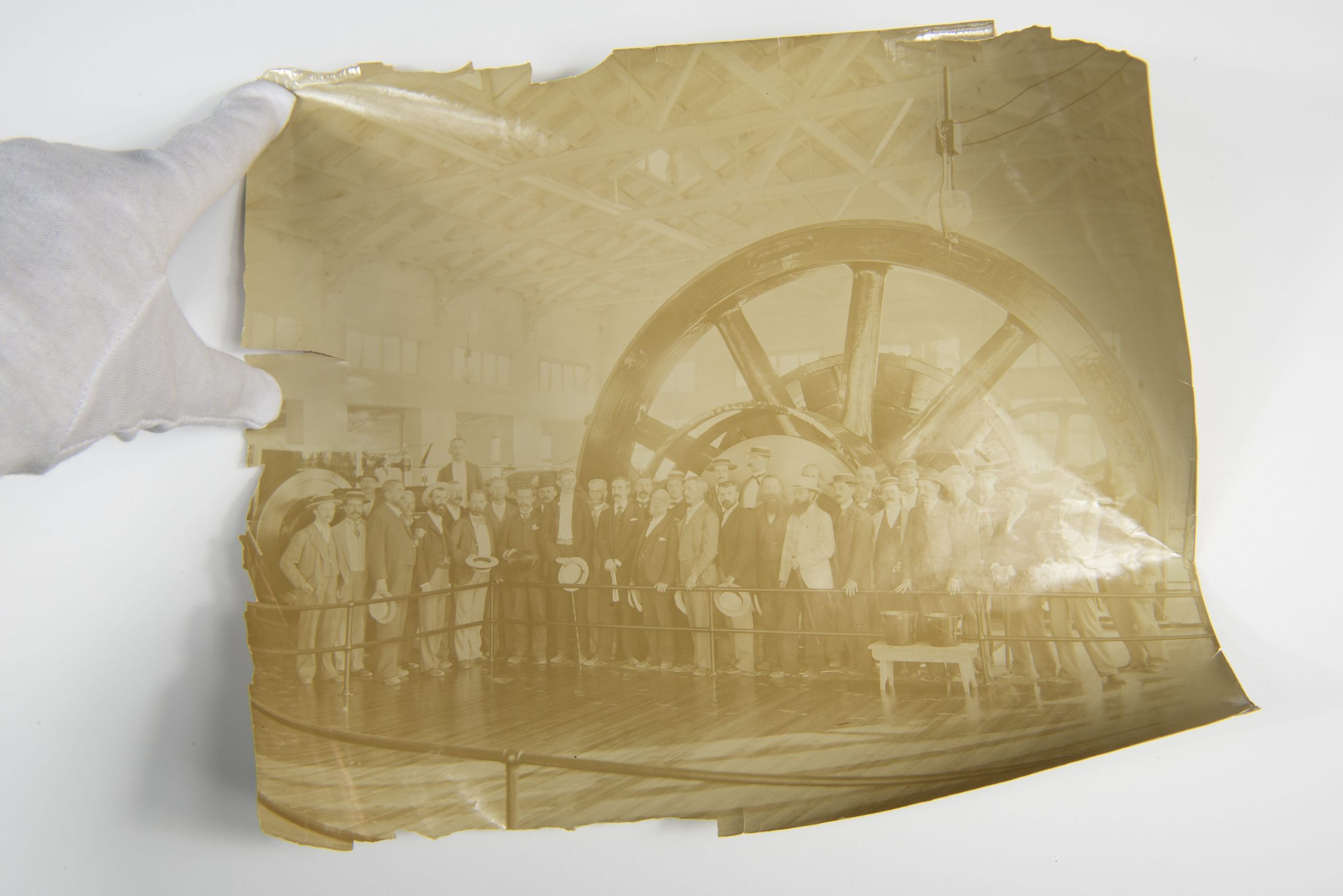 A gloved hand is carefully handling the fragile and damaged edges of the photograph, indicating its archival preservation process.Context