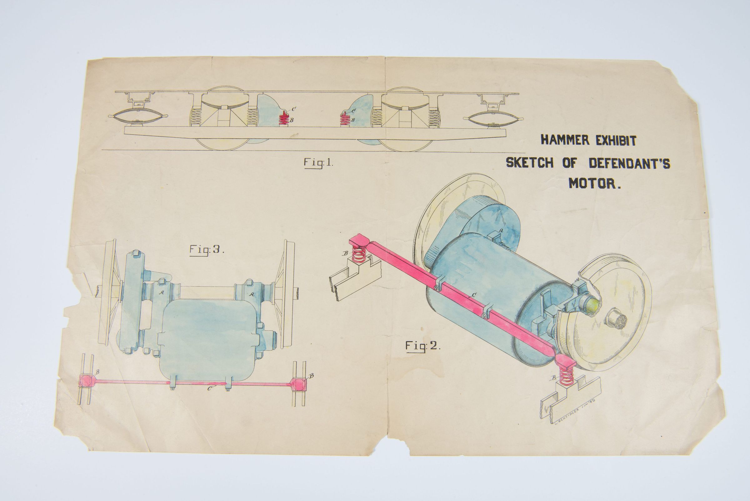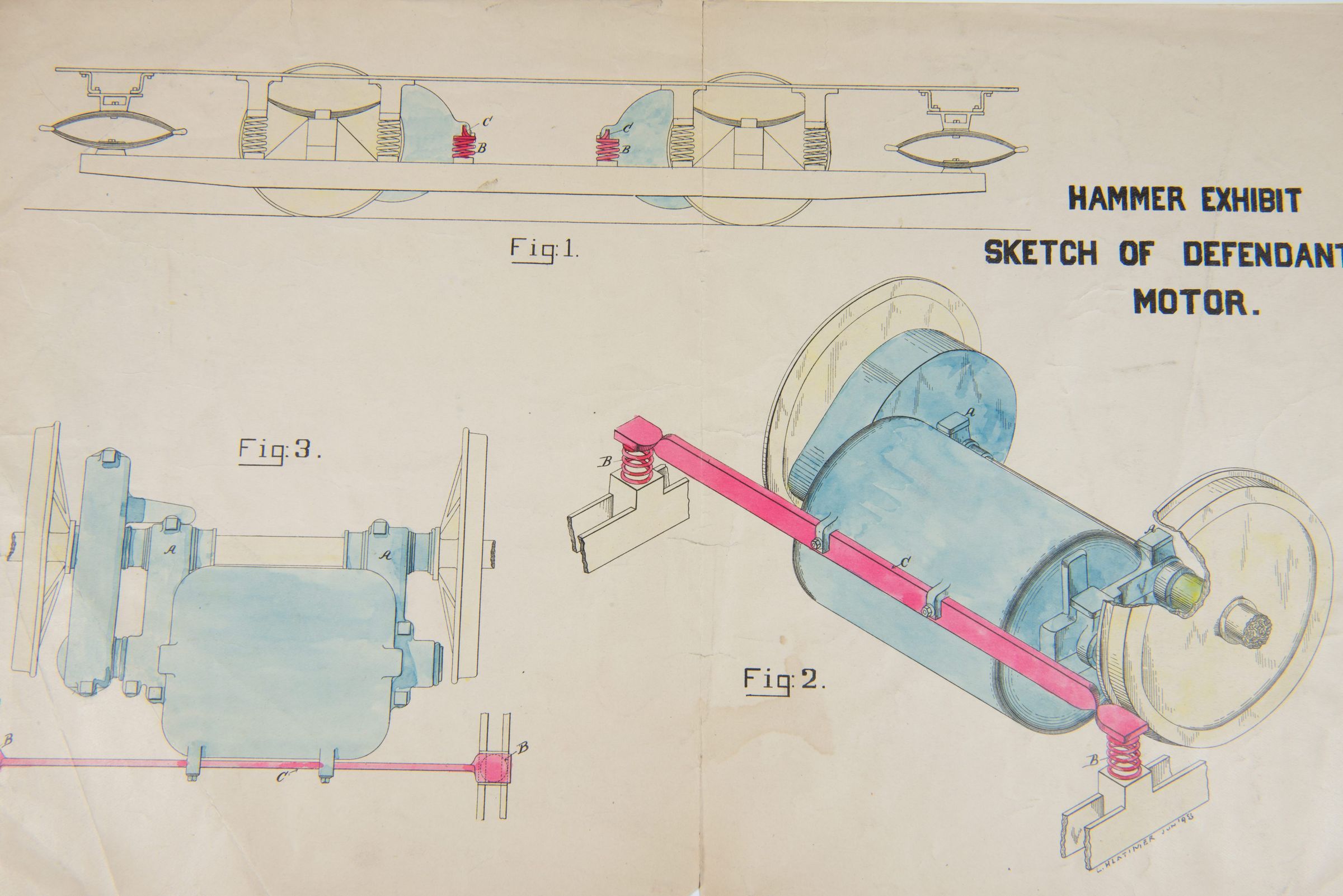 The heading "Hammer Exhibit – Sketch of Defendant’s Motor" suggests that this diagram was used in a court case or patent litigation related to electrical or mechanical engineering. Given that Lewis H. Latimer was instrumental in early electrical patents and worked on legal defenses for inventors, this exhibit could be linked to his expert testimony or patent defense work in the late 19th or early 20th century.Collection
