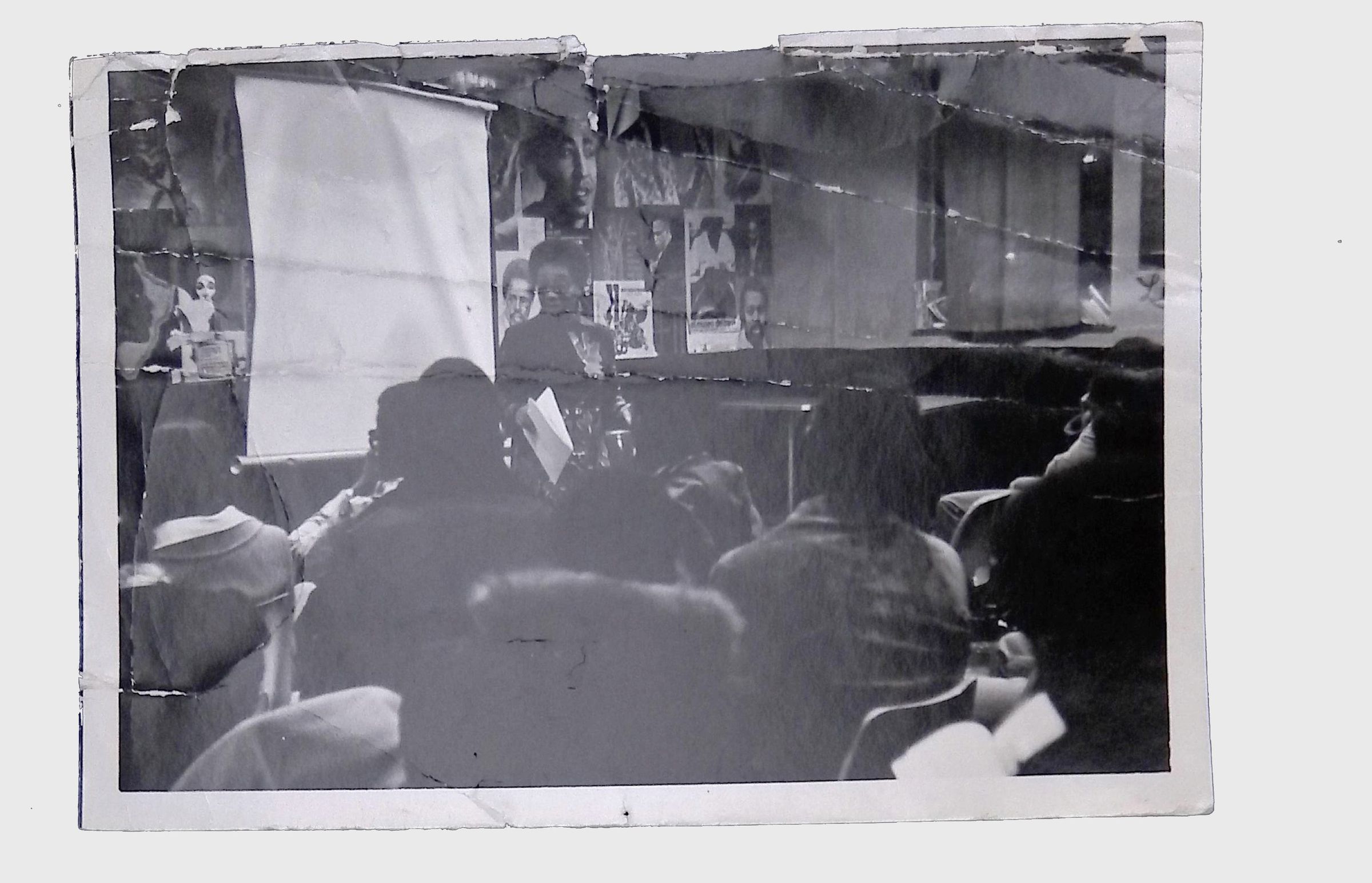 The folder includes multiple black-and-white photographs showing an indoor gathering. One image captures a person holding up a document, possibly reading or presenting it to an audience. Another image shows a seated crowd listening attentively. The backs of some photographs contain handwritten inscriptions, such as “Henry St. School,” suggesting a possible connection to an educational institution or community event. These images serve as historical records of a significant gathering related to Latimer’s impact or broader historical discussions.Photograph Details