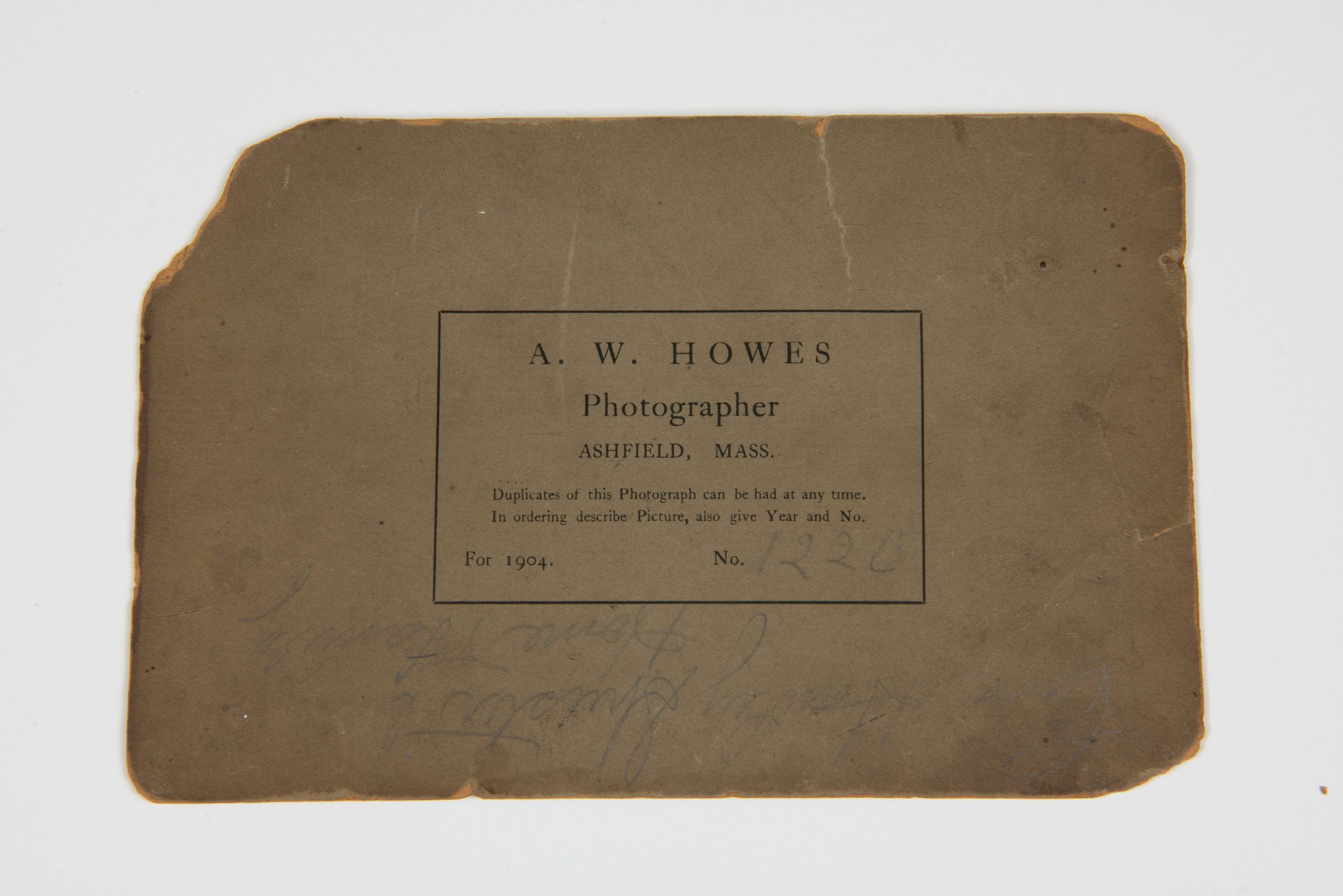 This photograph, taken by A.W. Howes in 1904, depicts a family home with children standing in the yard, capturing a slice of domestic life. The house has a front porch with a covered entrance, typical of the period's architectural style. The children, dressed in period attire, are posed naturally, adding a sense of warmth and nostalgia to the image. The back of the photograph bears the photographer’s stamp from Ashfield, Massachusetts, with instructions for ordering duplicates.Photograph Details