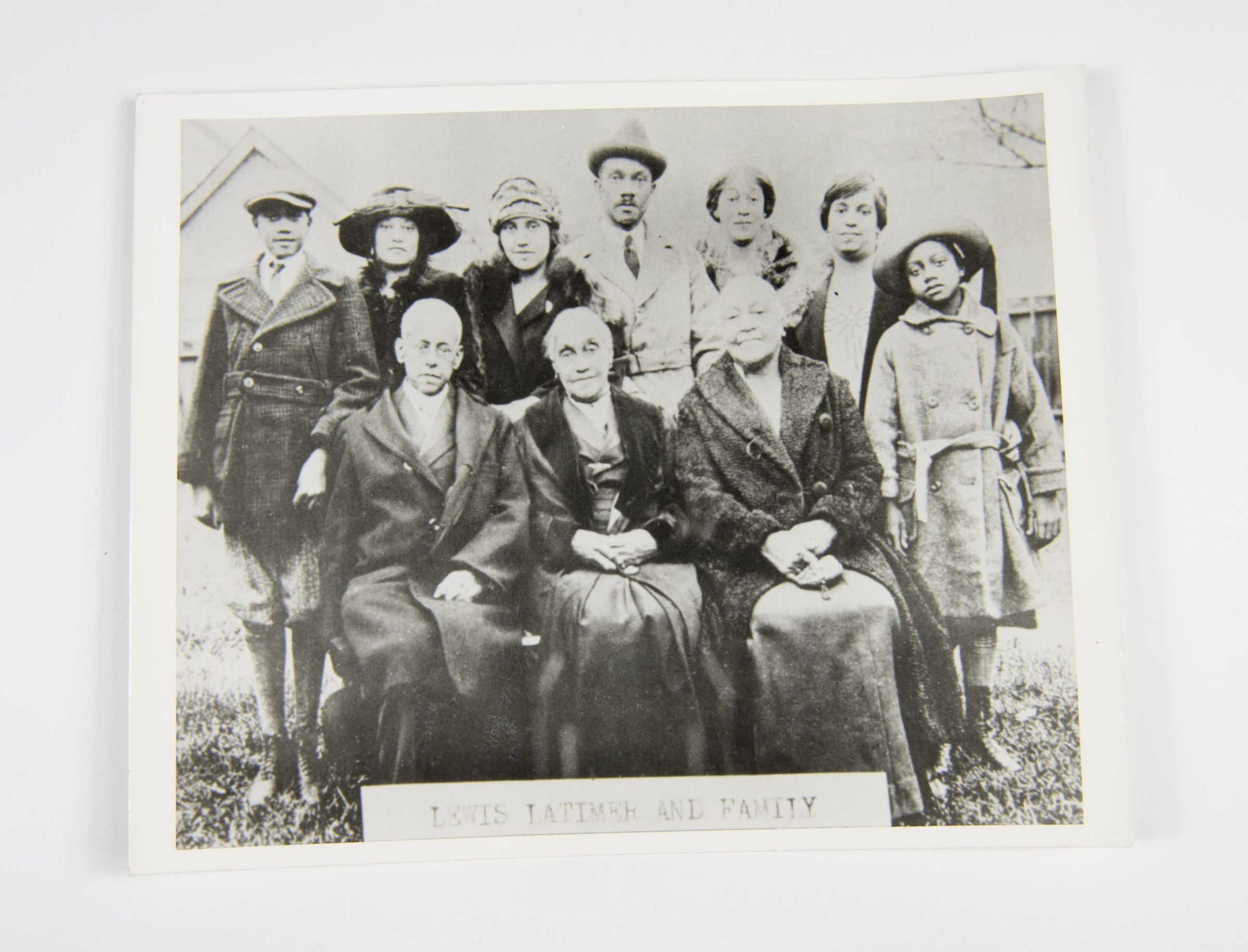 A black and white photograph showing multiple generations of the Latimer family posed outdoors. The image features Lewis H. Latimer seated in the front row with family members surrounding him. The attire suggests the late 1920s or early 1930s.Context
