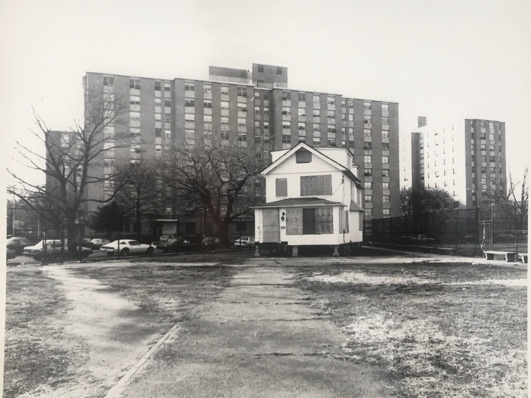 Image 1: A black-and-white photograph depicting a small house in front of large apartment buildings. The house appears to be boarded up, suggesting it was either abandoned or awaiting relocation.