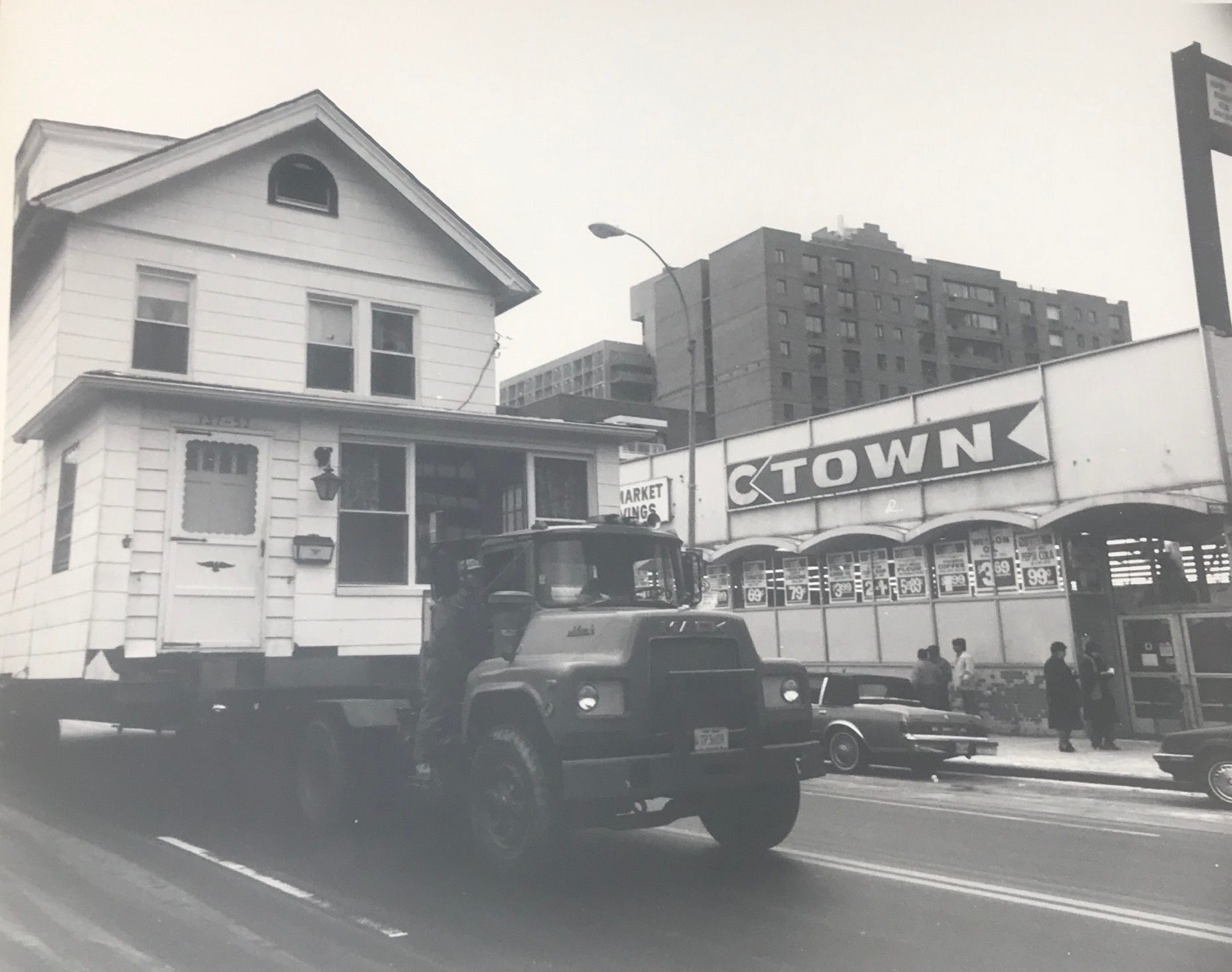 Image 2: A black-and-white photograph of a house being transported on a flatbed truck, passing a "C-Town" grocery store.