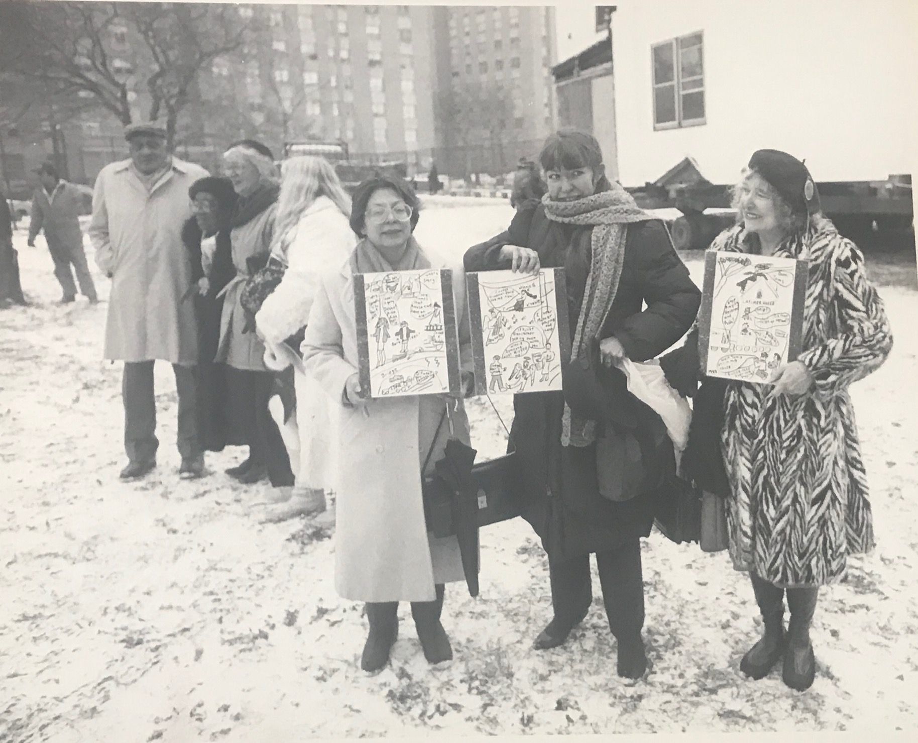 Image 3: A group of individuals standing in the snow, holding illustrated signs, possibly advocating for the house’s preservation.
