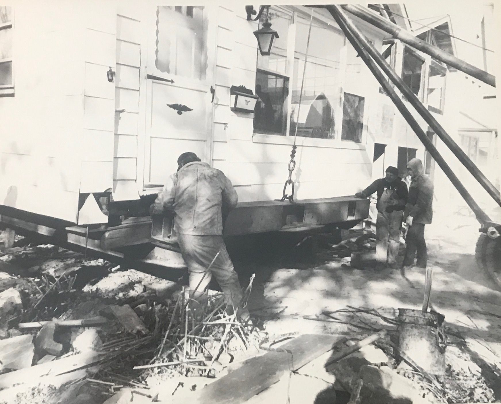 4: This image shows the final steps in relocating and securing the historic house in its new location.Collection