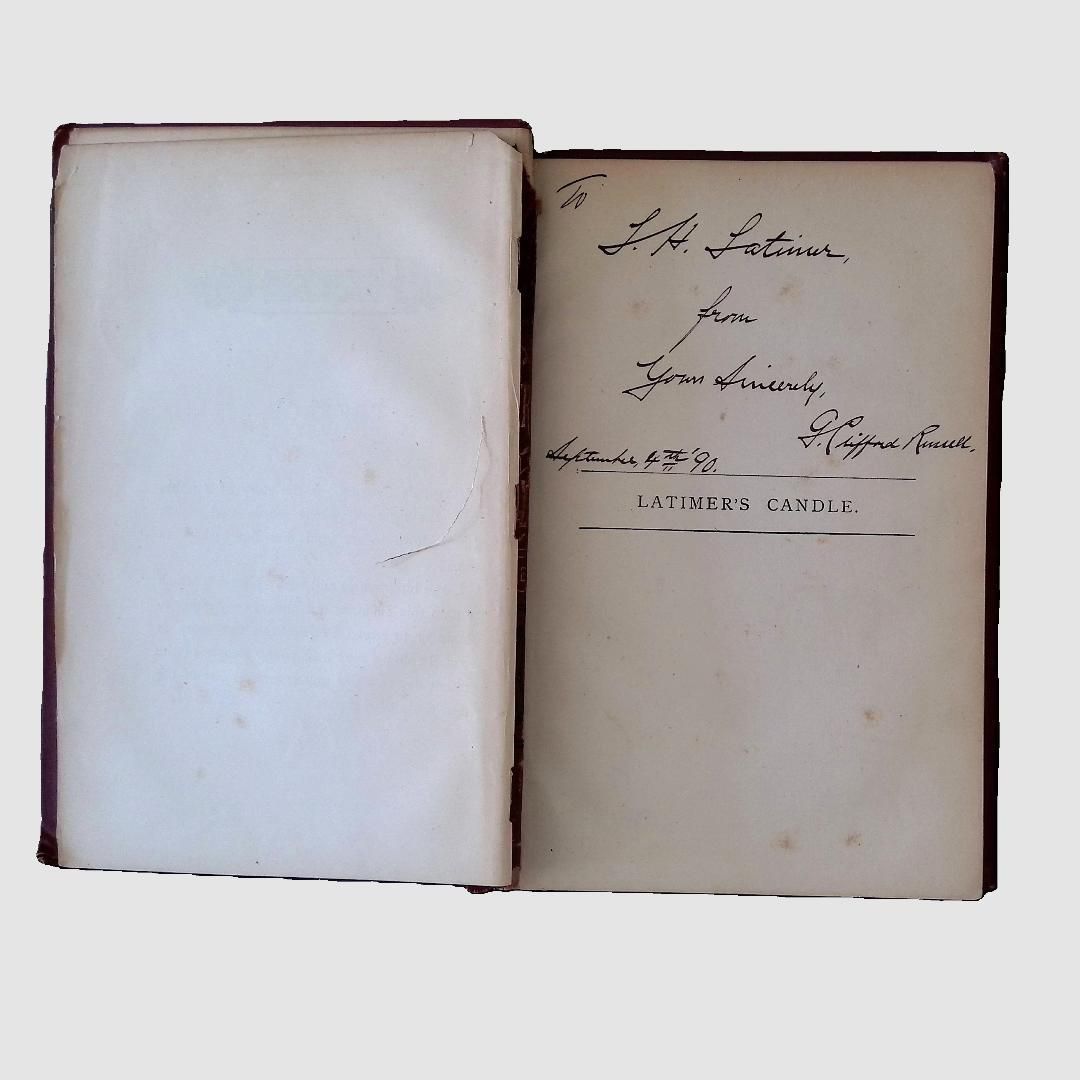 An inscription inside "Latimer's Candle" from G. Clifford Russell to S.H. Latimer, dated September 4, 1890, demonstrating its sentimental value and historical exchange.Language