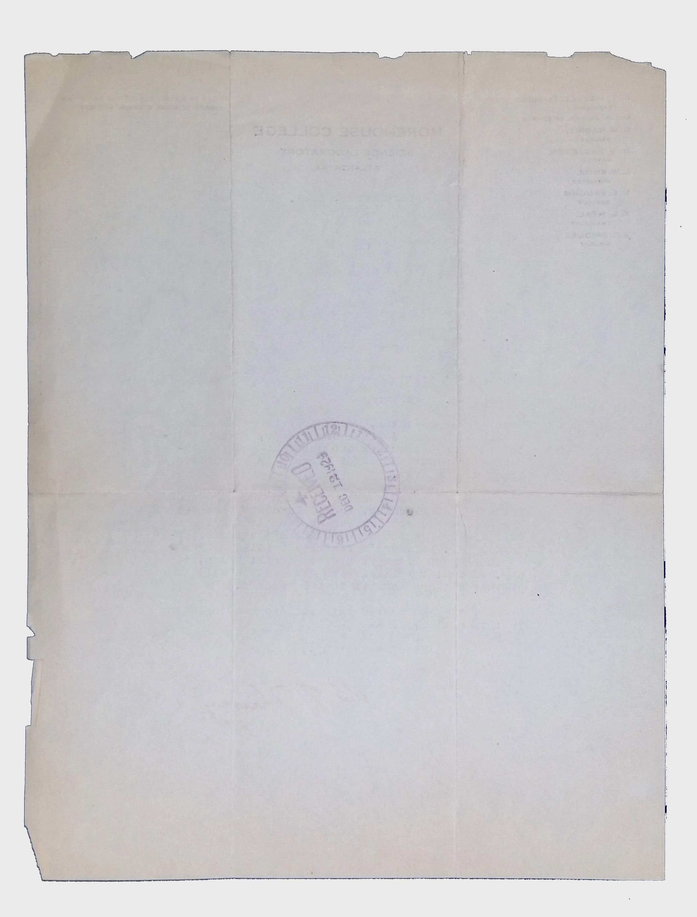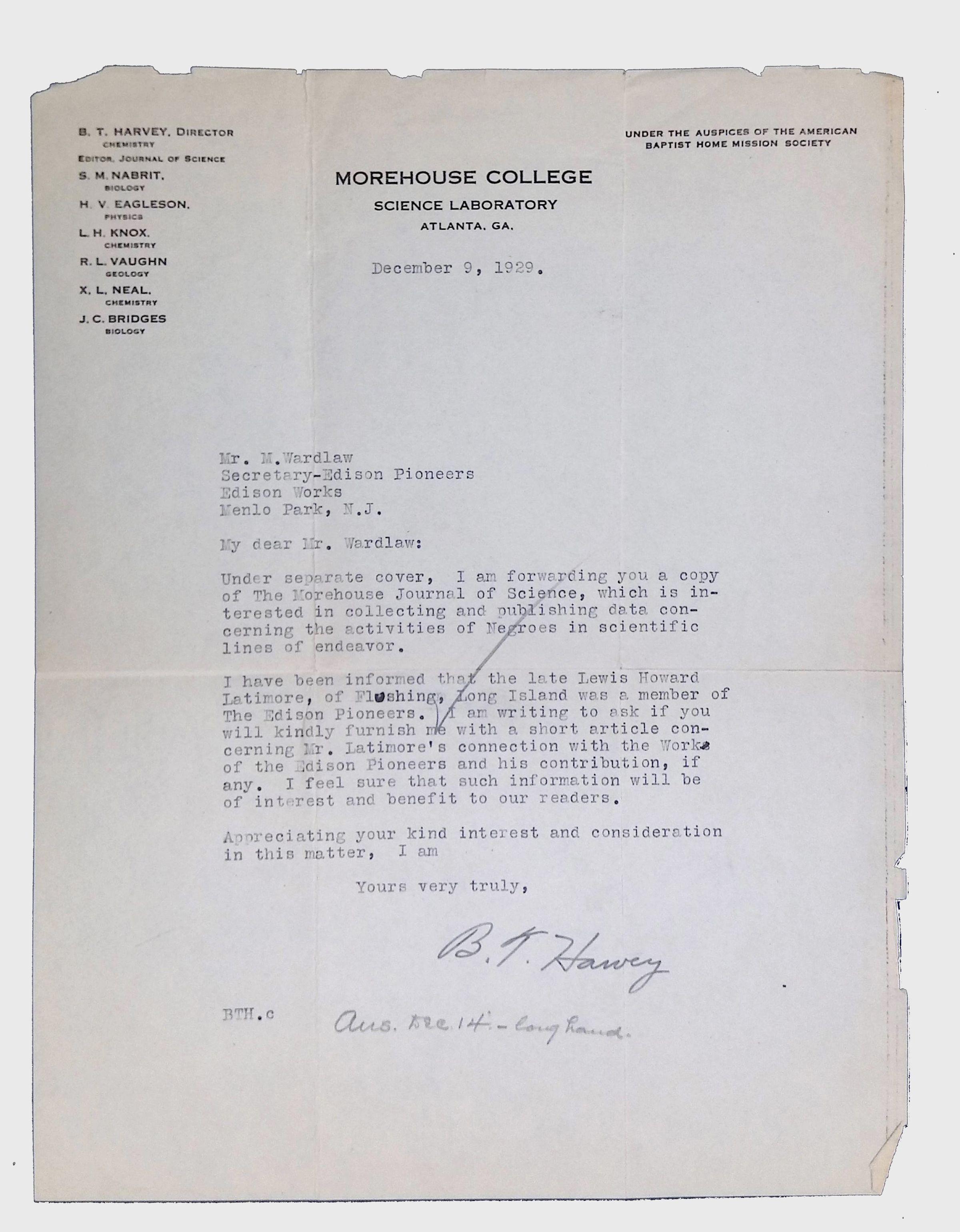 Dated December 9, 1929, this letter from B.T. Harvey, Director of the Science Laboratory at Morehouse College, is addressed to J. Wardlaw of Edison Pioneers. Harvey requests information regarding the contributions of Lewis Howard Latimer to Edison Pioneers for inclusion in The Morehouse Journal of Science. The letter reflects interest in documenting the role of African Americans in scientific fields and preserving Latimer's legacy within Morehouse College’s scientific records.Collection