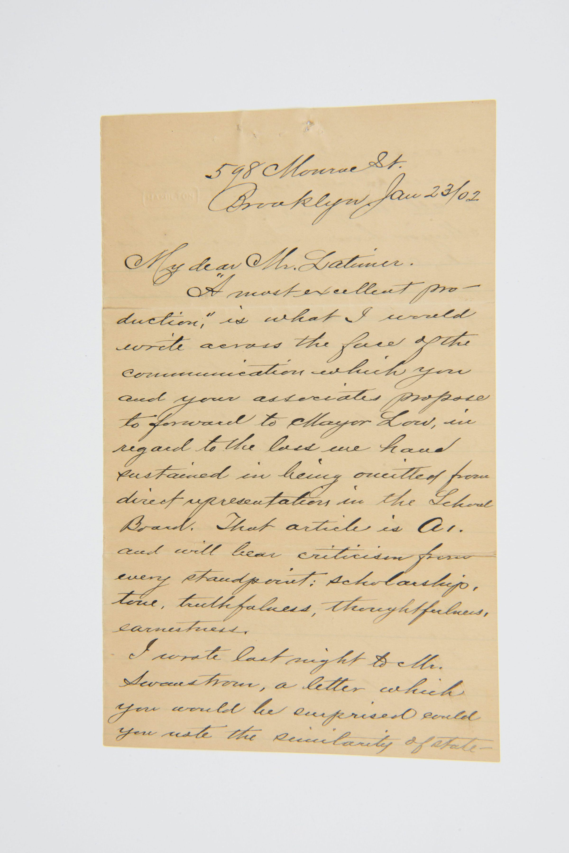 Page 1: 598 Monroe St. Brooklyn, Jan 23 / 02 My dear Mr. Latimer, A most excellent "production" is what I would write across the face of the communication which you and your associates propose to forward to Mayor Low, in regard to the loss we have sustained in being omitted from direct representation in the School Board. That article is A1, and will bear criticism from every standpoint; scholarship, tone, truthfulness, thoughtfulness, earnestness. I wrote last night to Mr. Swanstrom, a letter which you would be surprised could you note the similarity of state-