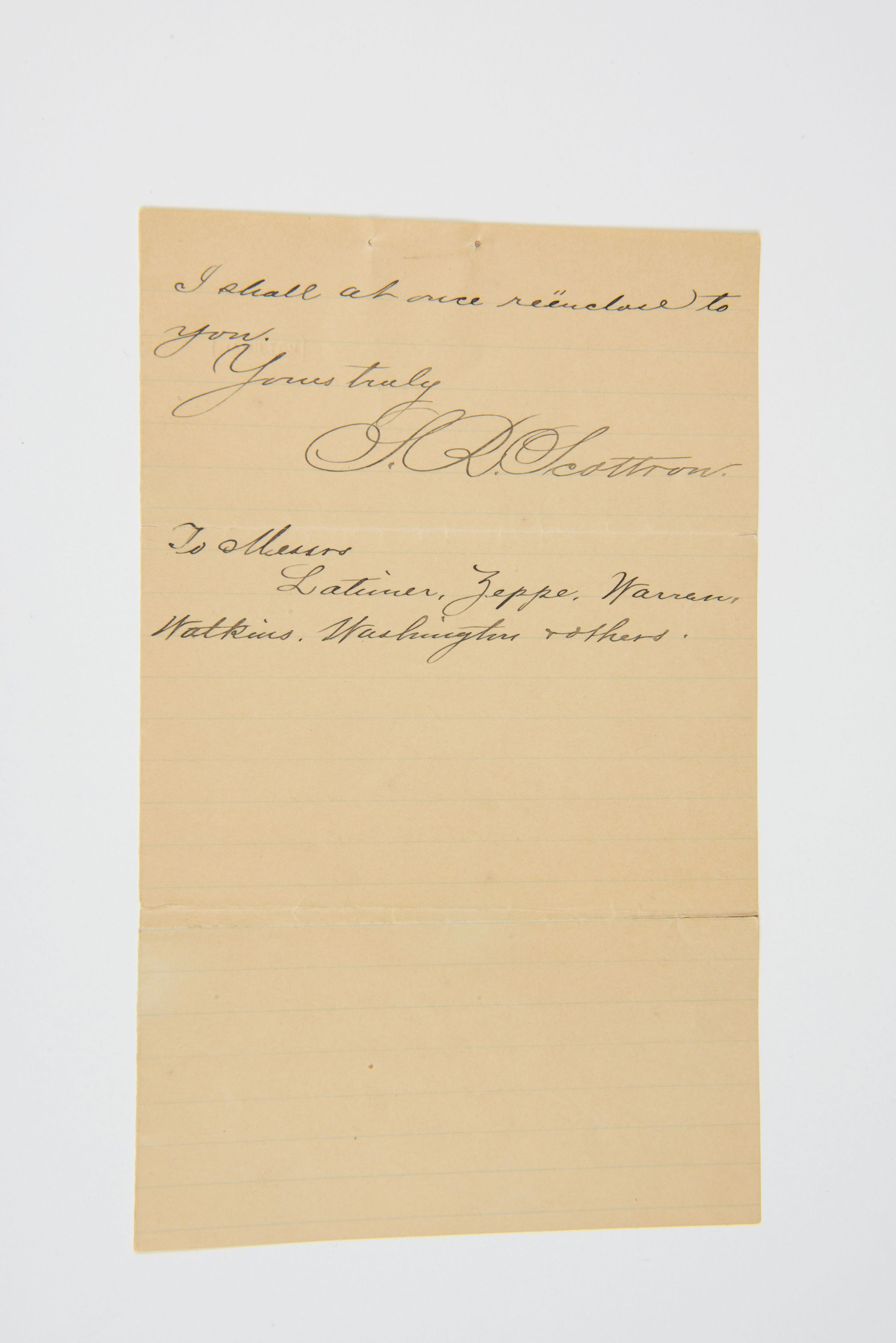 Page 3: I shall at once re-enclose to you. Yours truly, S. R. Scottron To Messrs Latimer, Zeppe, Warren, Watkins, Washington & others.