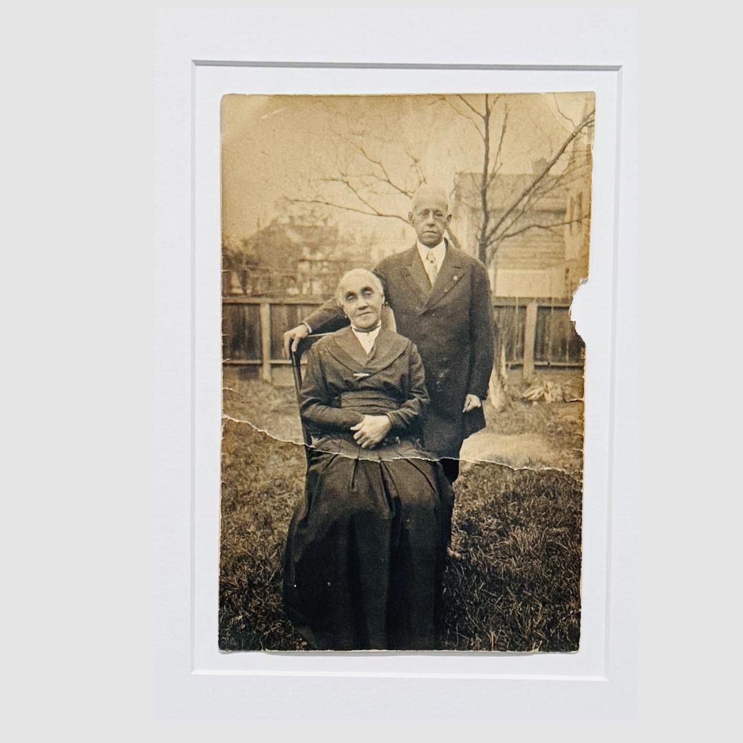 A vintage photograph of Lewis H. Latimer standing beside his seated wife, Mary Latimer, captured outdoors with a backdrop of trees and historic homes. The photo, though aged and slightly torn, portrays the enduring bond of the couple. The image is carefully framed to preserve its historical value.