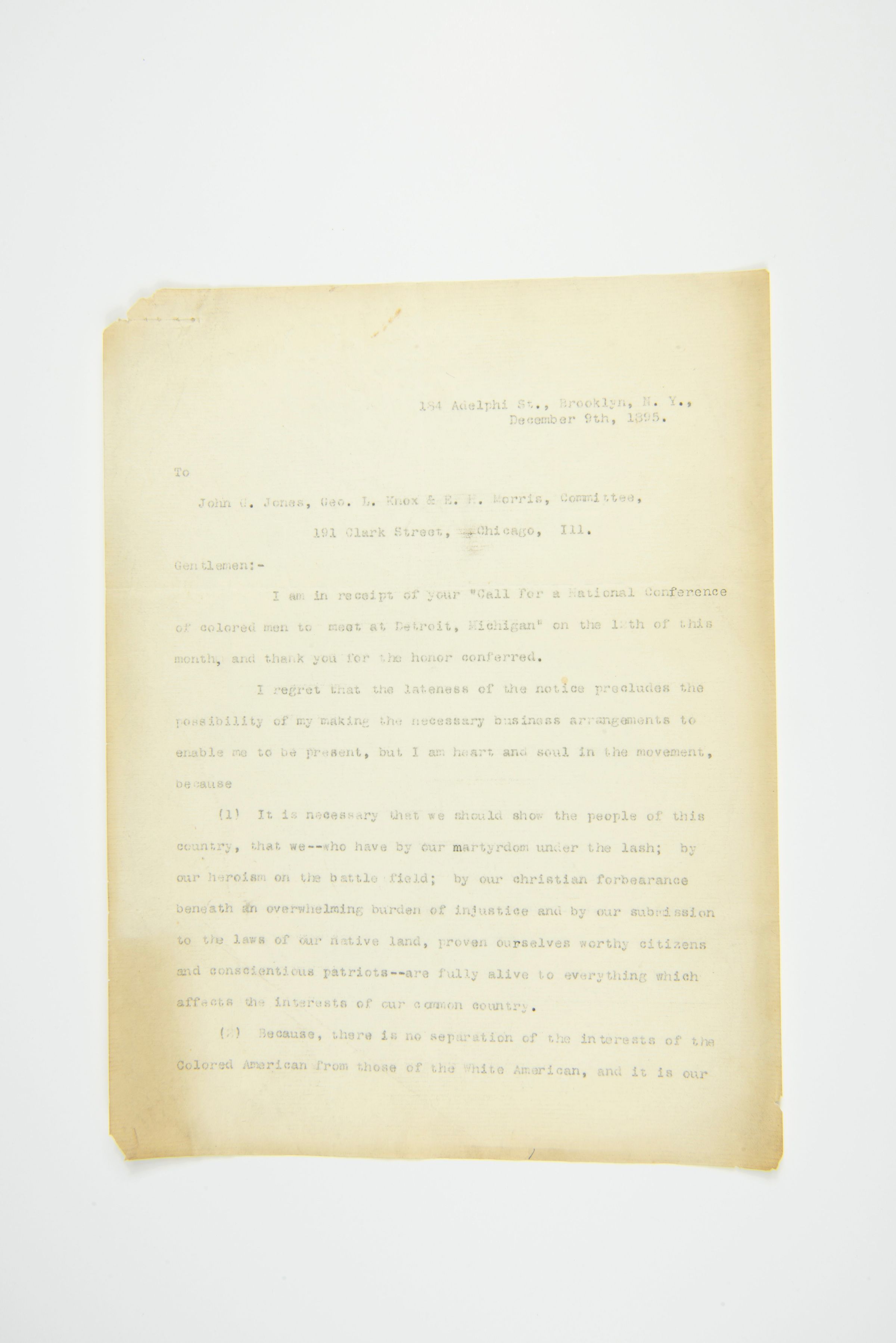Page 1: 184 Adelphi St., Brooklyn, N.Y. December 9th, 1895 To John G. Jones, Geo. L. Knox & E. H. Morris, Committee, 191 Clark Street, Chicago, Ill. Gentlemen:— I am in receipt of your “Call for a National Conference of colored men to meet at Detroit, Michigan” on the 12th of this month, and thank you for the honor conferred. I regret that the lateness of the notice precludes the possibility of my making the necessary business arrangements to enable me to be present, but I am heart and soul in the movement, because—