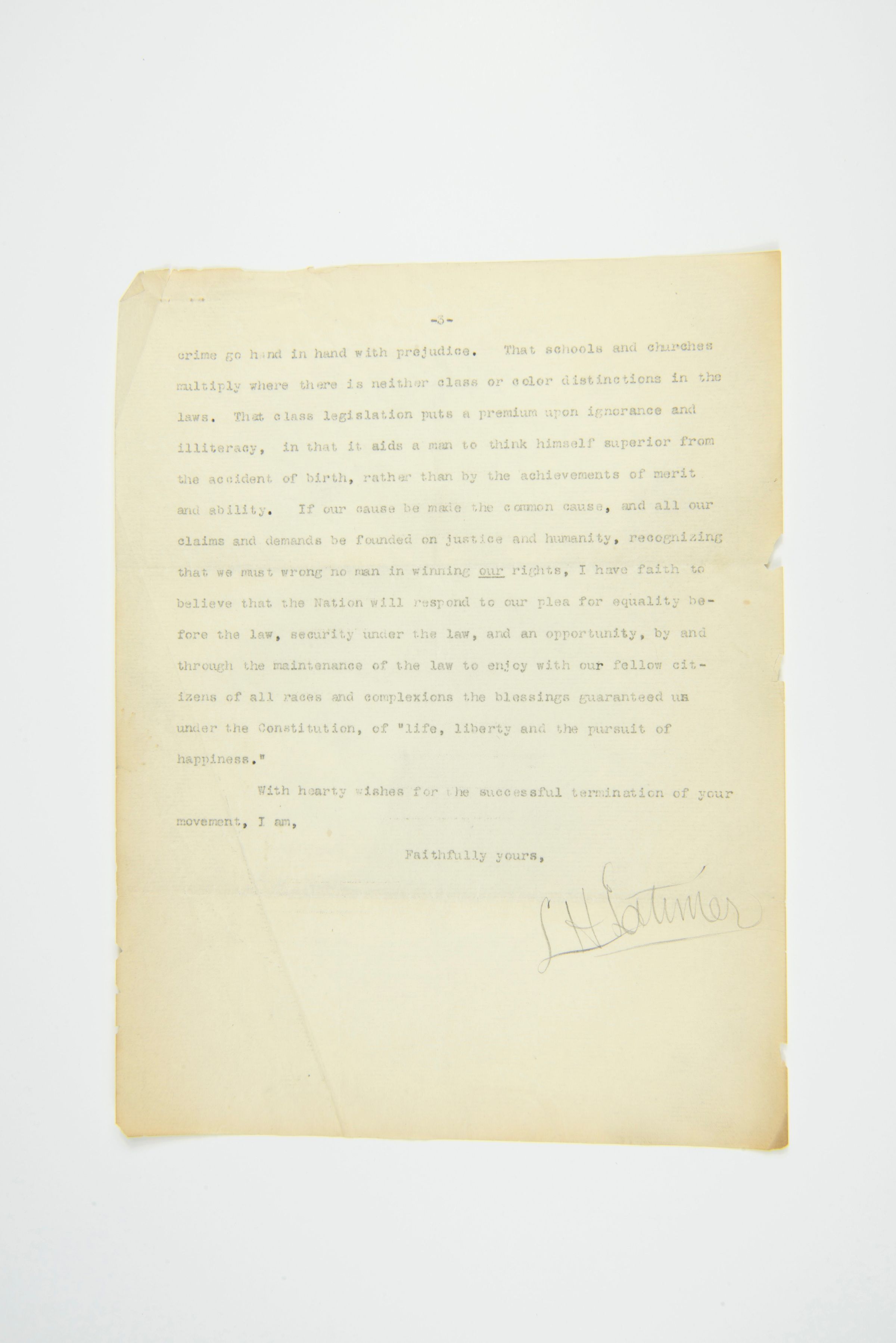 Page 3: That ignorance and crime go hand in hand with prejudice. That schools and churches multiply where there is neither class or color distinction in the laws. That class legislation puts a premium upon ignorance and illiteracy, in that it aids a man to think himself superior from the accident of birth, rather than by the achievements of merit and ability. If our cause be made the common cause, and all our claims and demands be founded on justice and humanity, recognizing that we must wrong no man in winning our rights, I have faith to believe that the Nation will respond to our plea for equality before the law, security under the law, and an opportunity, by and through the maintenance of the law to enjoy with our fellow citizens of all races and complexions the blessings guaranteed us under the Constitution, of "life, liberty and the pursuit of happiness."