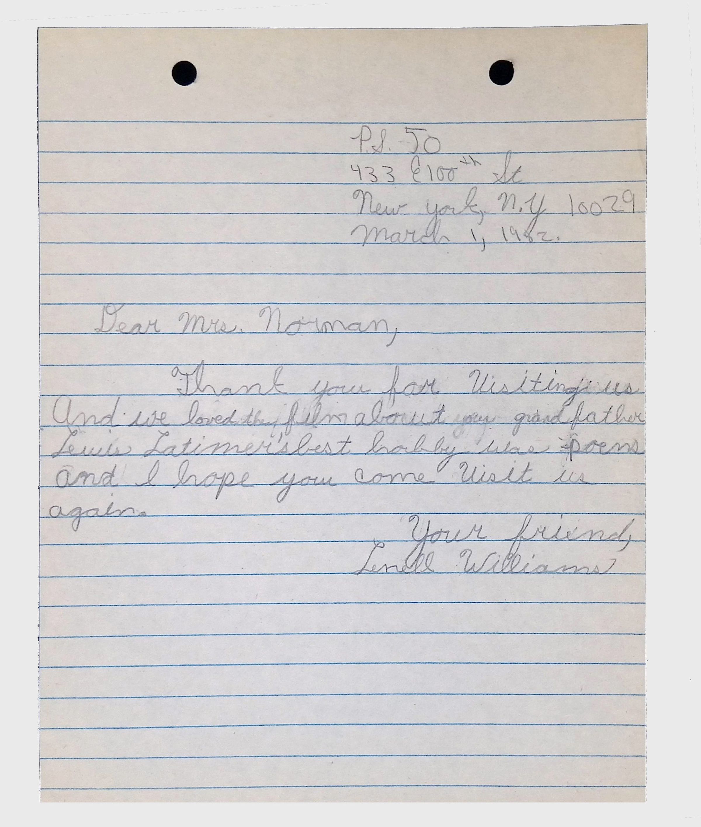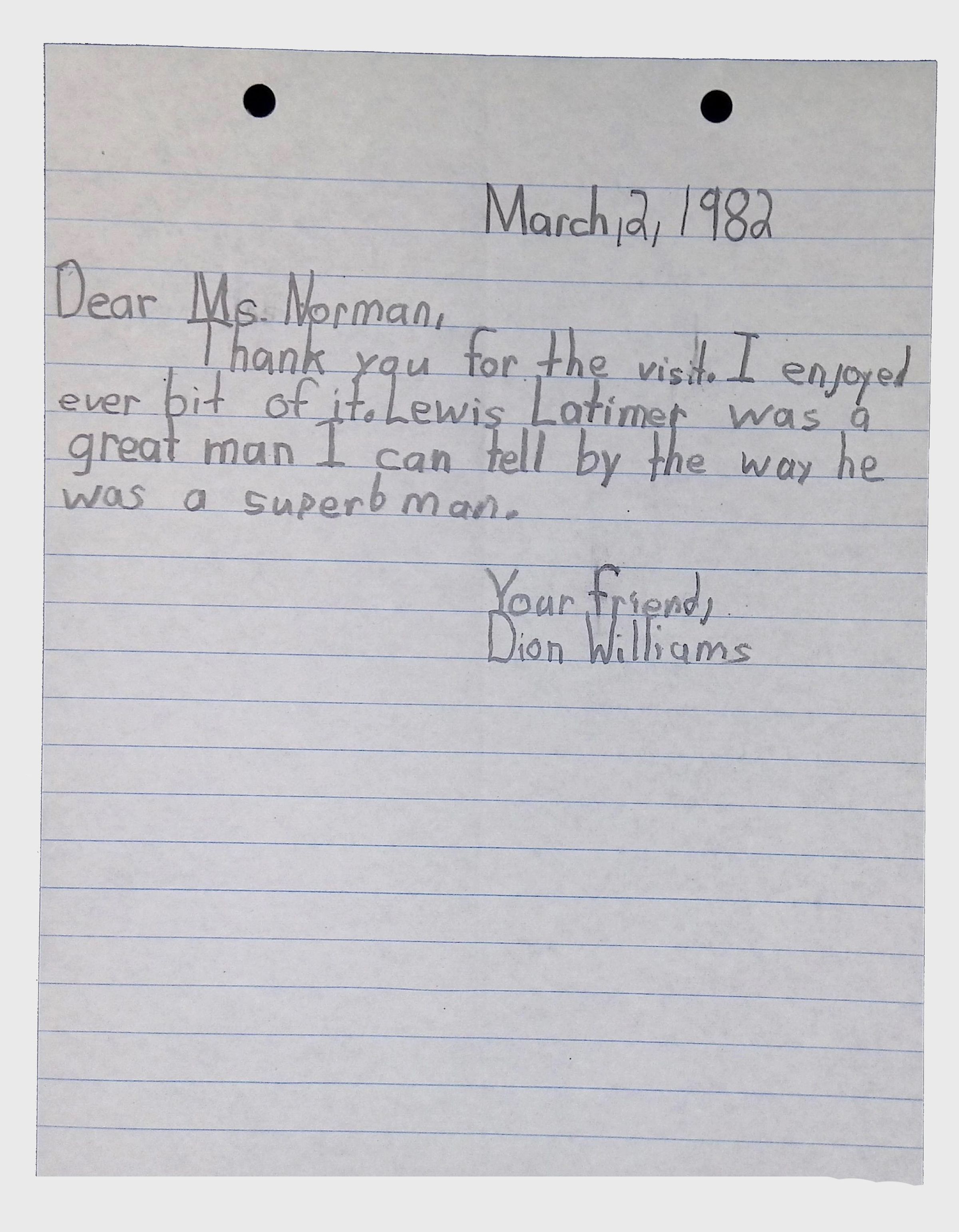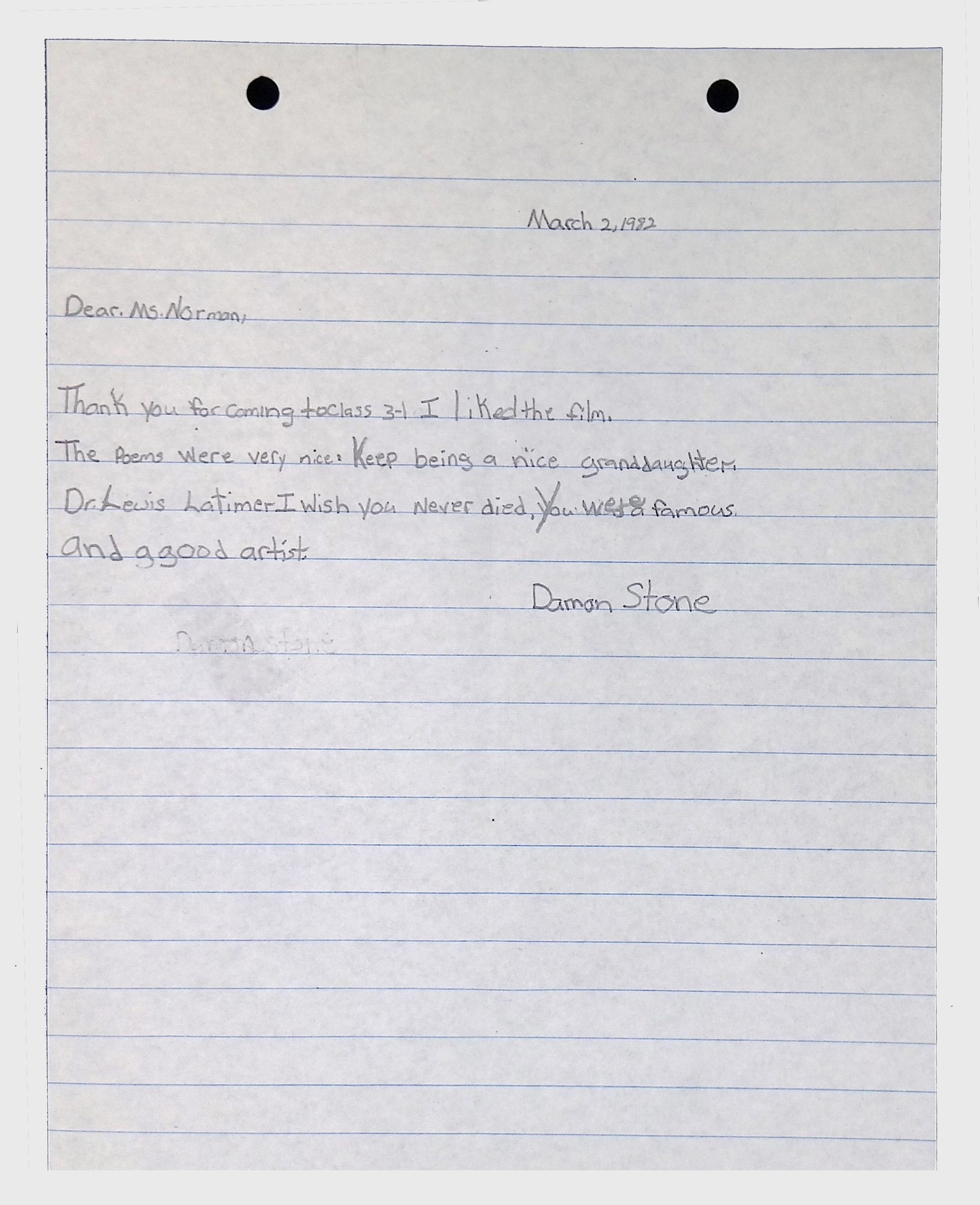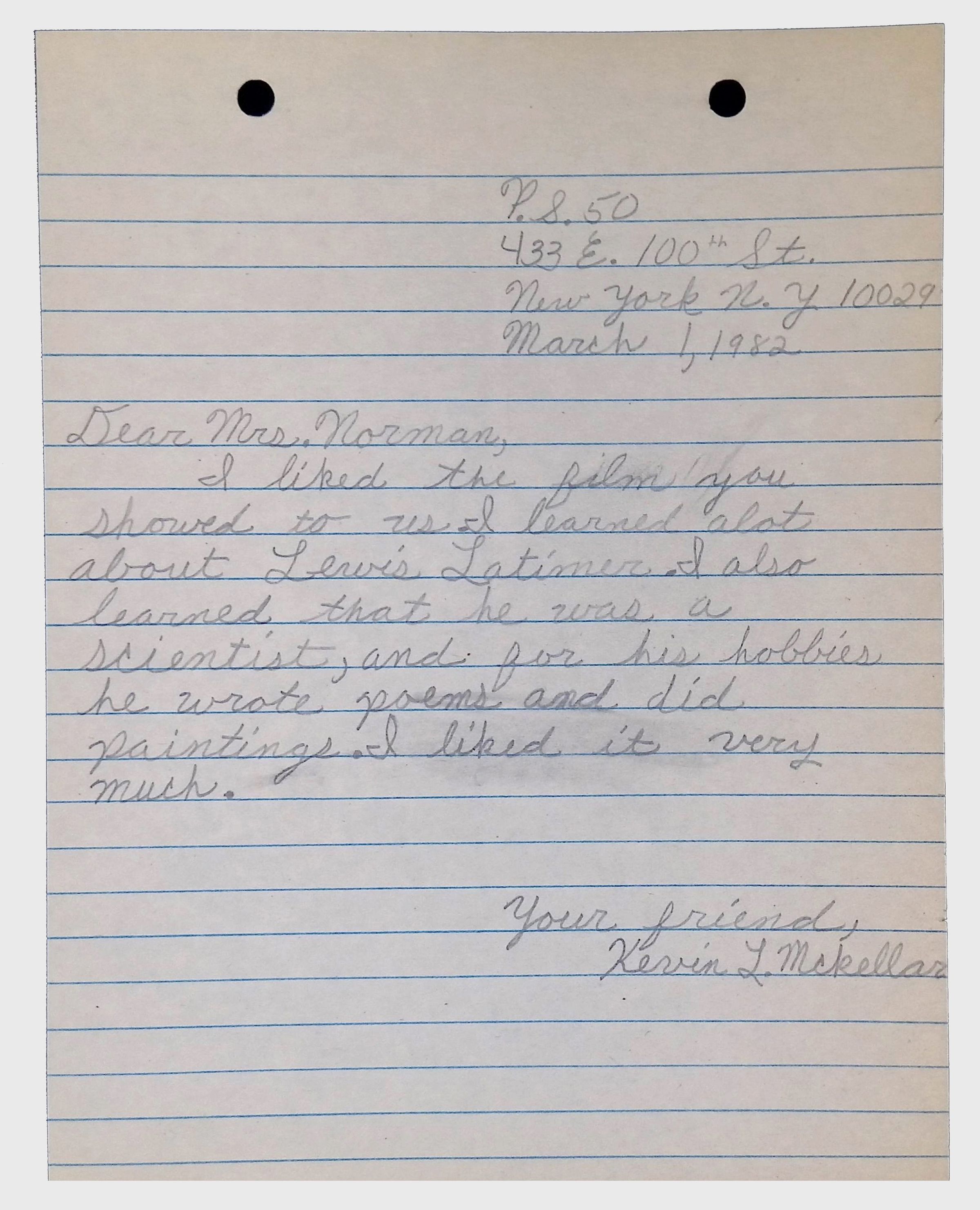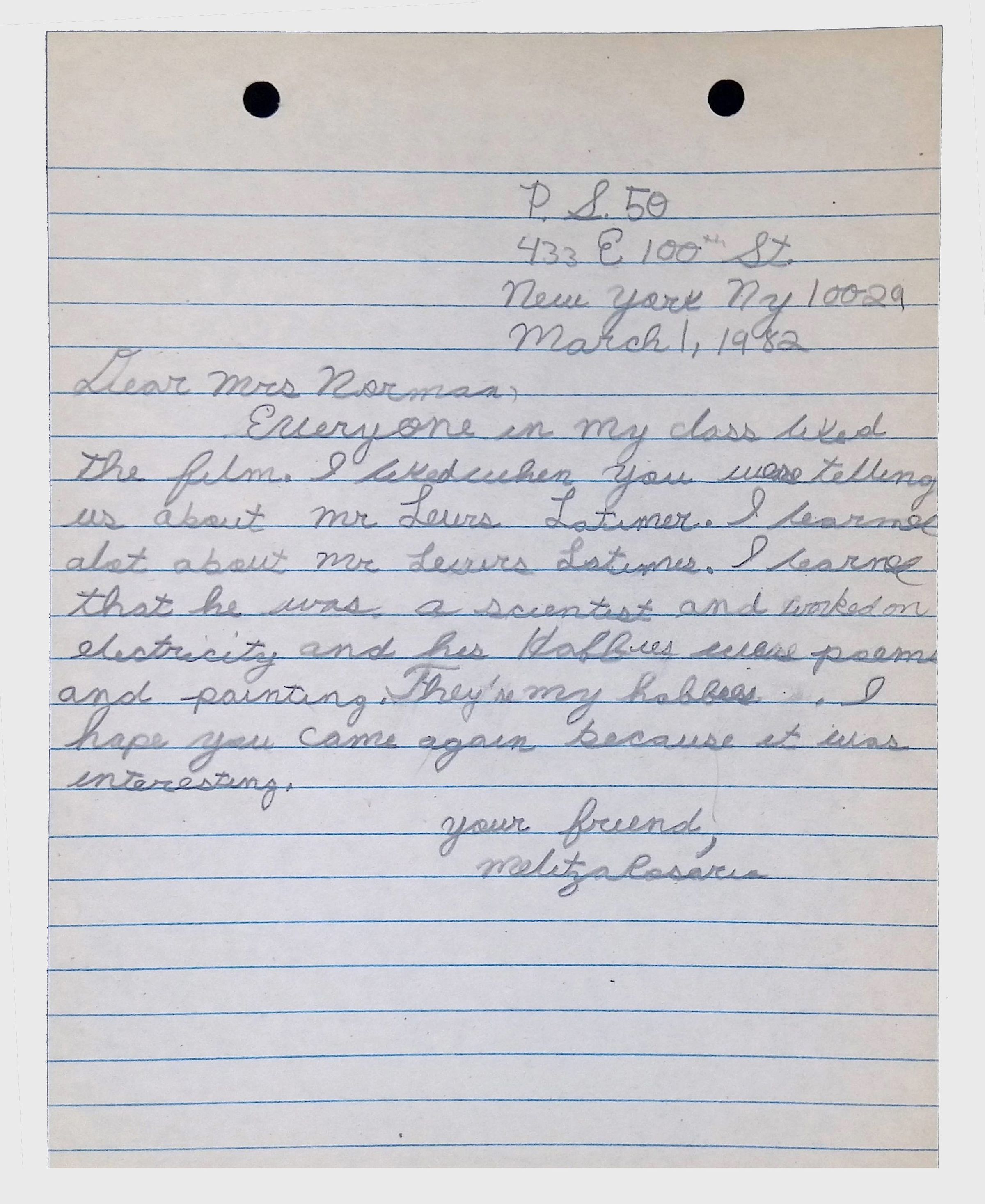 A collection of letters from an assistant principal and several schoolchildren thanking Winifred Norman, Lewis Latimer’s granddaughter, for making a classroom presentation on the life and work of Lewis Latimer at Public School 50 in East Harlem in 1982.Context