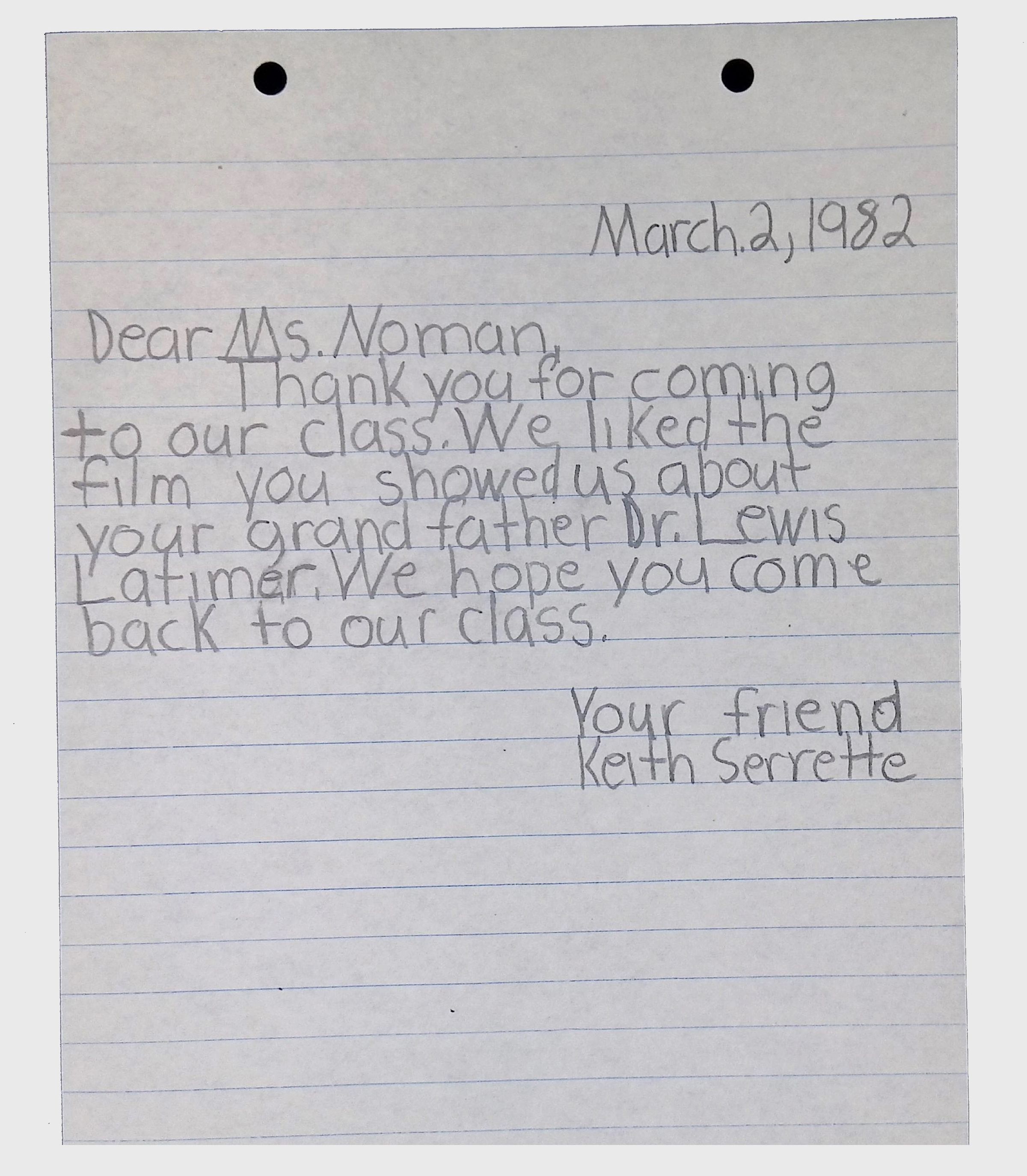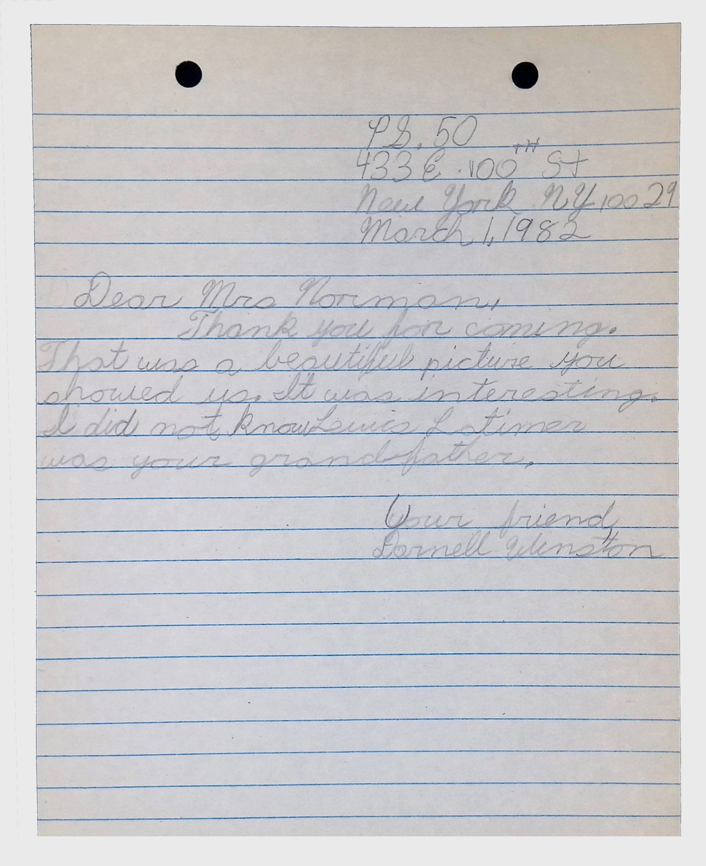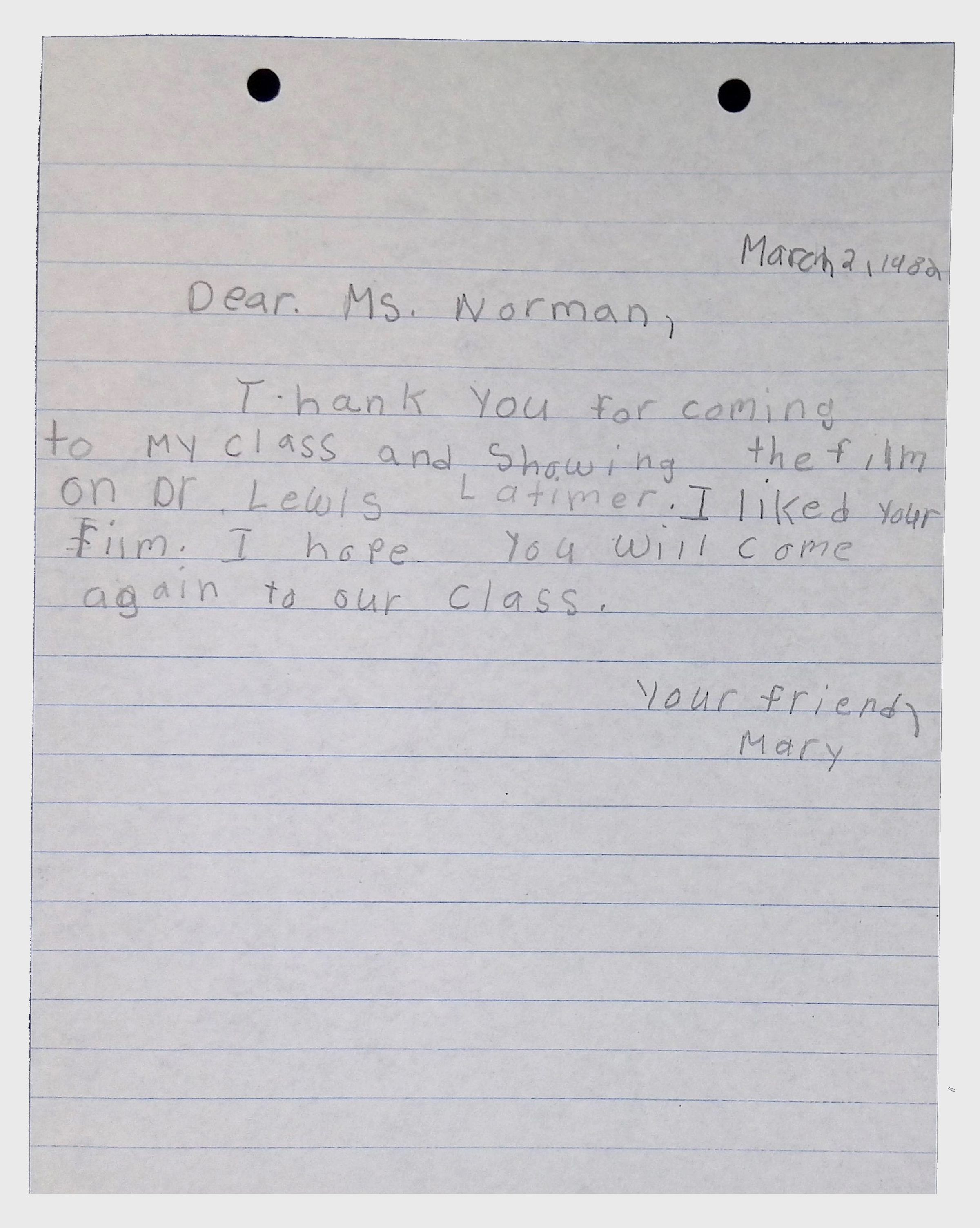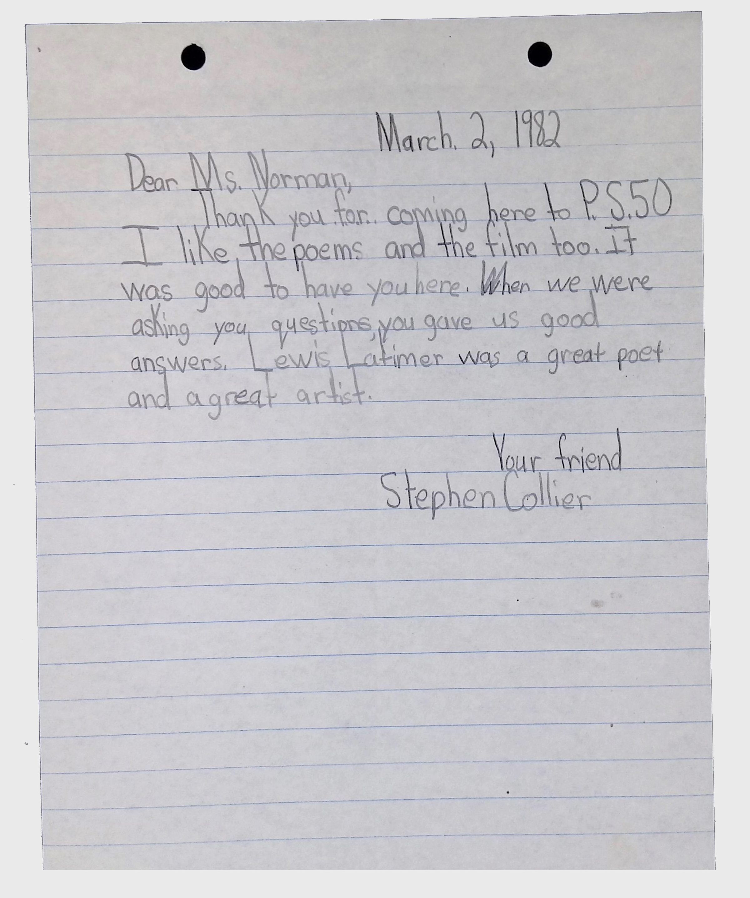 A collection of letters from an assistant principal and several schoolchildren thanking Winifred Norman, Lewis Latimer’s granddaughter, for making a classroom presentation on the life and work of Lewis Latimer at Public School 50 in East Harlem in 1982.Context