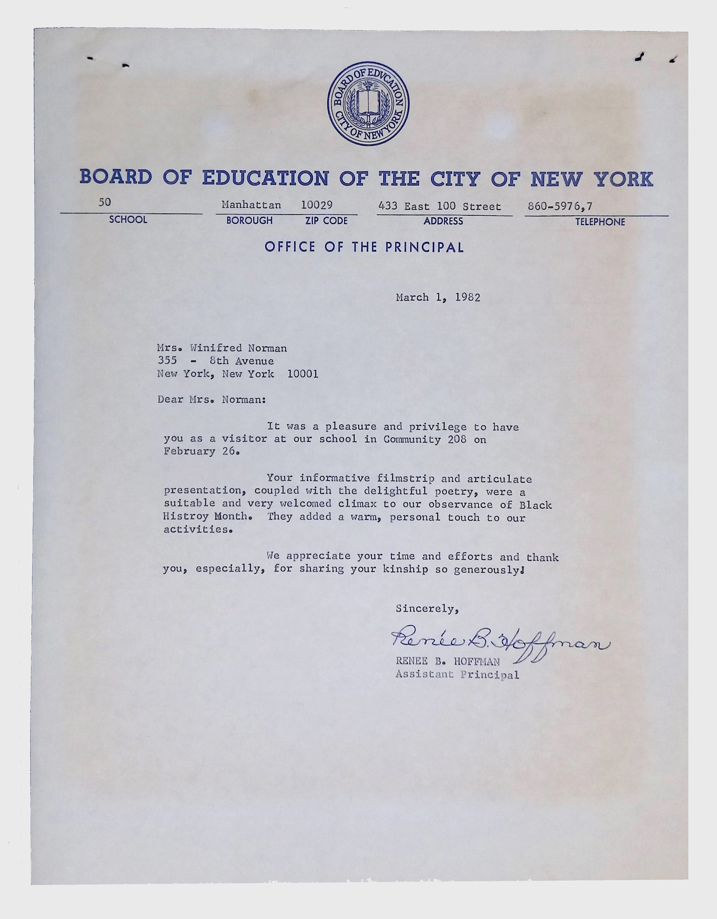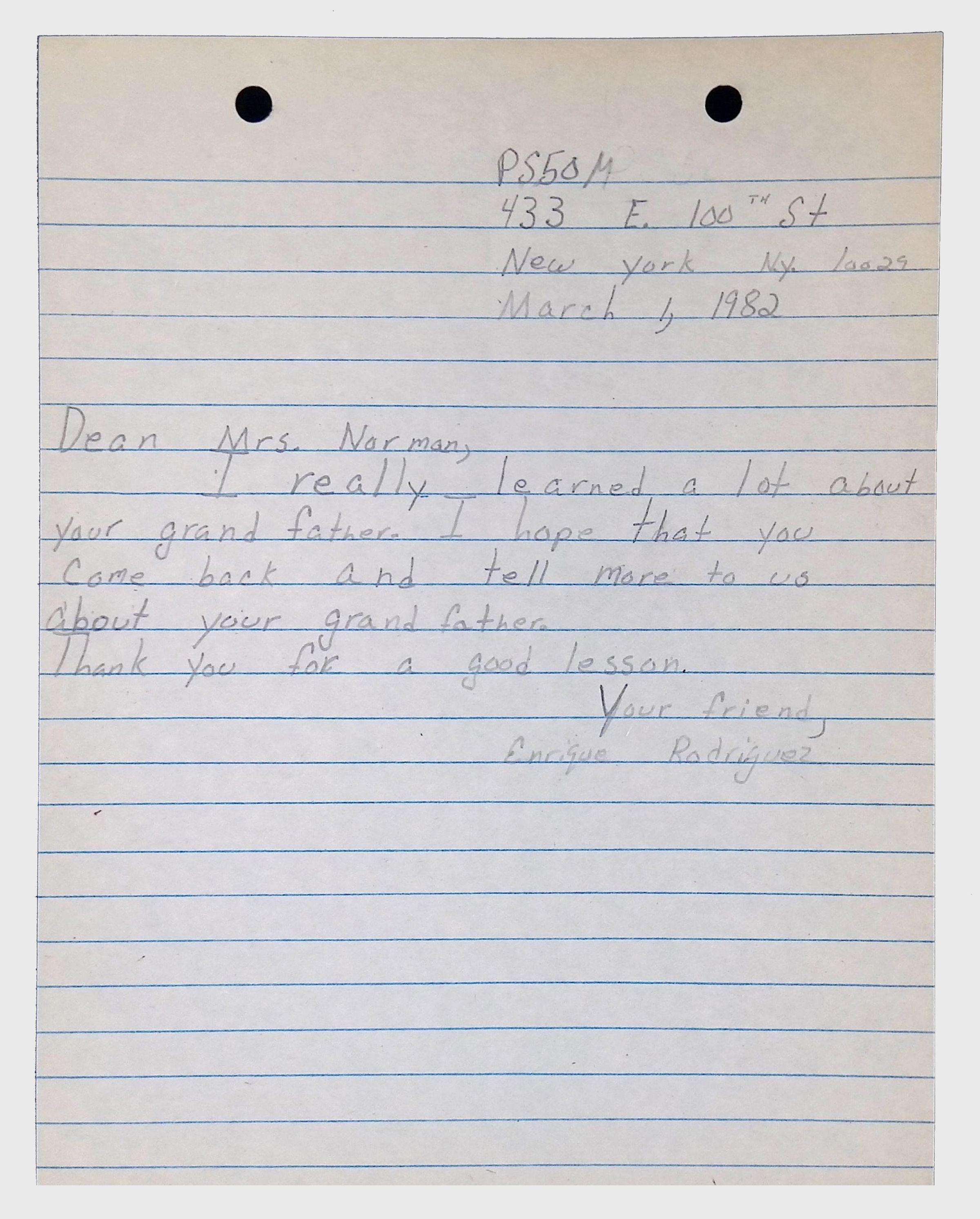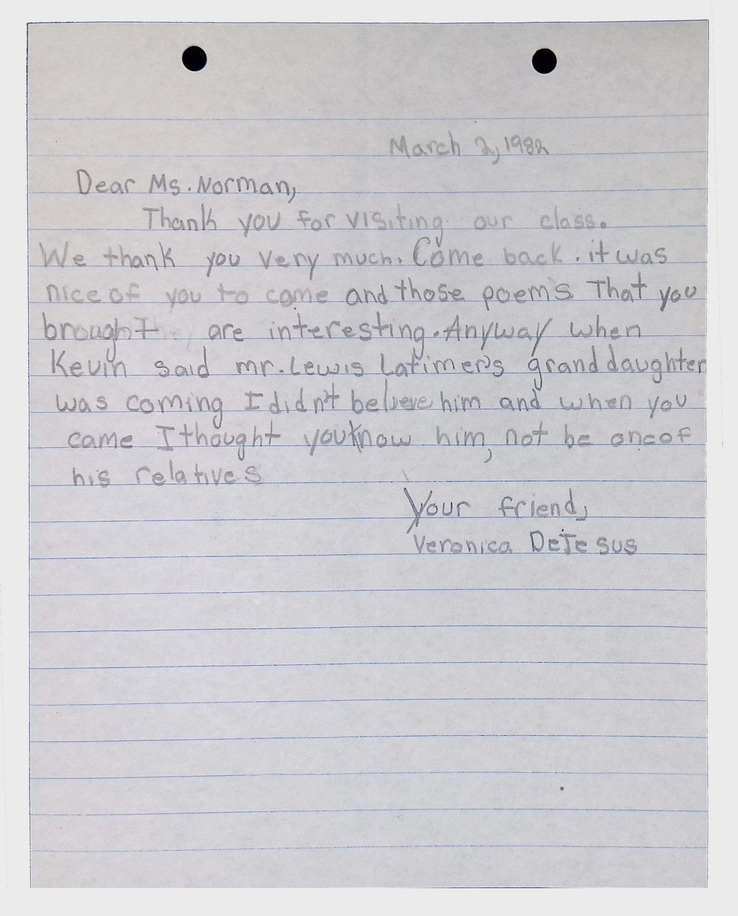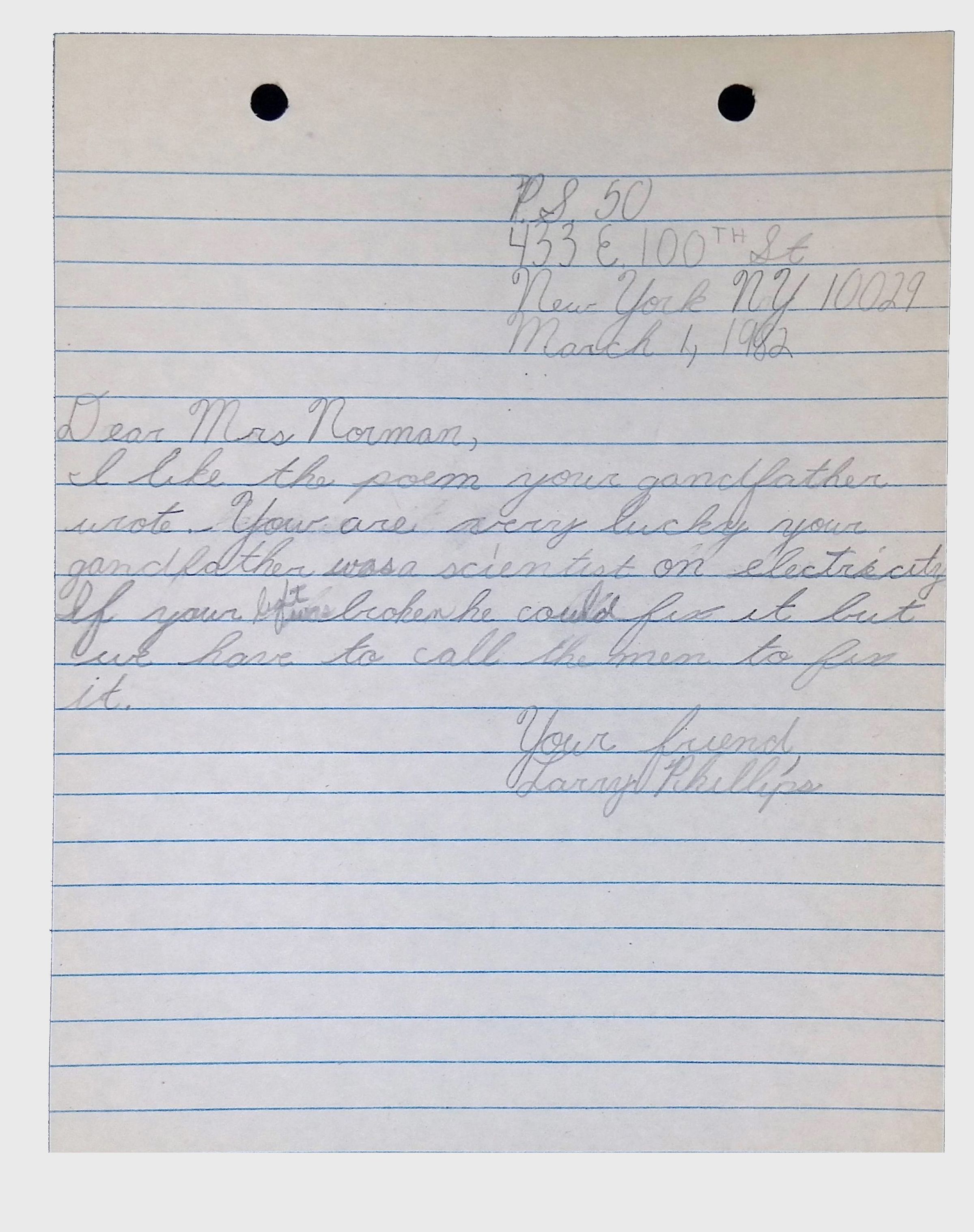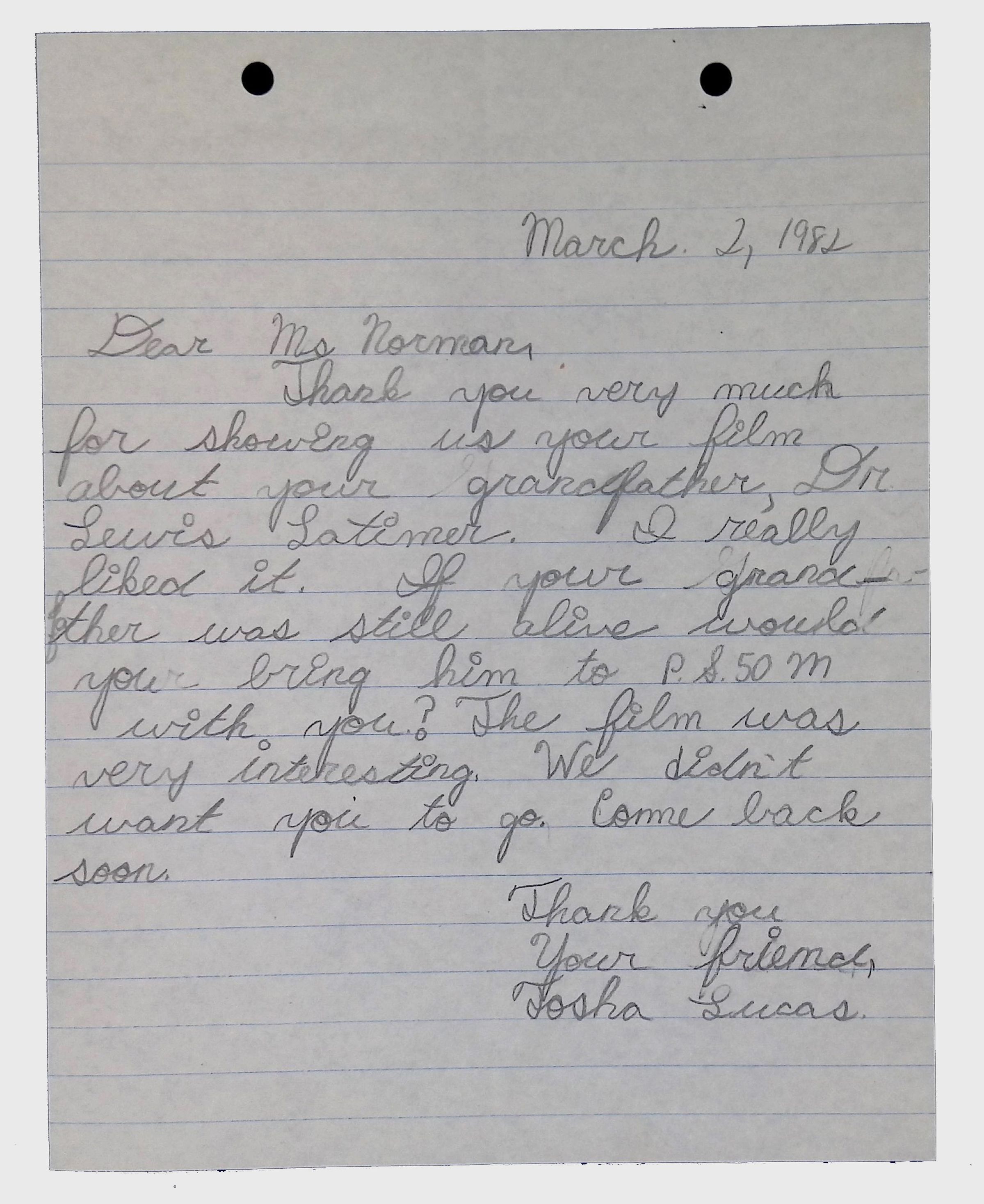 A collection of letters from an assistant principal and several schoolchildren thanking Winifred Norman, Lewis Latimer’s granddaughter, for making a classroom presentation on the life and work of Lewis Latimer at Public School 50 in East Harlem in 1982.Context