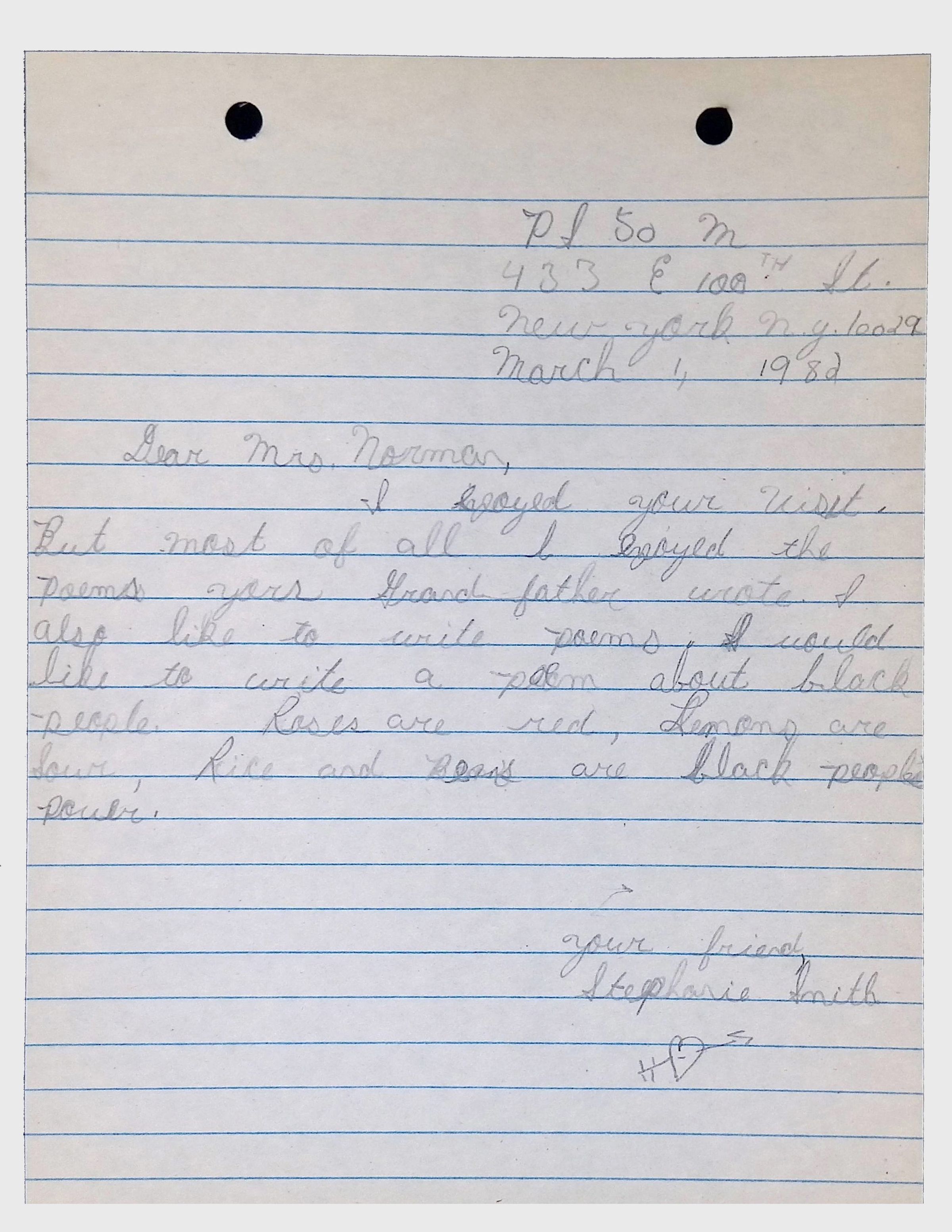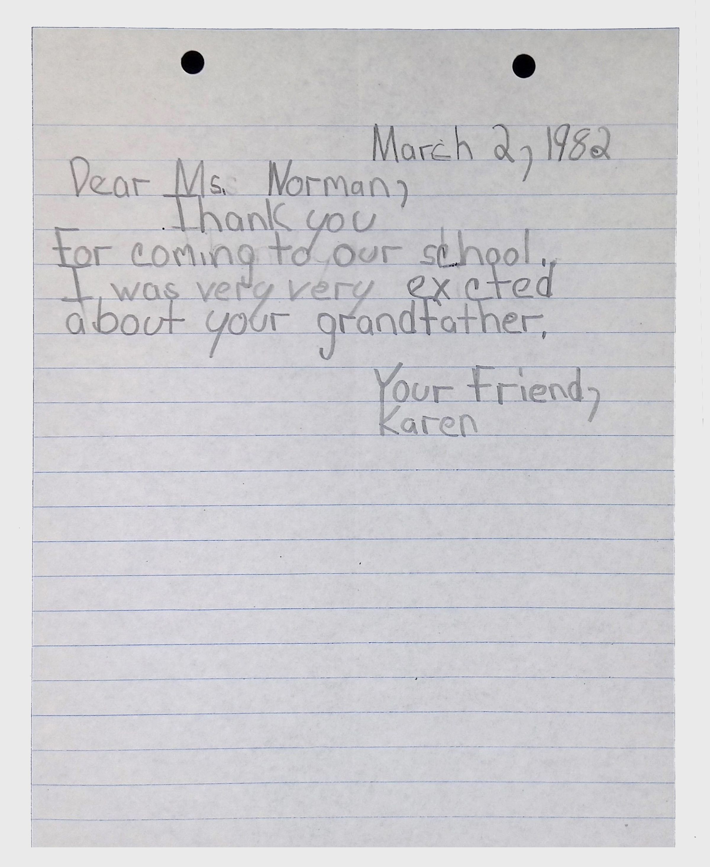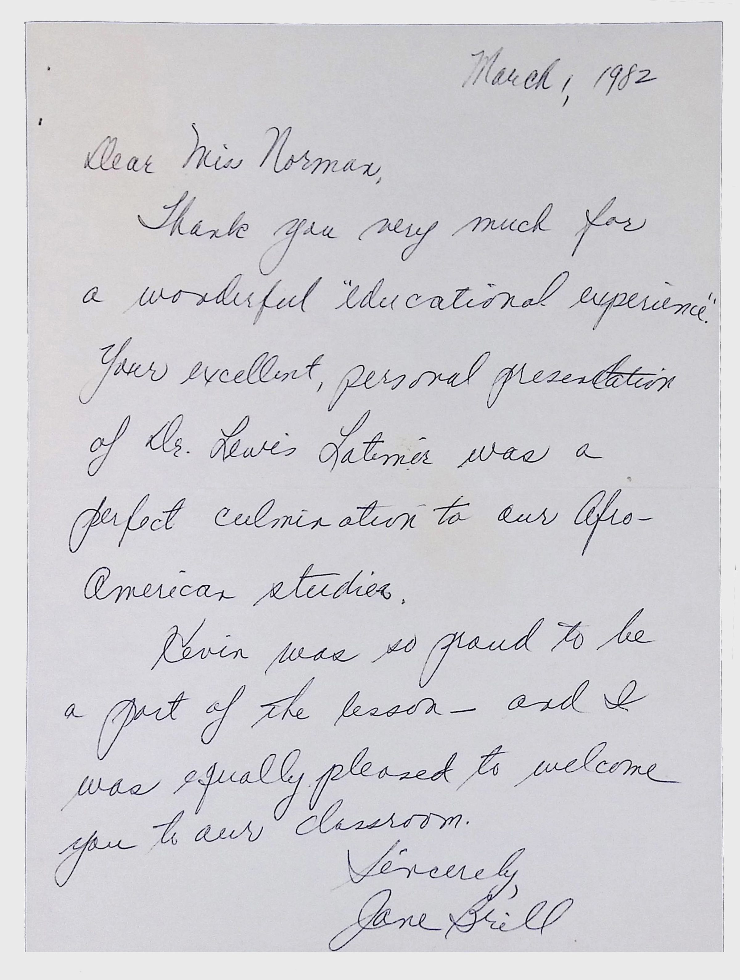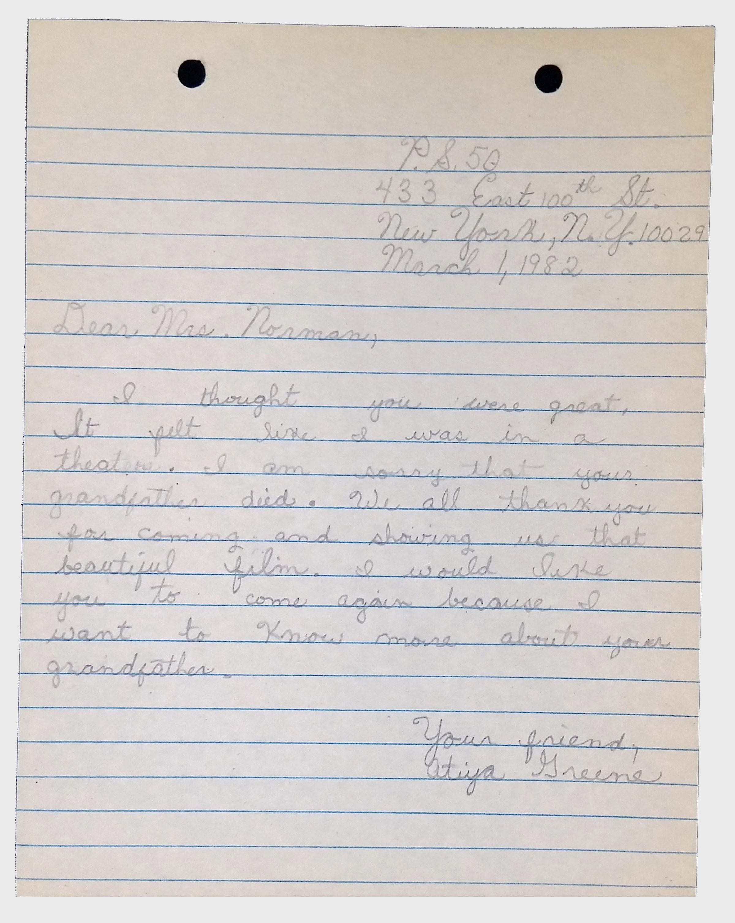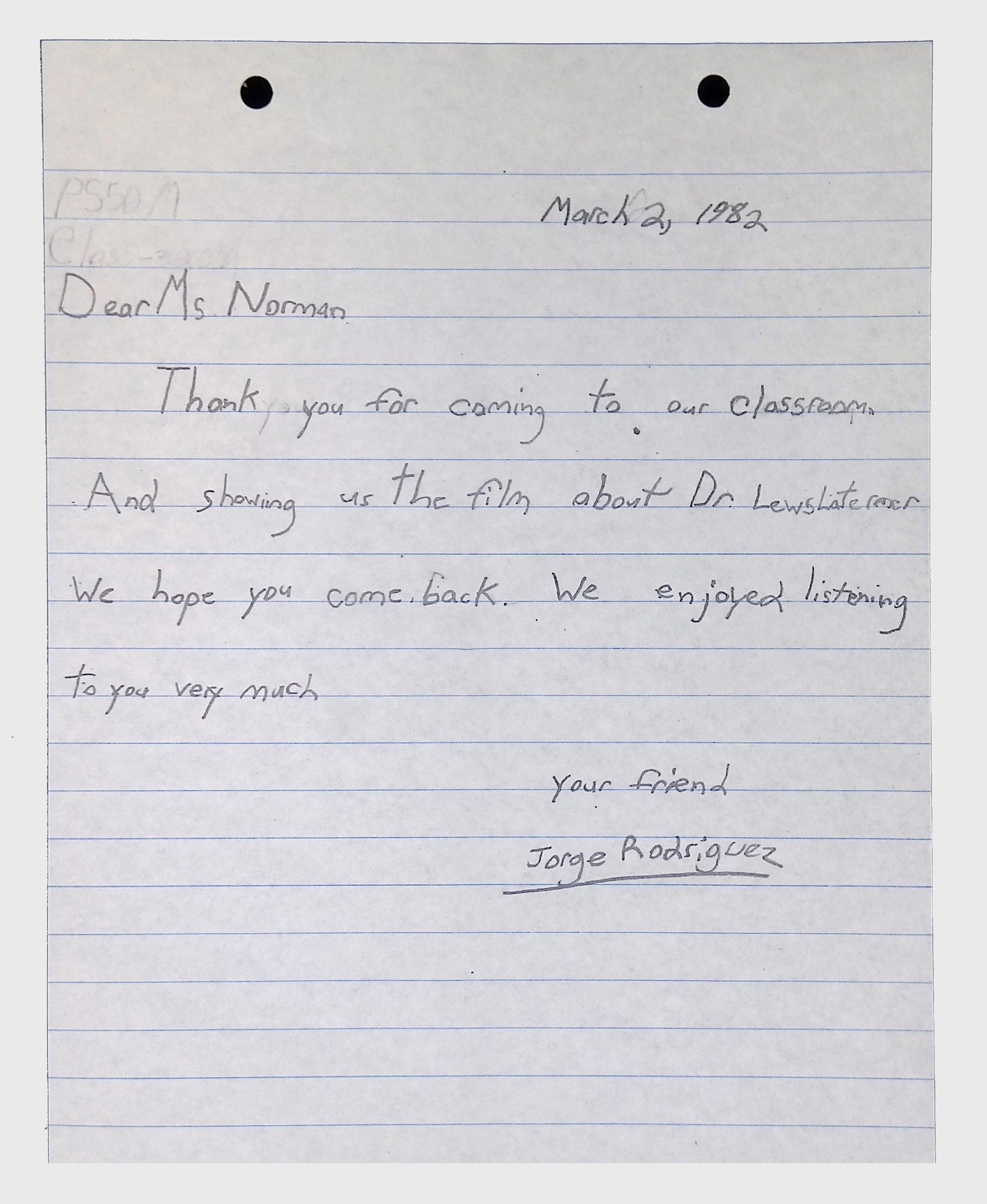 A collection of letters from an assistant principal and several schoolchildren thanking Winifred Norman, Lewis Latimer’s granddaughter, for making a classroom presentation on the life and work of Lewis Latimer at Public School 50 in East Harlem in 1982.Context