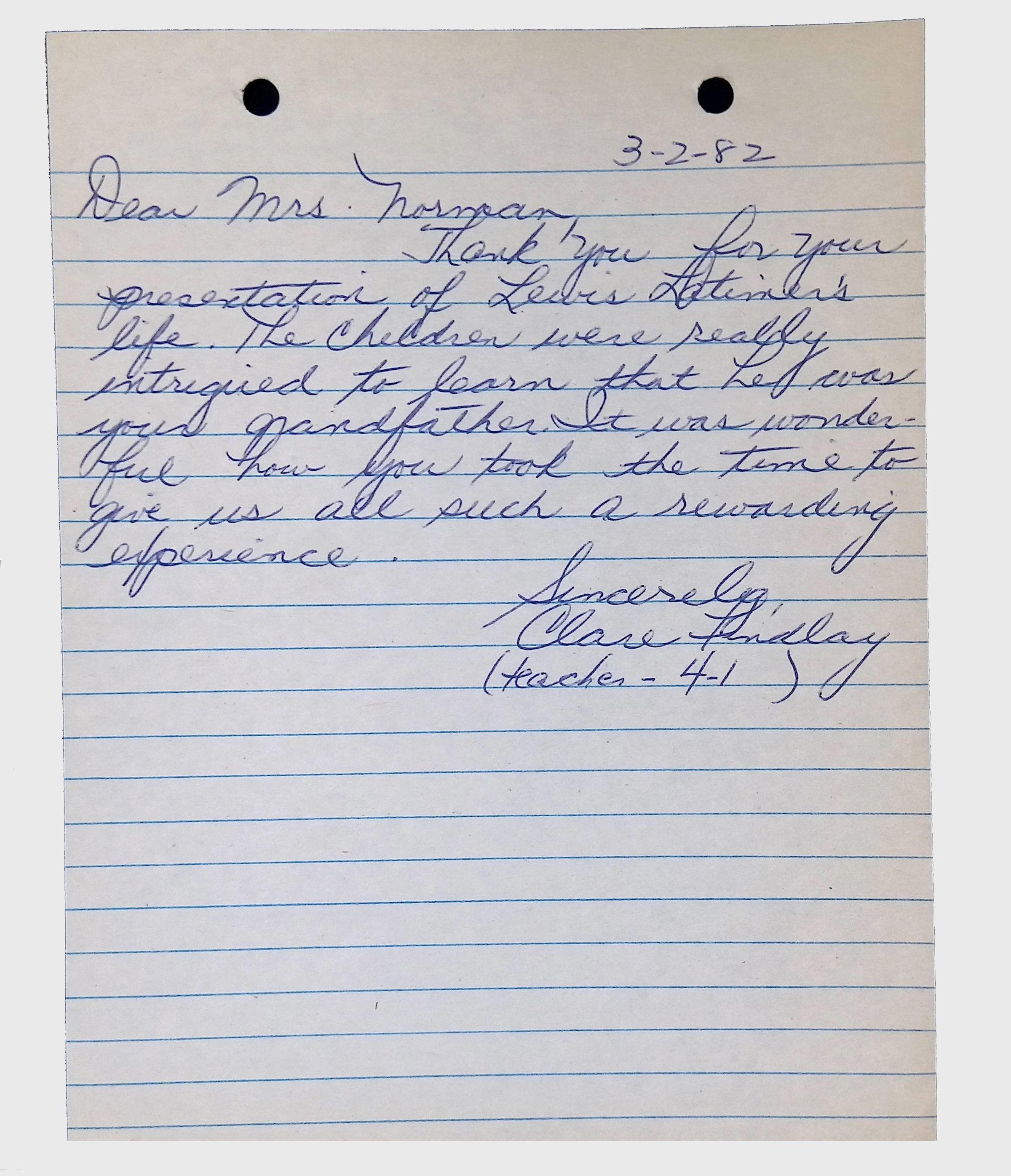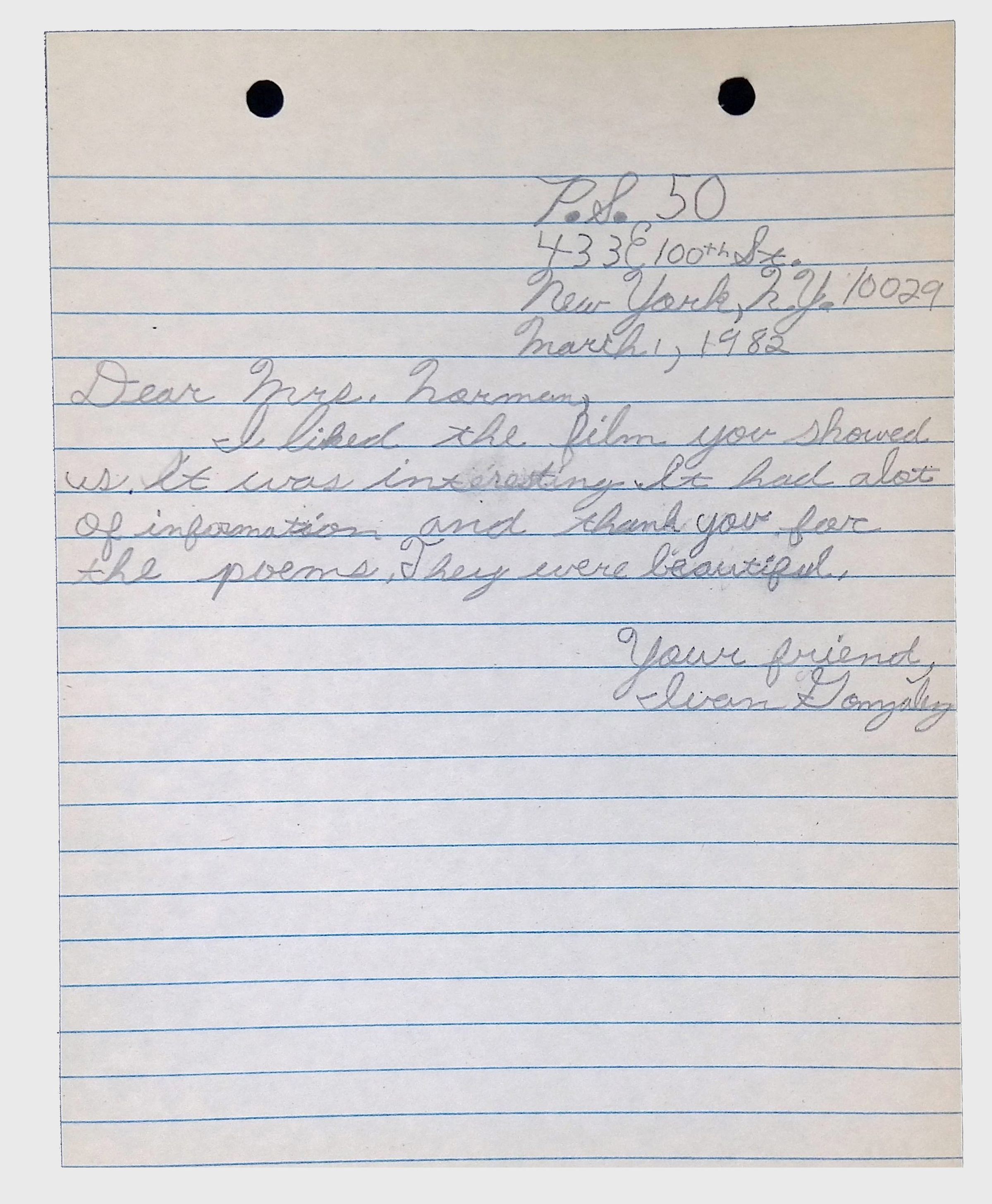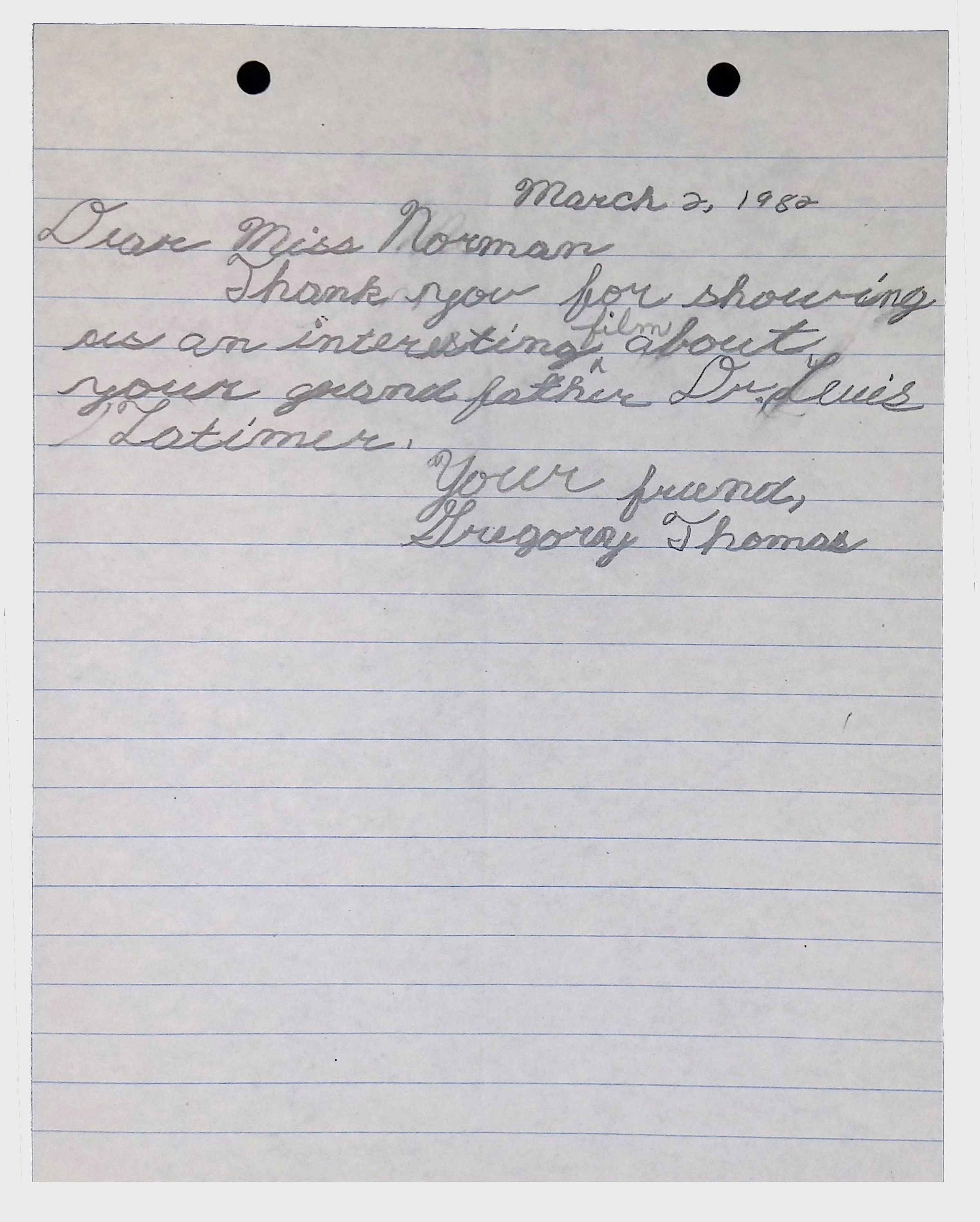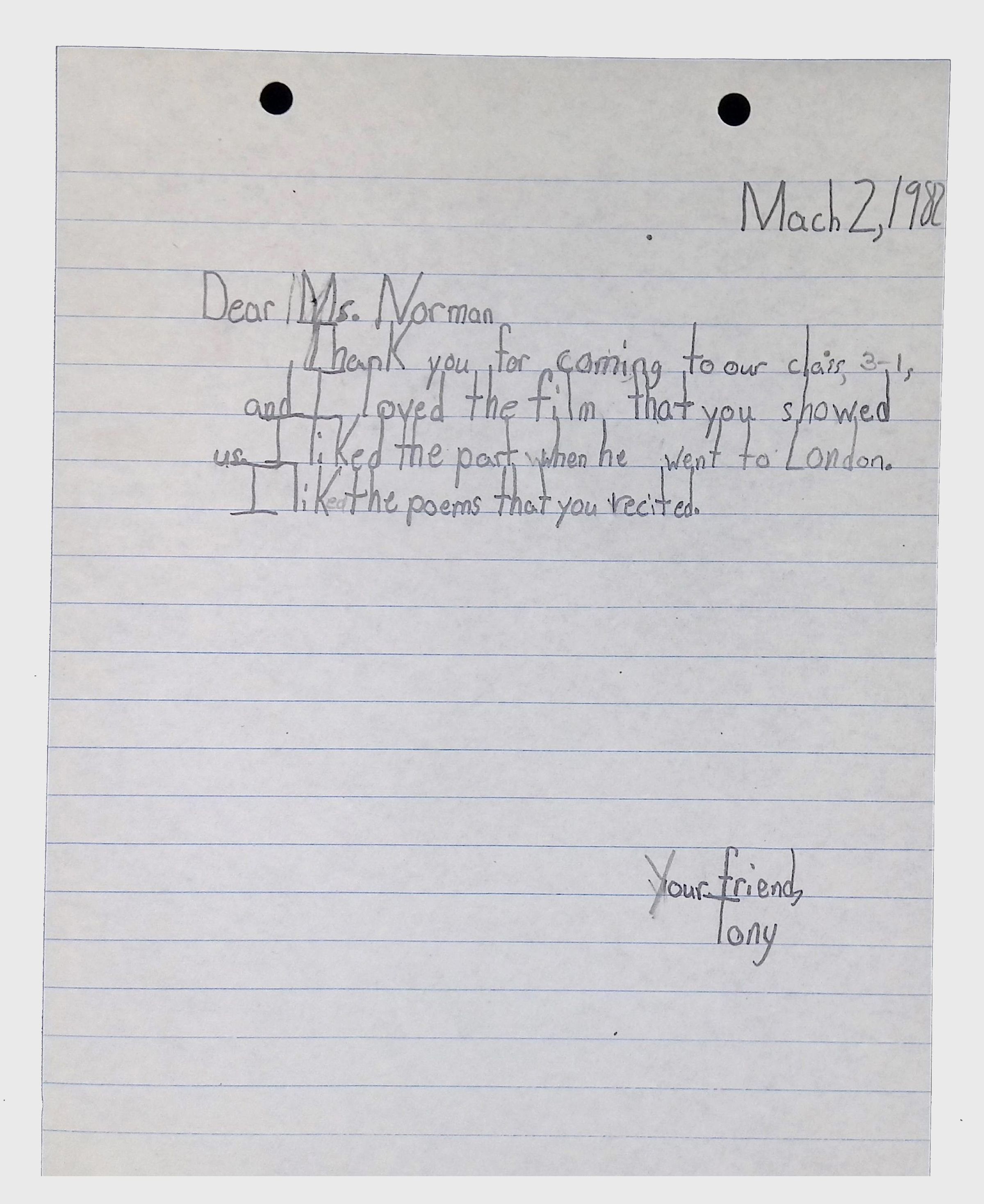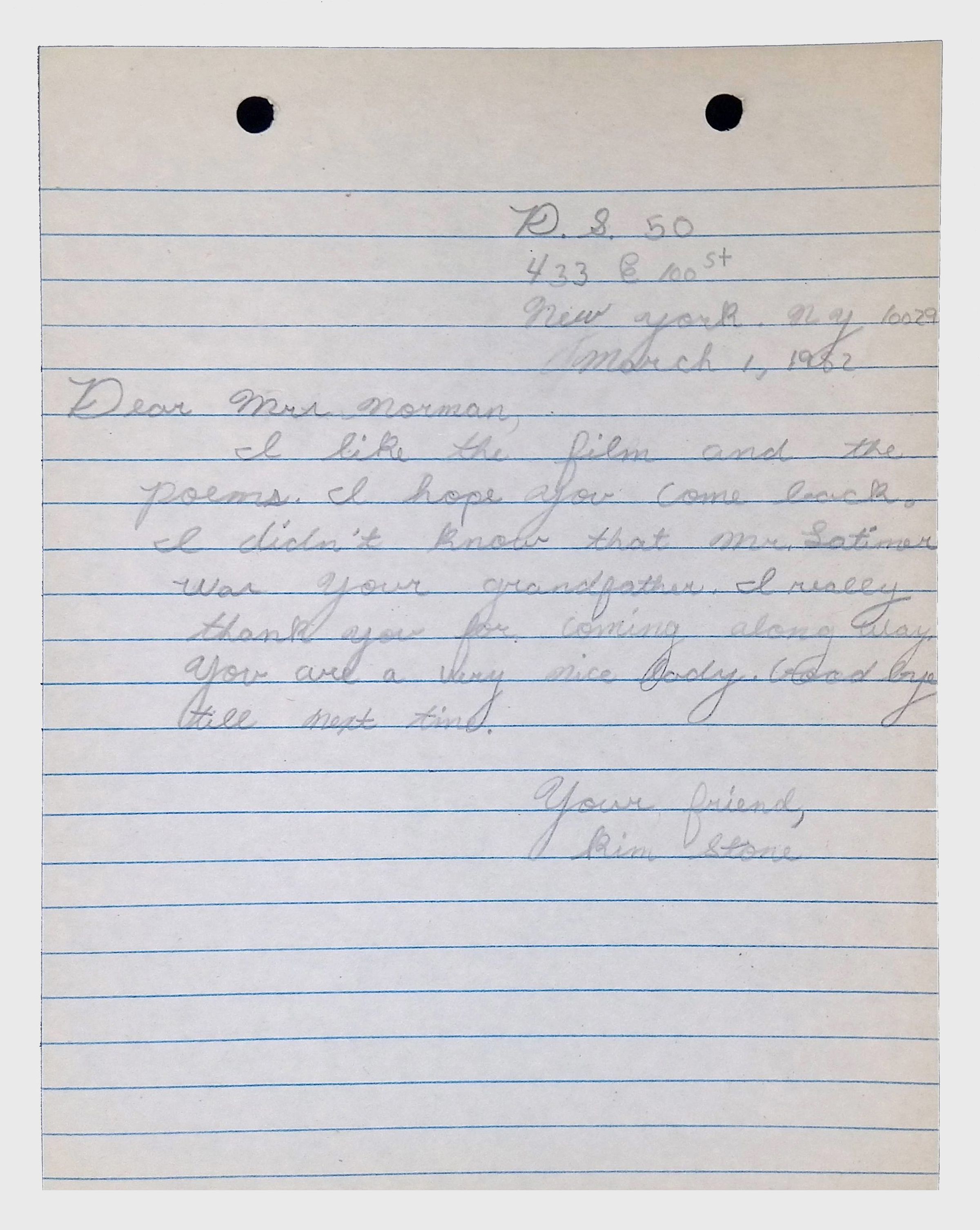 A collection of letters from an assistant principal and several schoolchildren thanking Winifred Norman, Lewis Latimer’s granddaughter, for making a classroom presentation on the life and work of Lewis Latimer at Public School 50 in East Harlem in 1982.Context
