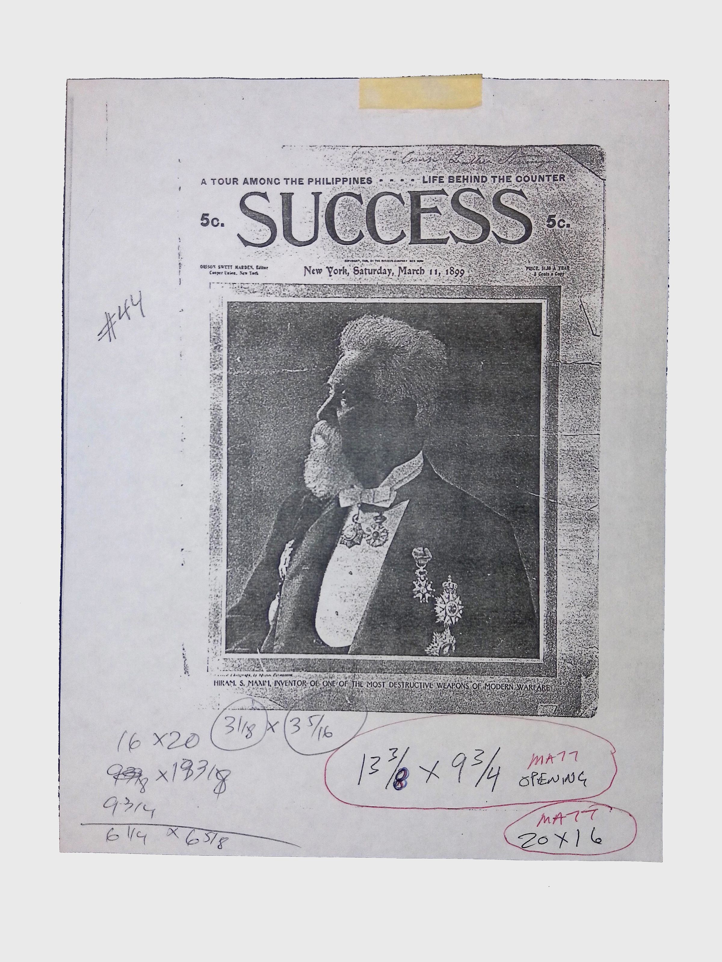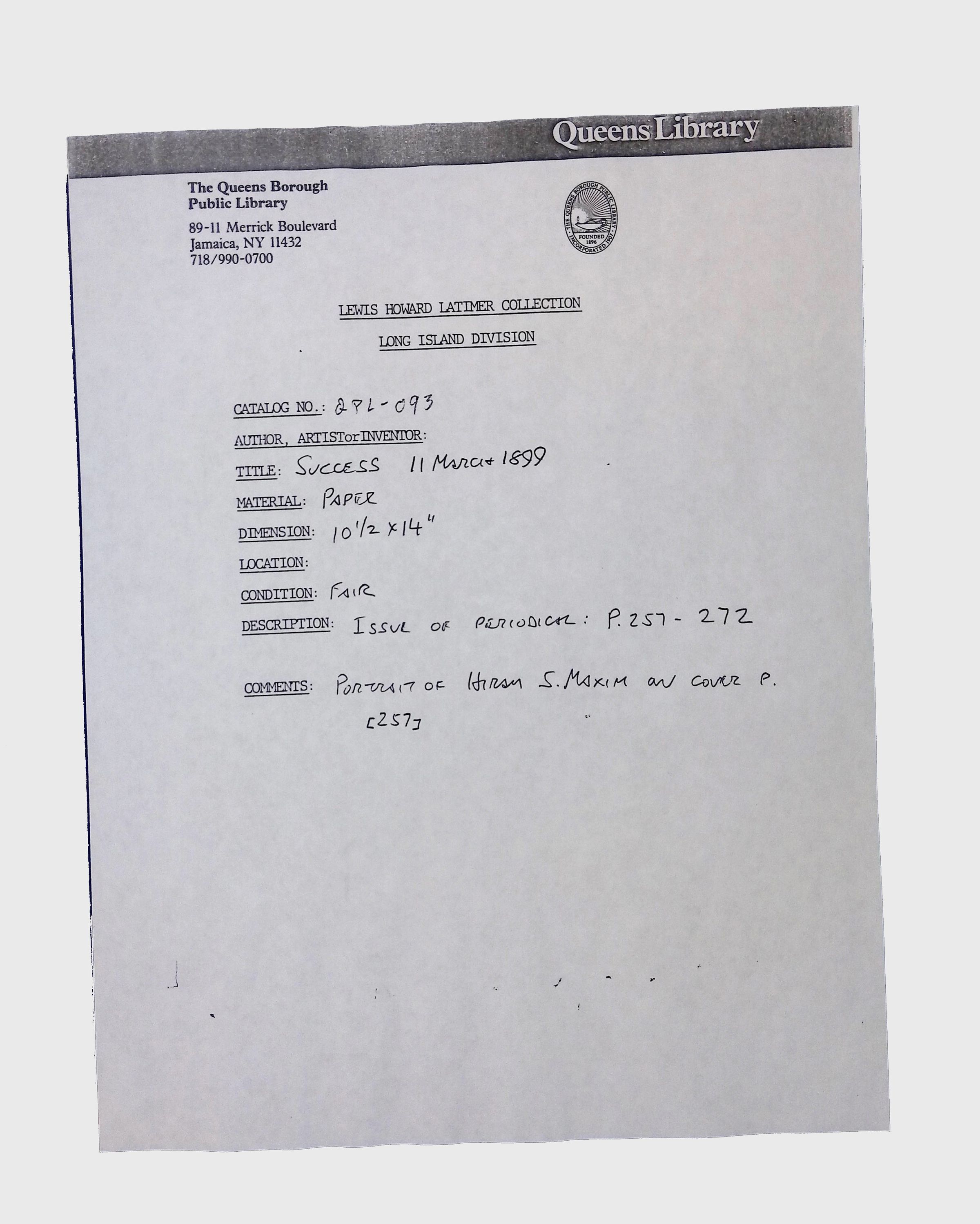 This folder contains archival documents related to Lewis H. Latimer, including news clippings, letters, periodicals, technical documents, and books. The materials span topics such as Latimer’s contributions to electric lighting, personal correspondence, and contemporary media coverage of his work. Notable items in this folder include: A photocopy of the cover of an issue of Success Magazine, March 11, 1899, featuring a cover image of Hiram S. Maxim. 1876 book titled La Lumière by M. Moitessier, stamped by the Queens Borough Public Library. Lecture booklet detailing art and architecture lectures, possibly related to Latimer’s intellectual interests. Condition varies, with some documents showing signs of age-related wear and annotations.Context