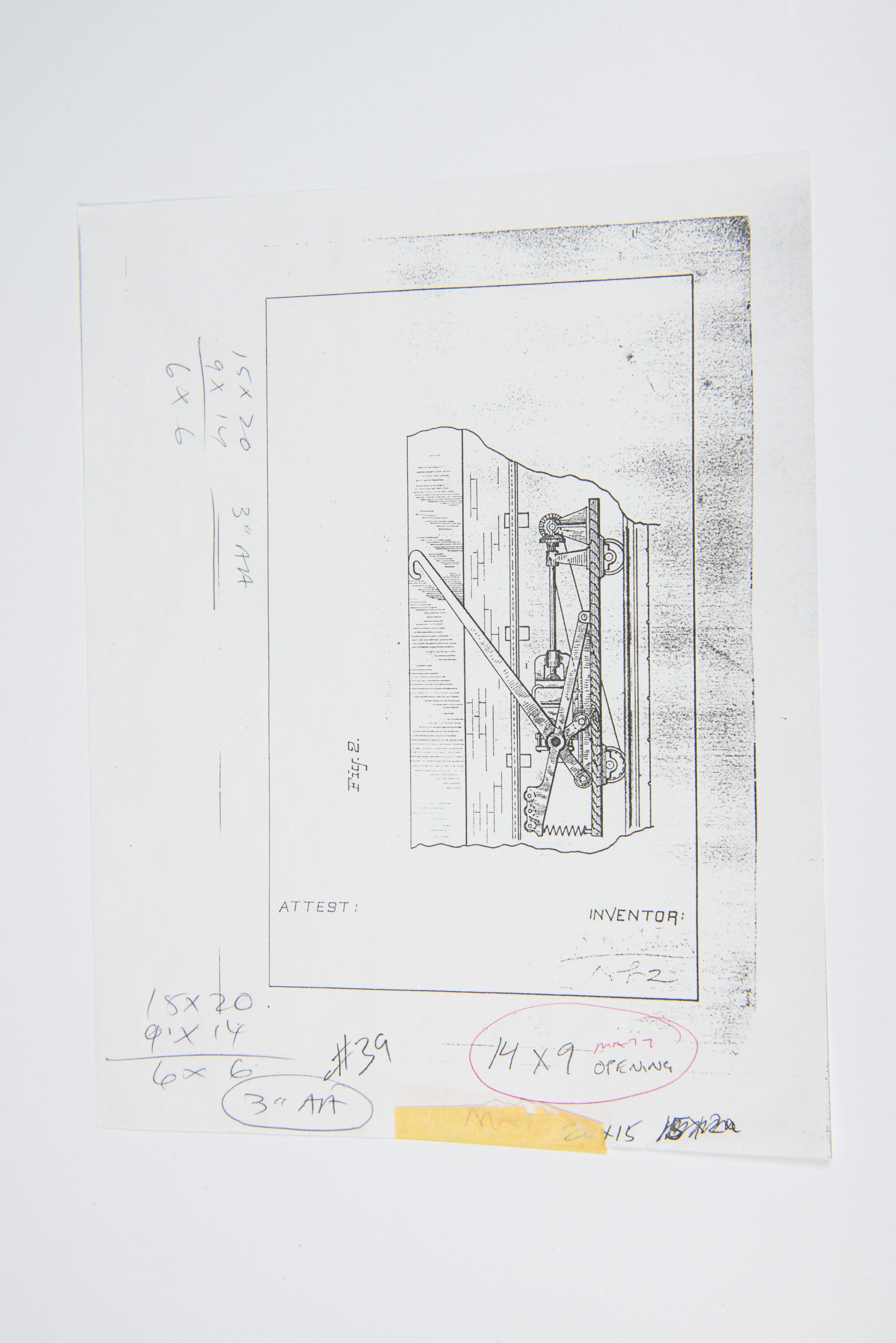 A technical drawing depicting a mechanical system, possibly a patent illustration related to Lewis Latimer’s work in mechanical engineering and invention. The diagram includes gears, levers, and pulleys, suggesting an apparatus designed for automated movement. The image has handwritten annotations, dimensions, and notes, possibly for resizing or reproduction purposes.Context
