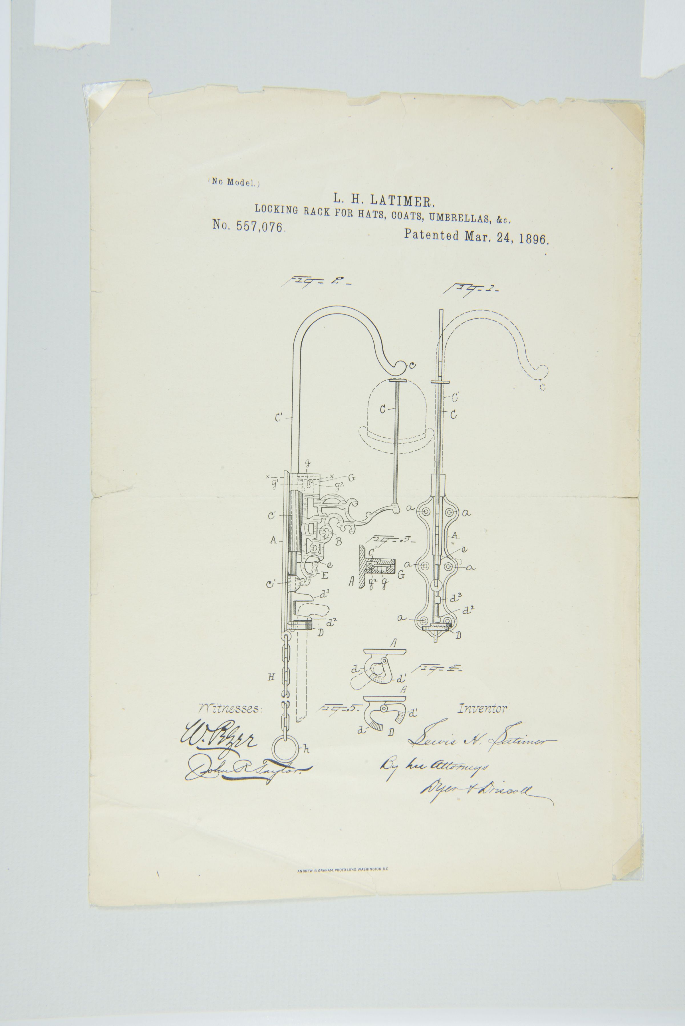 This patent, issued to Lewis H. Latimer on March 24, 1896, represents his continued contributions to innovation beyond electrical engineering. The locking rack served as a solution for securing personal belongings in public or shared spaces. This invention demonstrates Latimer's ingenuity in mechanical design and his ability to address practical, everyday challenges.Collection