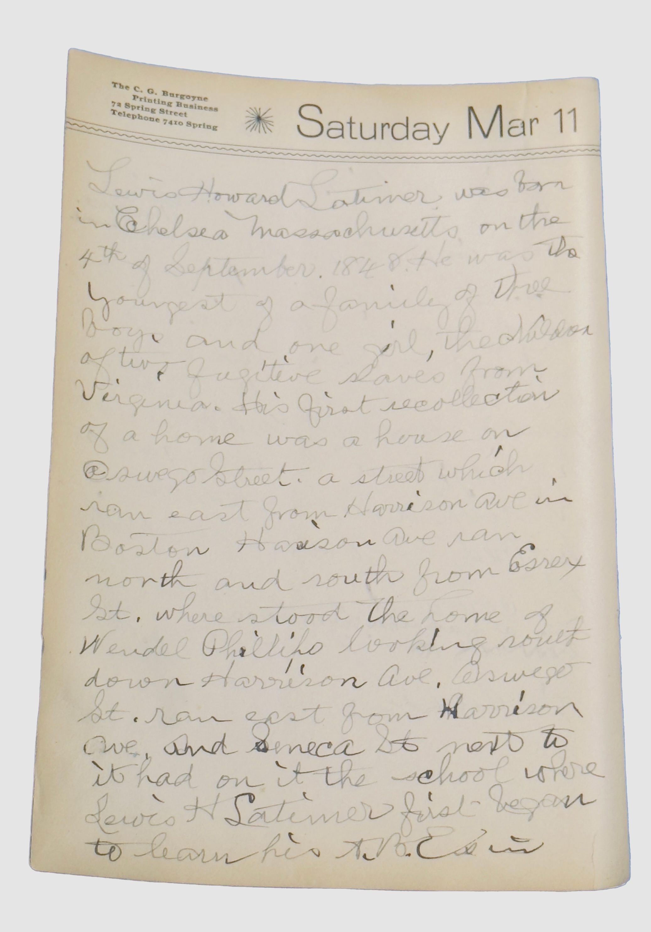 A historical page from a handwritten account detailing the early life of Lewis Howard Latimer, born in Chelsea, Massachusetts, on September 4, 1848. The notes highlight his background as the youngest child of formerly enslaved parents and describe his formative years in Boston.Collection