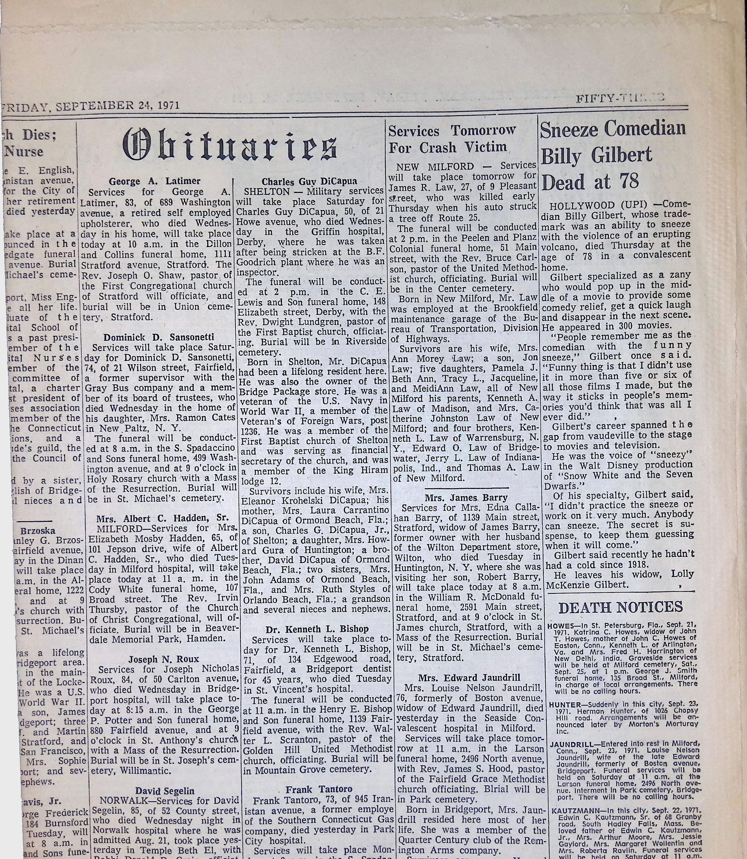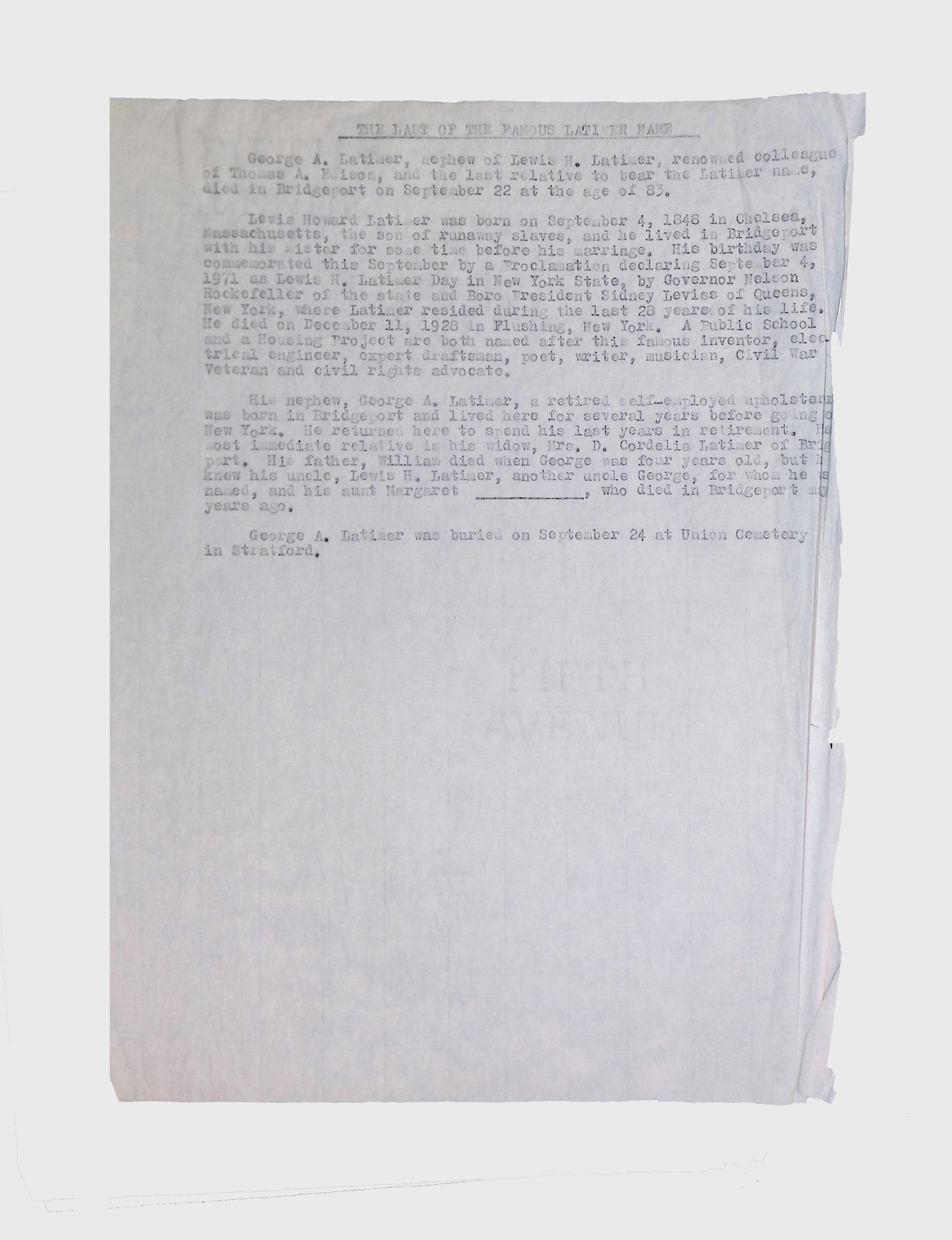 This folder contains materials related to George A. Latimer, nephew of Lewis H. Latimer. It includes an obituary from September 24, 1971, detailing his life, career as an upholsterer, and burial at Union Cemetery in Stratford. Another document titled "The Last of the Famous Latimer Name" discusses his lineage and connection to Lewis H. Latimer, a renowned inventor and colleague of Thomas Edison.Collection