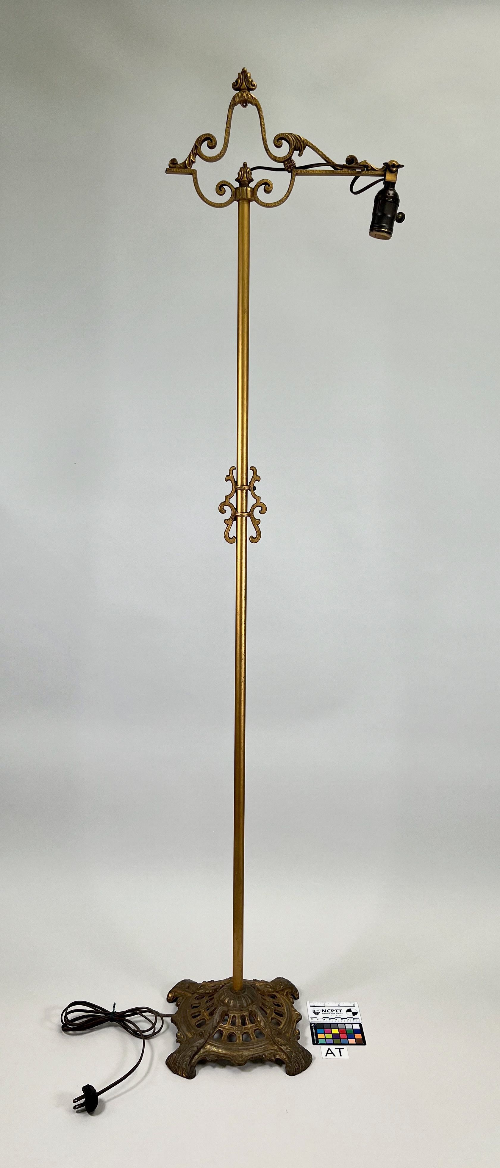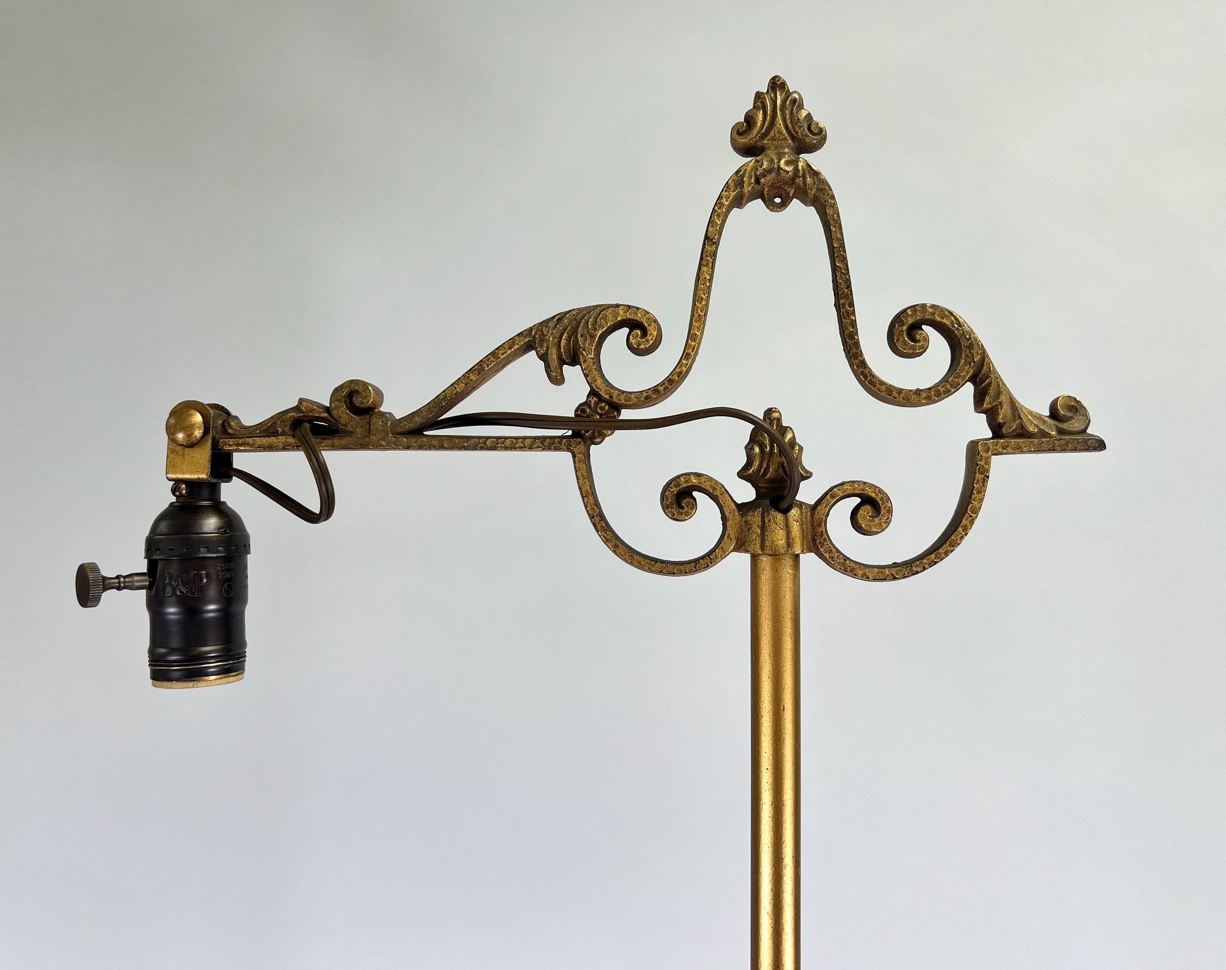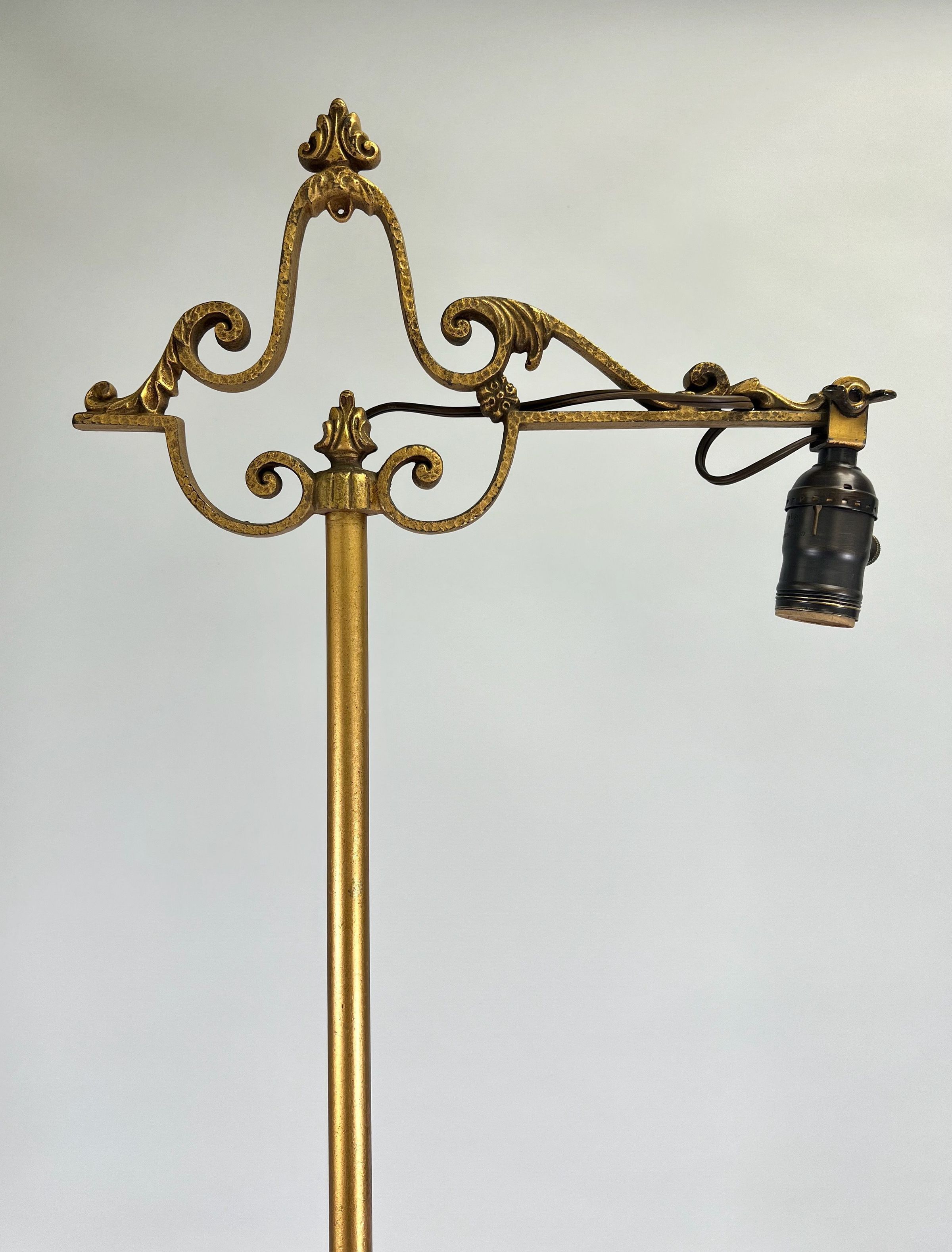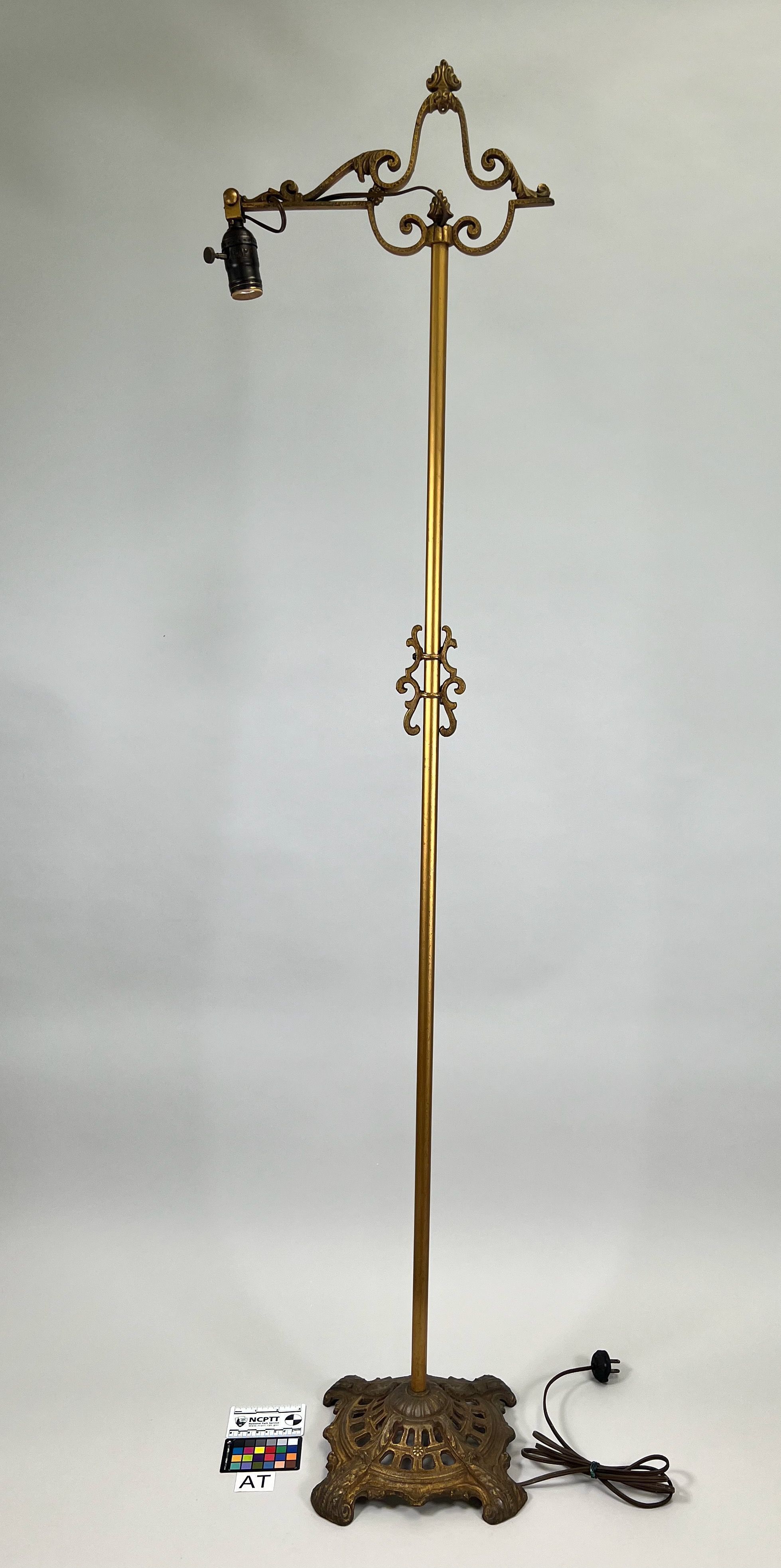 Wrought Iron. Standing electric floor lamp having scrolled head supporting a cantilever arm.
