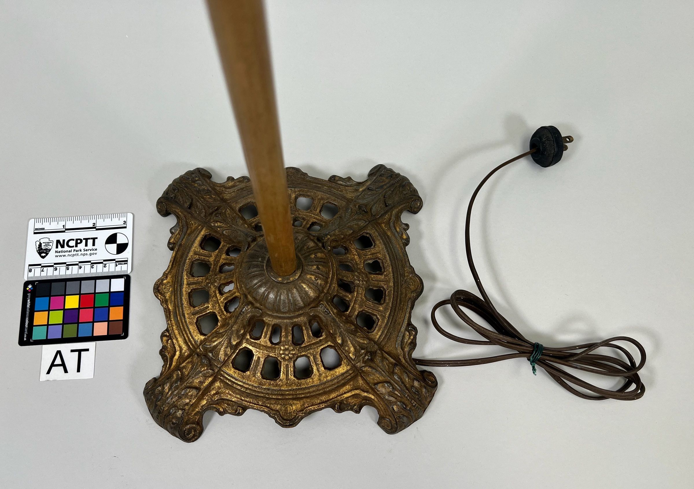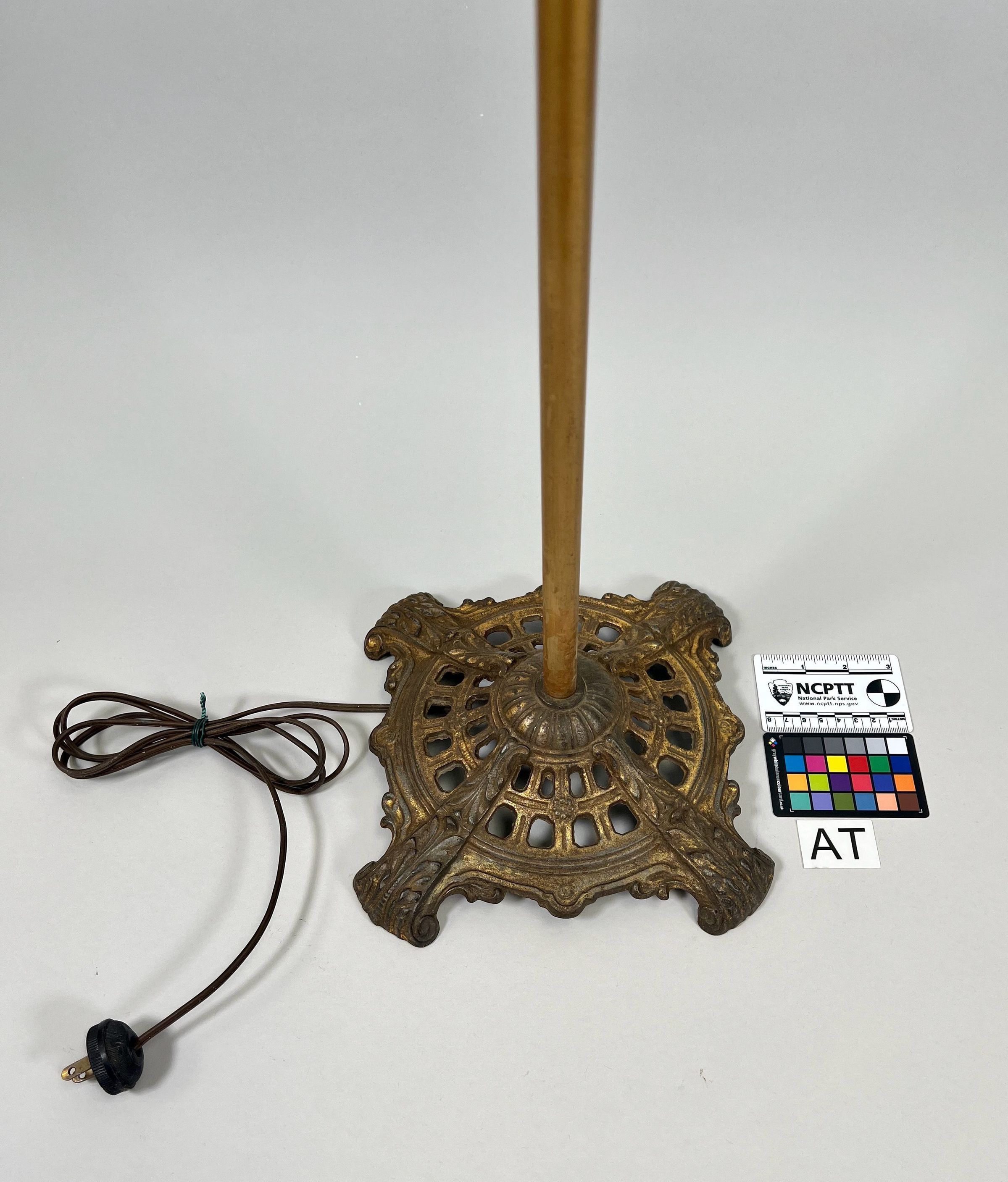 An intricately designed brass floor lamp featuring decorative scrollwork and an elegant fabric lampshade.Use