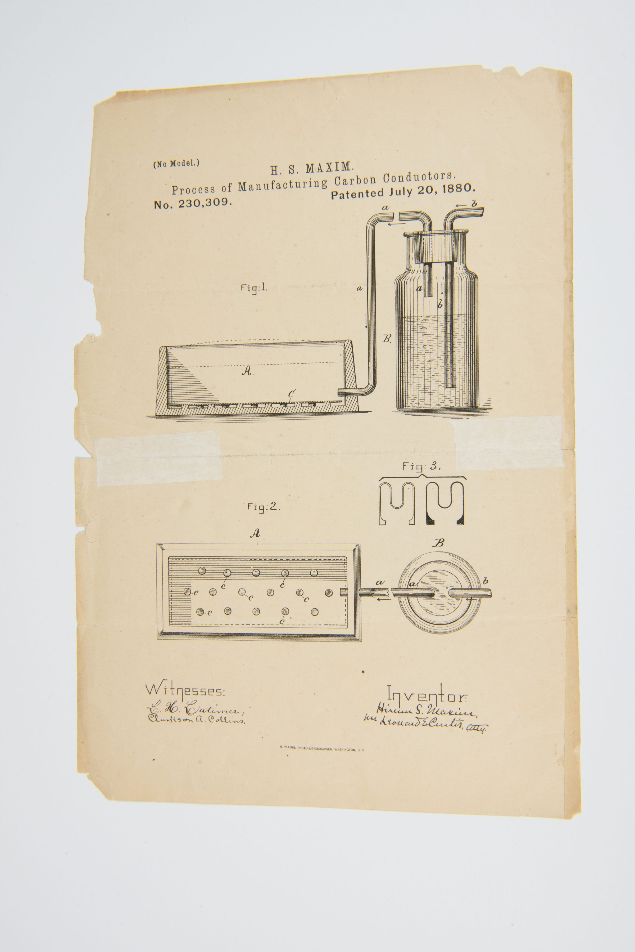 Lewis Latimer officially witnessed (and probably drew) this carbon manufacturing process patented by his boss Hiram Maxim. Latimer worked closely with Maxim in Bridgeport and New York City between 1879 and 1881, “acquainting myself with every branch of electric incandescent light construction and operation,” as he later put it.
