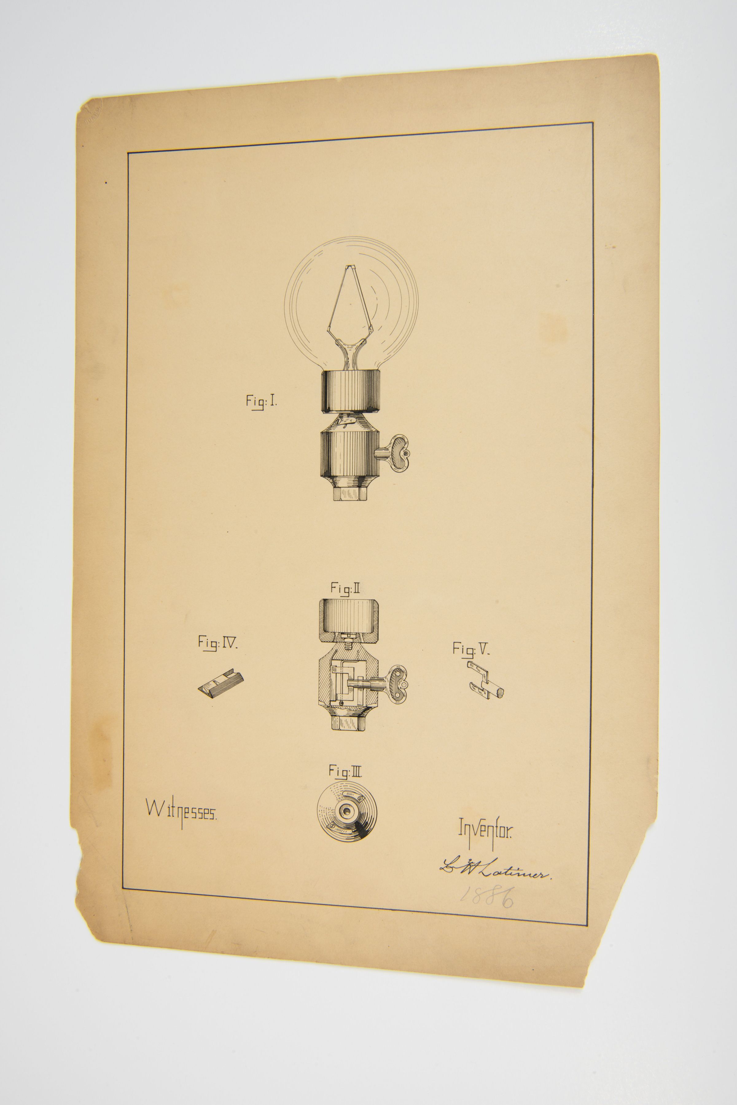 This is a detailed patent drawing of an electric lamp, designed by Lewis Howard Latimer in 1886. The image showcases a technical illustration of a lightbulb and its socket, along with multiple detailed views labeled Fig. I, II, III, IV, and V. The drawing provides an intricate breakdown of the lamp’s structure, including its filament, electrical connections, and mechanical components. The document is signed by L. H. Latimer and includes the date 1886 at the bottom. Although Latimer made this drawing in the form of a patent application sheet, he never did patent this design.Context