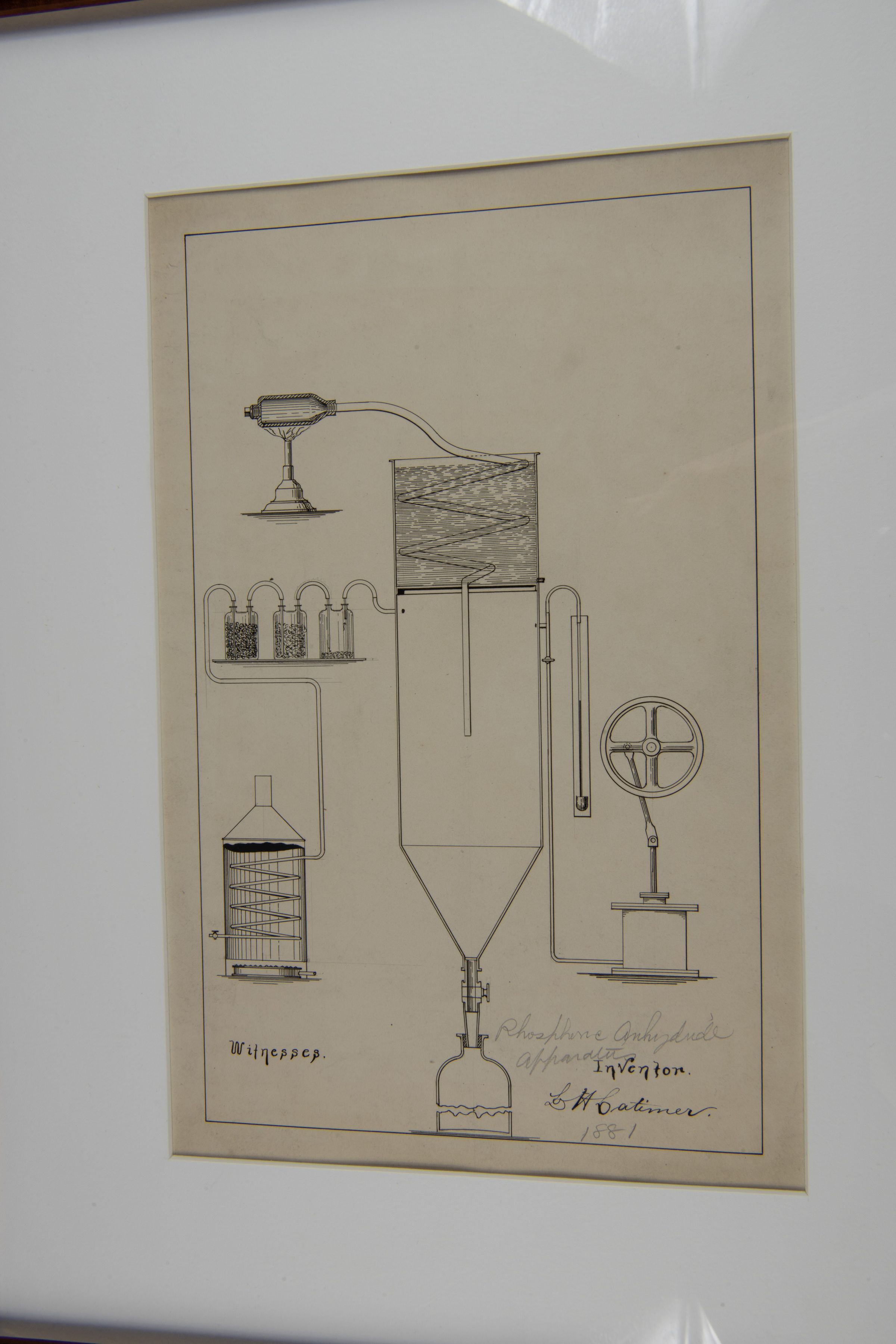 A chemical reaction chamber (possibly for phosphorus processing). A series of interconnected glass containers for chemical separation or filtration. A large funnel-like structure leading to a collection container at the bottom. A mechanical hand-crank system, which likely regulates some aspect of the process. Latimer’s signature is visible, along with the date 1881, reinforcing its authenticity.Context