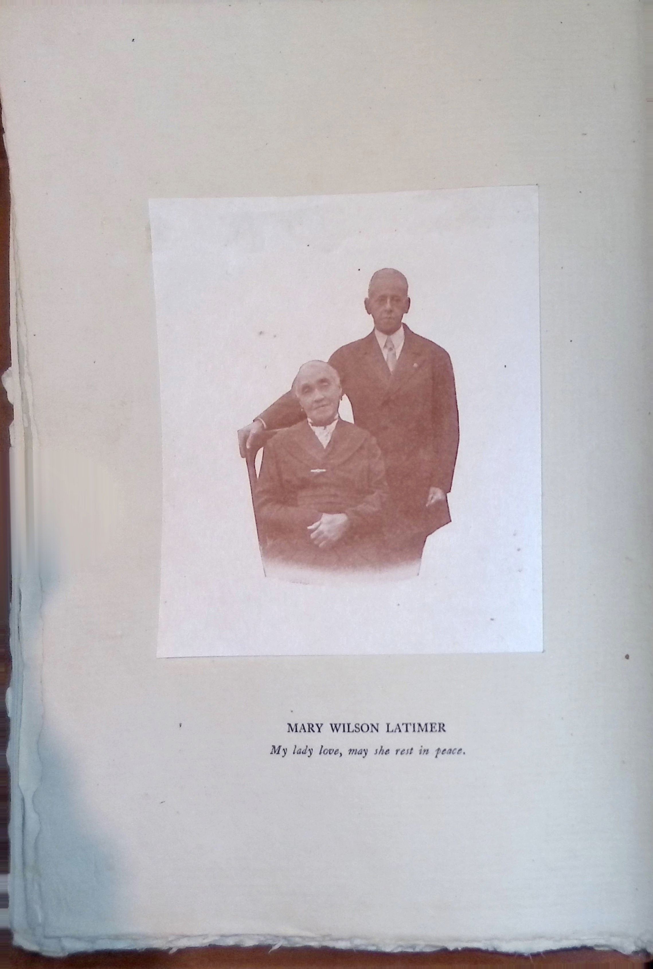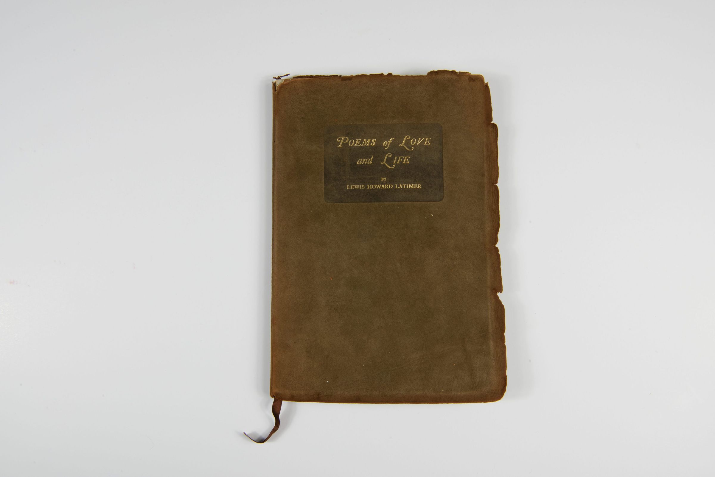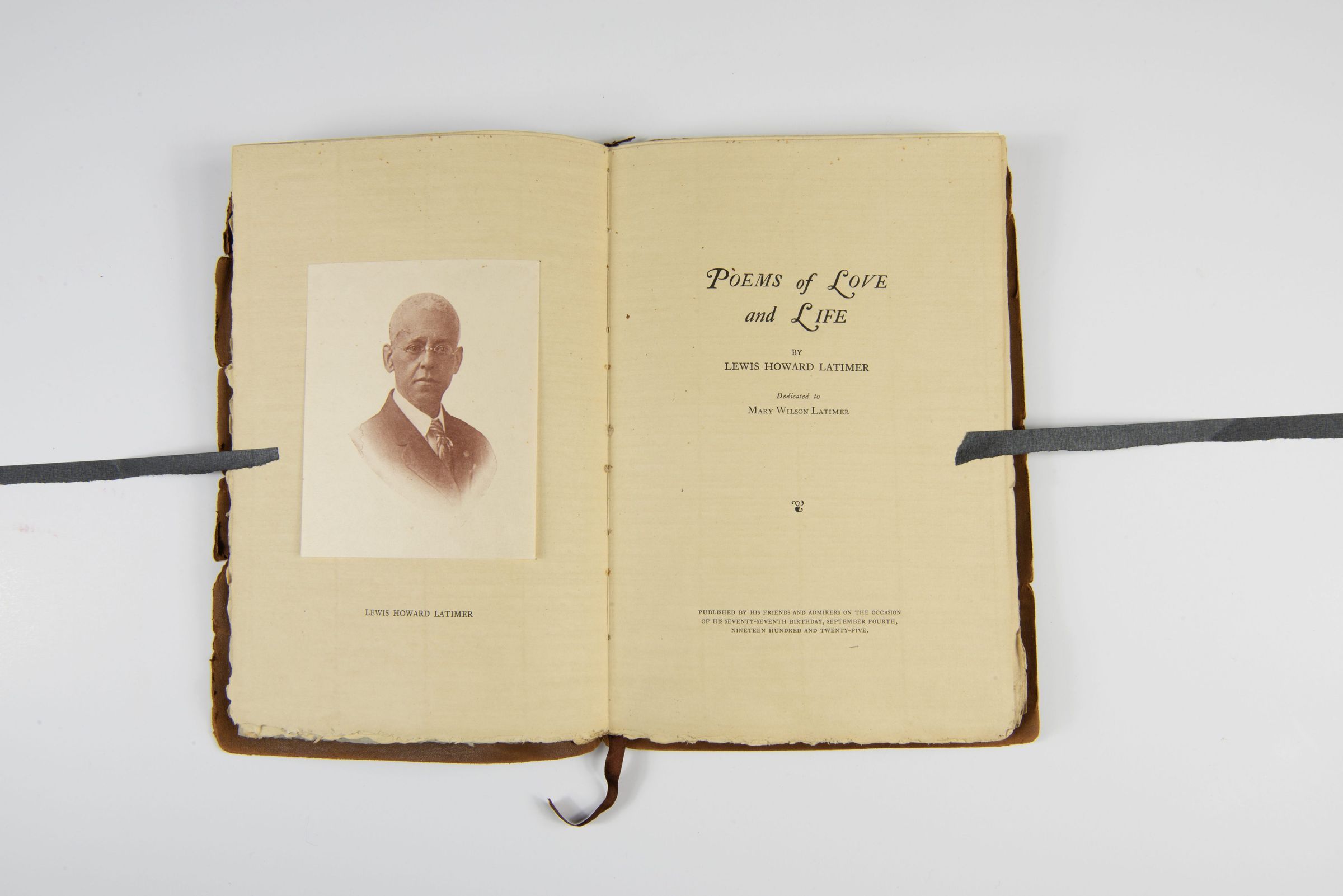 This book, titled Poems of Love and Life, is a collection of poetry by Lewis Howard Latimer. The book is dedicated to his wife, Mary Wilson Latimer, and features a portrait of the author on the inside cover. This edition was published by friends and admirers on the occasion of Latimer's seventy-seventh birthday in 1925. The book appears to be bound in brown suede with the title embossed on the cover. Keywords: Lewis Howard Latimer, Poems of Love and Life, Mary Wilson Latimer, African American poetry, vintage poetry collection, historical publication, 1925 edition, birthday dedicationContext