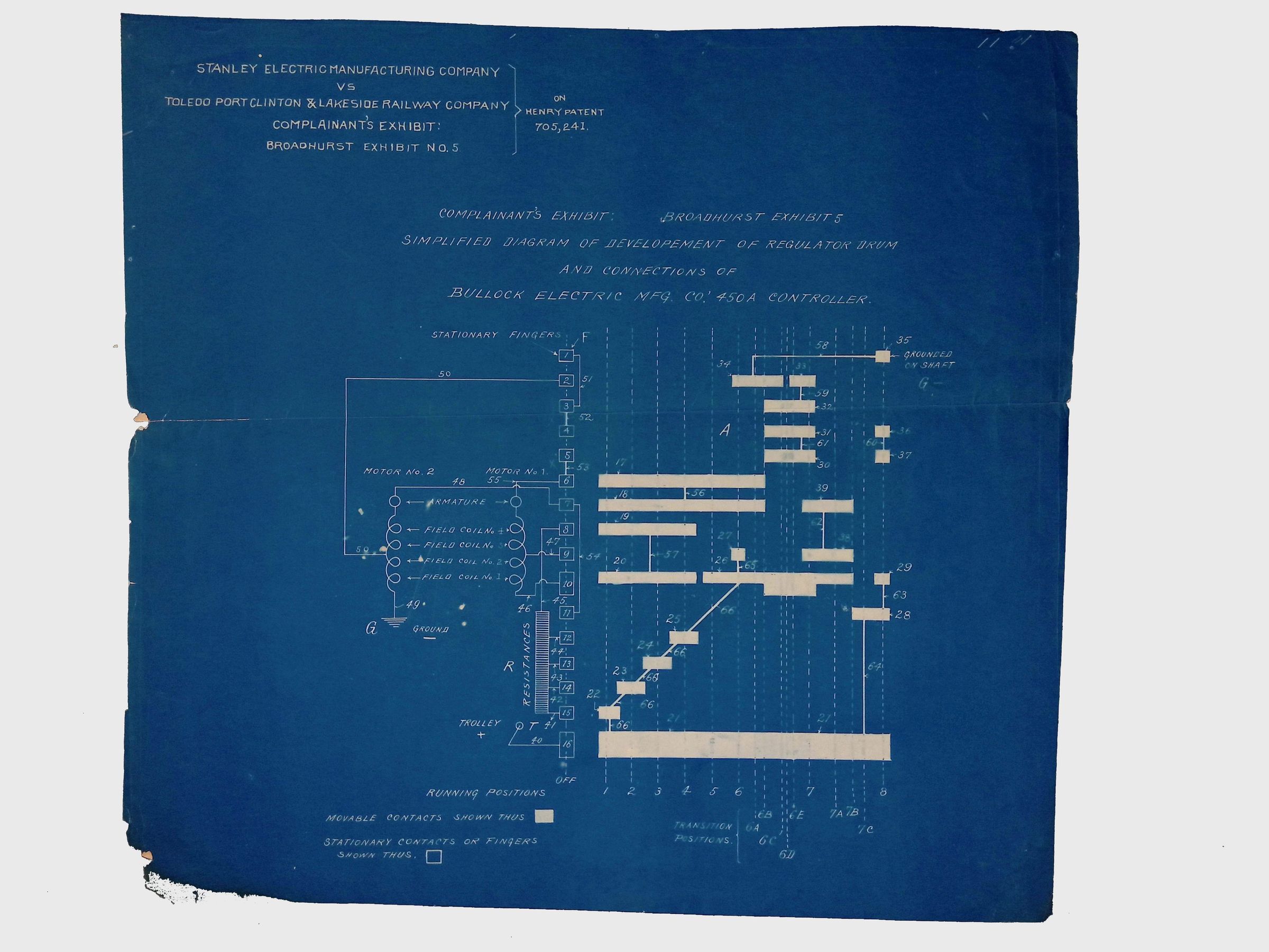 This document is part of a legal exhibit from the Stanley Electric Manufacturing Company vs. Toledo Port Clinton & Lakeside Railway Company case, related to Henry Patent No. 705,241. The exhibit is labeled as Broadhurst Exhibit No. 5 and presents a technical schematic for the regulator drum connections in the Bullock Electric Manufacturing Company's control system. As a mechanical draftsman and patents expert, Lewis Latimer worked for the Edison Company on complex lawsuits in which different companies challenged each other over patent infringement. He may also have done some of this work on a freelance basis for other clients.Collection