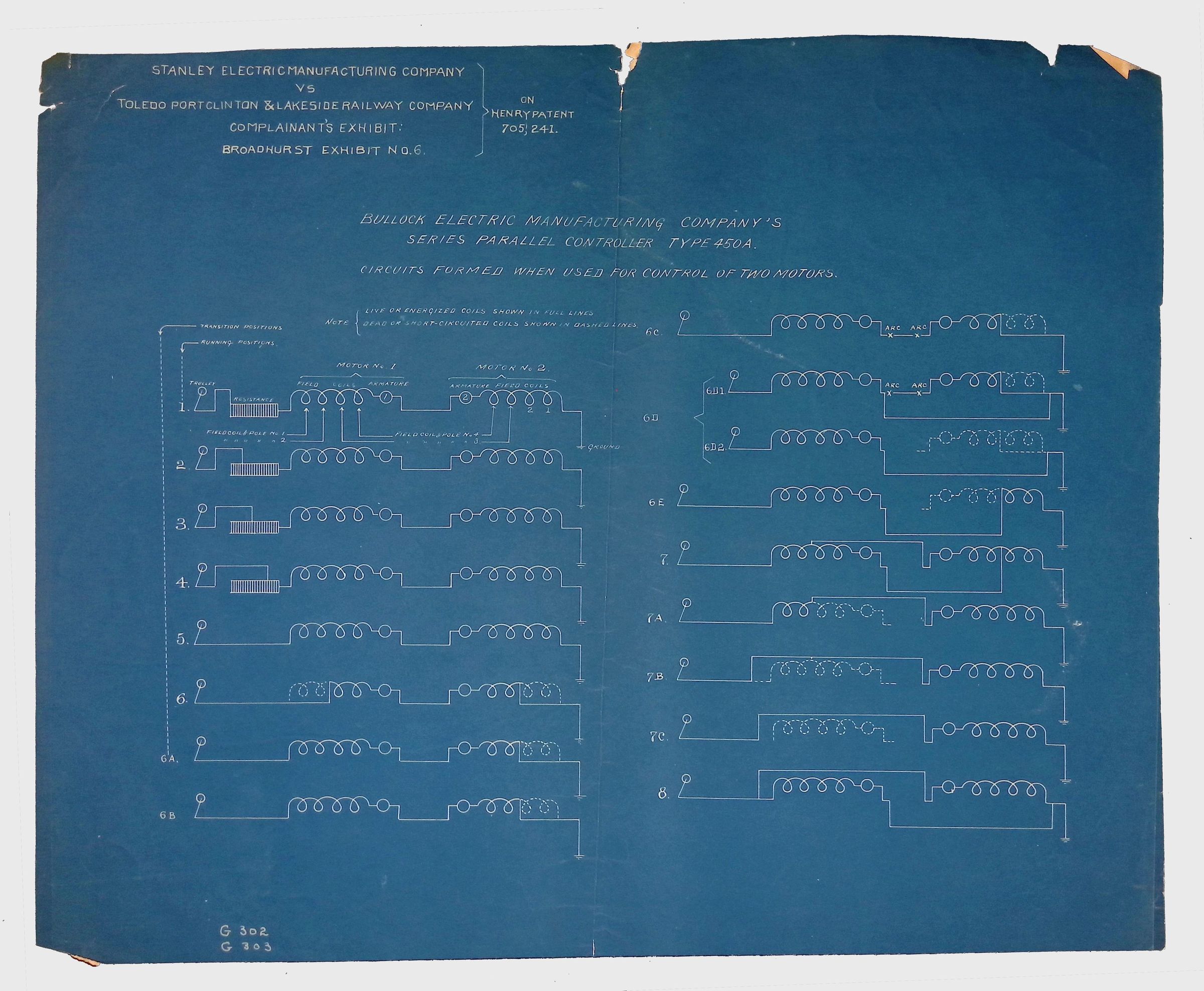 A detailed electrical schematic blueprint illustrating the circuits formed when used for control of two motors. The diagram includes labeled sections for various motor control positions, with components such as transition positions, field coils, and series-parallel connections. The circuits are drawn in a structured sequence, showing different operational states. This document was likely used in patent litigation to demonstrate the design and function of the Bullock Electric Manufacturing Company’s Type 450A Controller.Context