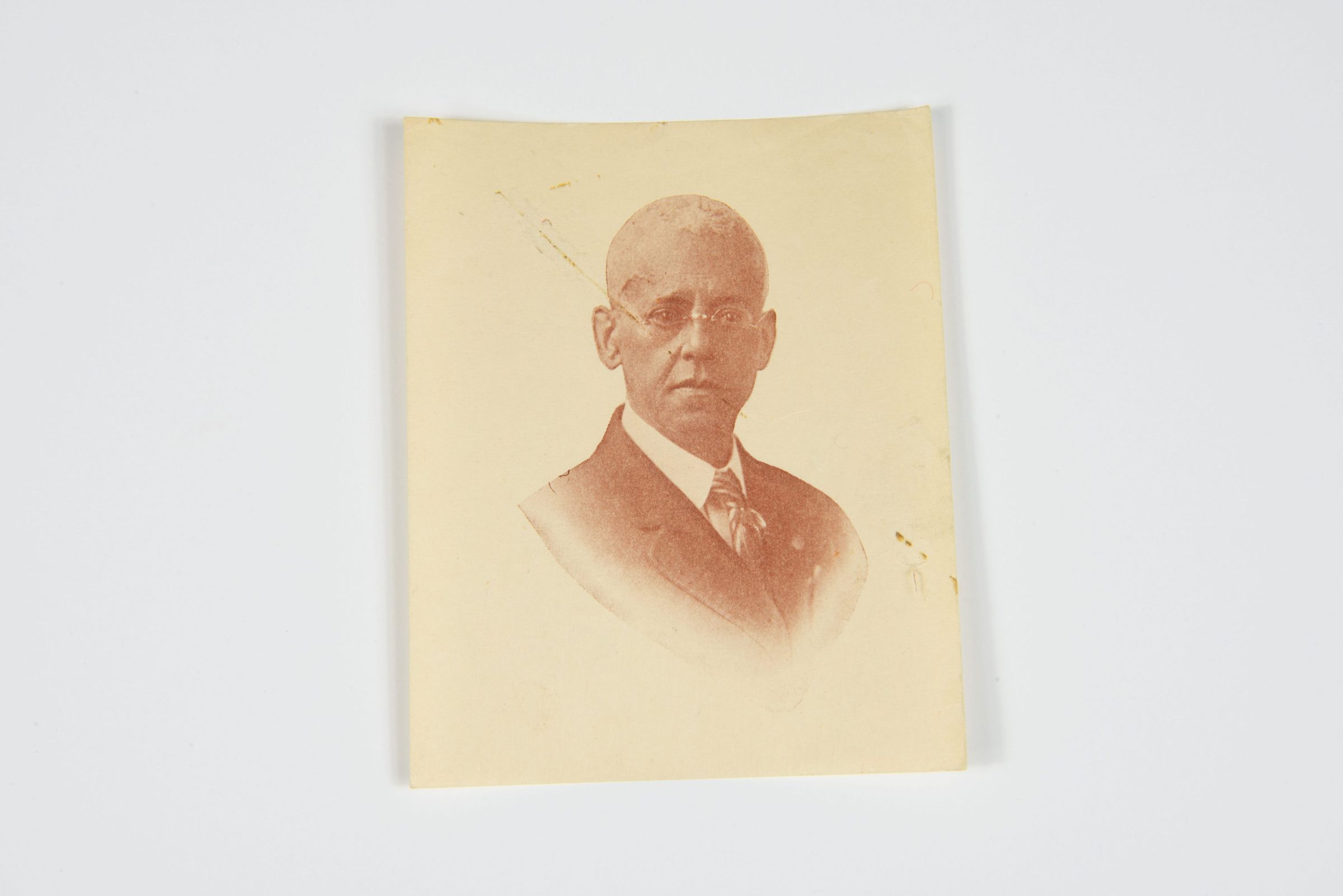 This is a sepia-toned photographic portrait of Lewis Latimer, identical to another photographic print in the collection that has the inscription “To my wife from her devoted husband. L. H. Latimer – 70 years young, July 1919, N.Y." Latimer wears a dark suit, white shirt, and tie, with round-rimmed glasses. His expression is serious and dignified, and his bald head and slight wrinkles suggest advanced age. The portrait has a soft vignette effect, commonly used in early photographic prints to create a refined and professional appearance. The edges of the print are slightly worn, with visible creases and discoloration, indicating age and handling over time.Context