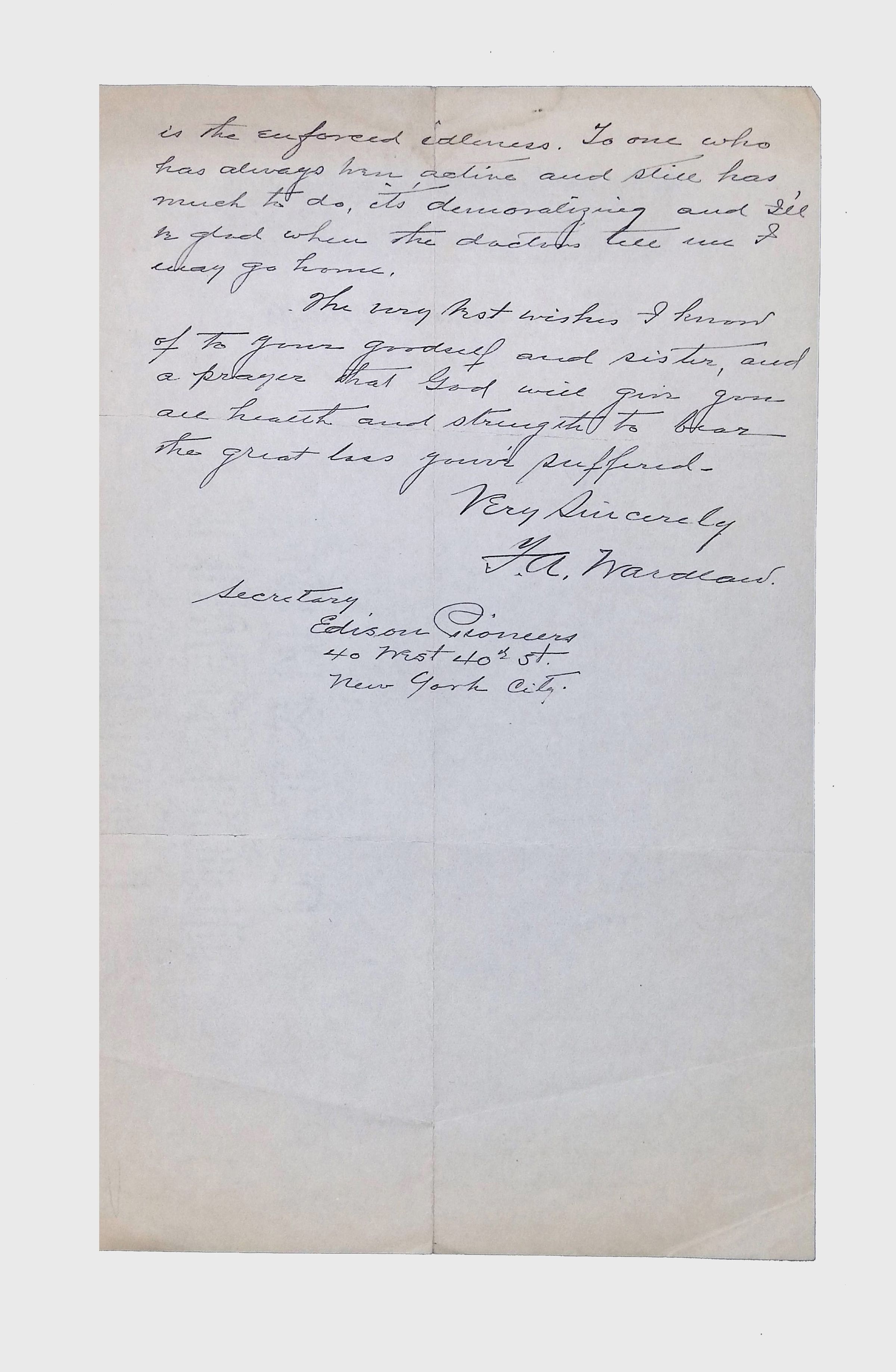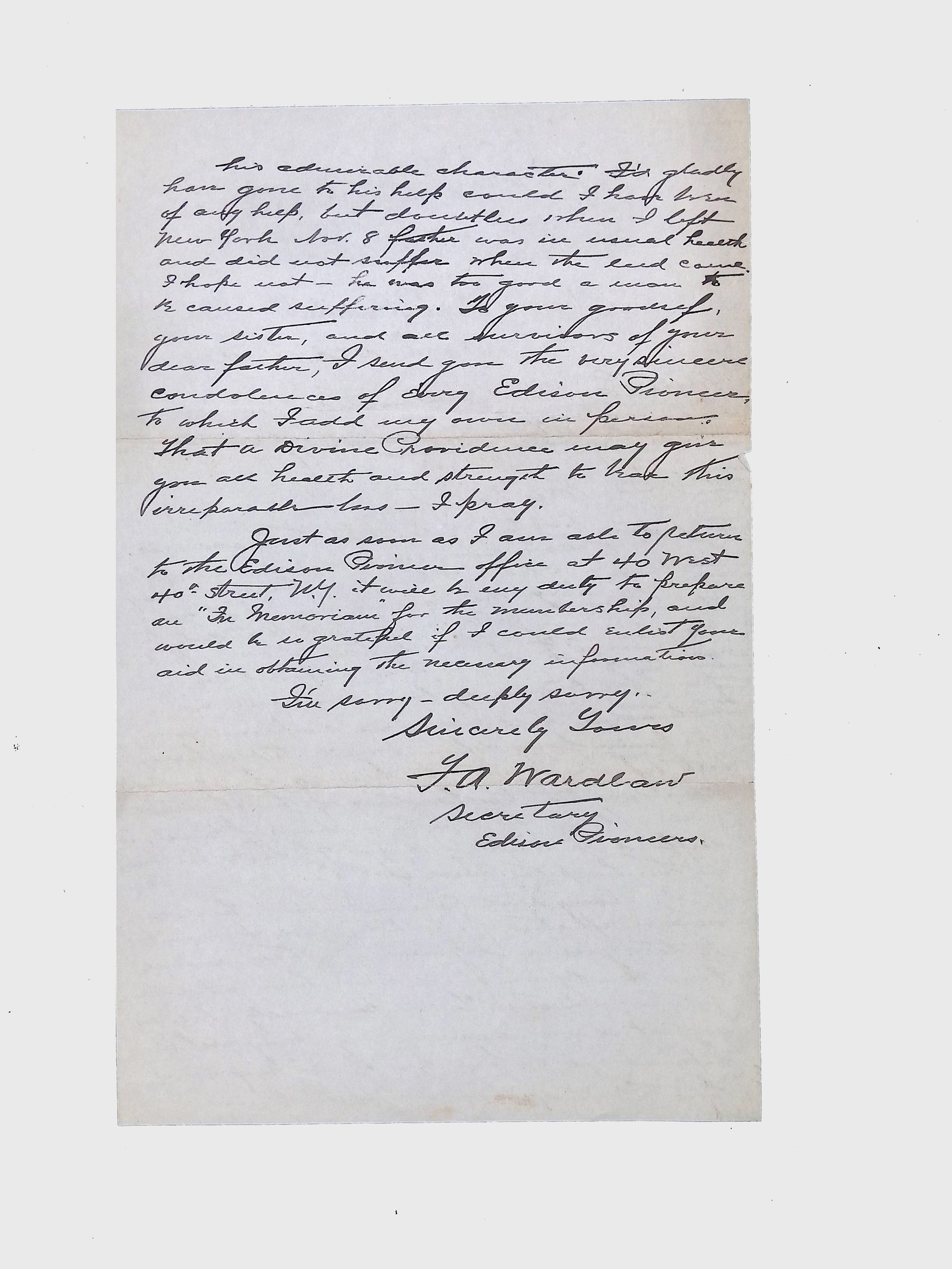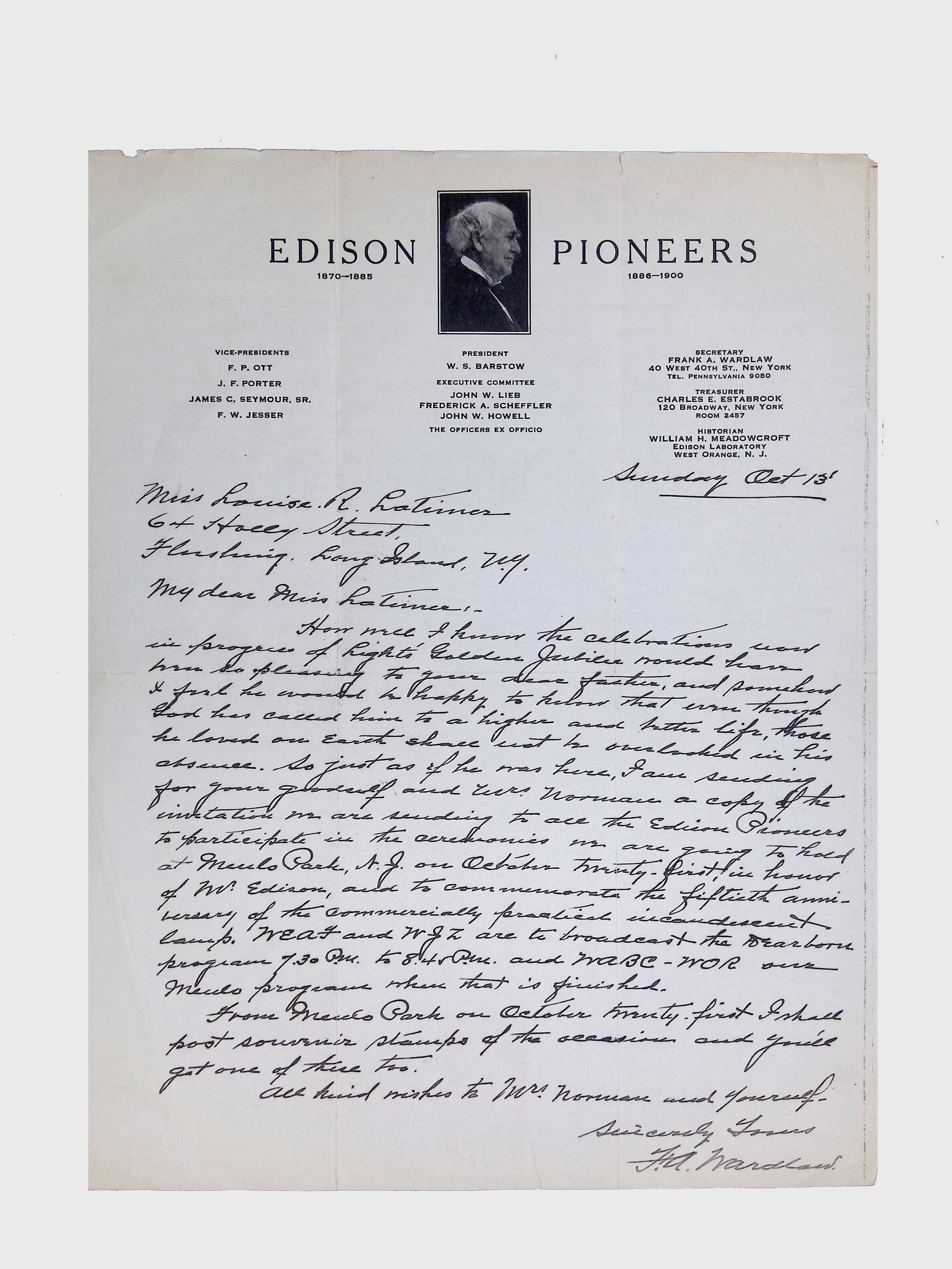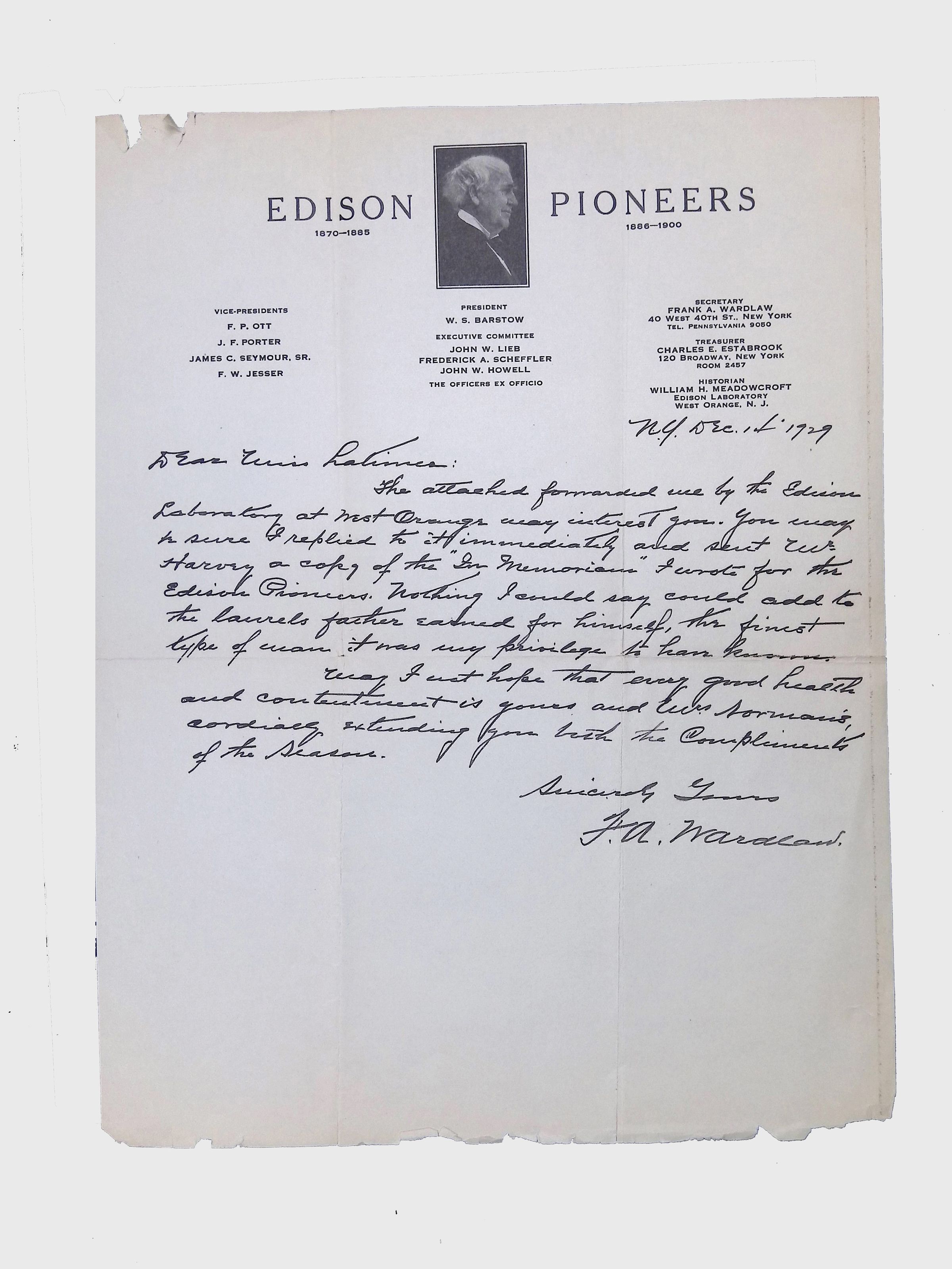 This folder contains letters by Frank A. Wardlaw, Secretary of the Edison Pioneers, to Louise Latimer in 1928-29 discussing his “In Memoriam” piece written after Lewis Latimer’s death, his condolences, and reminiscences about Latimer. It also contains correspondence from Albert Morris to Louise Latimer in 1956, with reference to “A Short Biography of Lewis Latimer” written by Morris, and other matters. Official Business Letters: Correspondence from various companies and institutions, some bearing official letterheads. Personal Letters: Handwritten letters between family members and associates. Legal and Administrative Documents: Typewritten statements, possibly related to financial or estate matters. Envelopes with Postmarks and Stamps: Some letters are preserved in their original mailed envelopes, with visible postal markings.Context