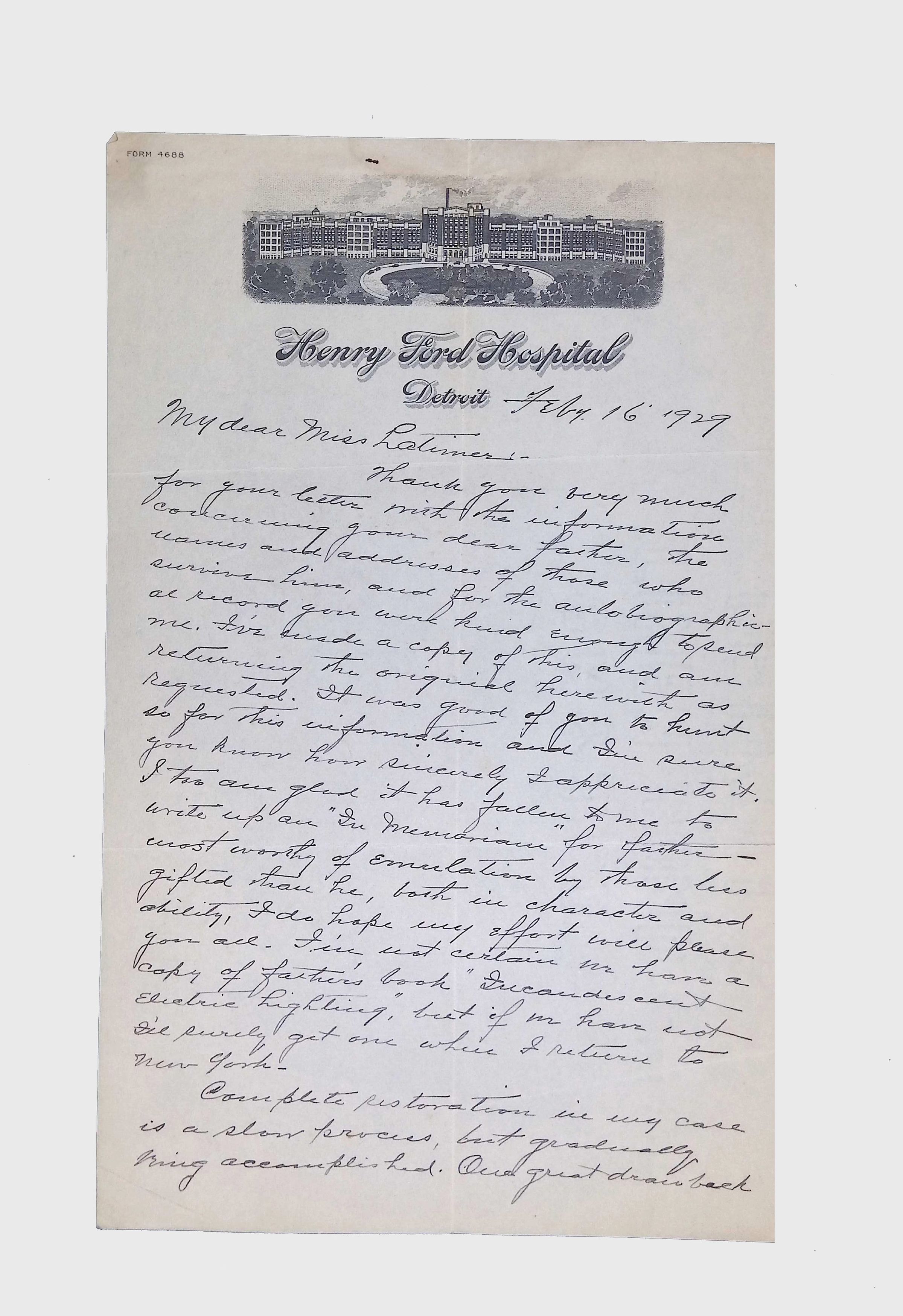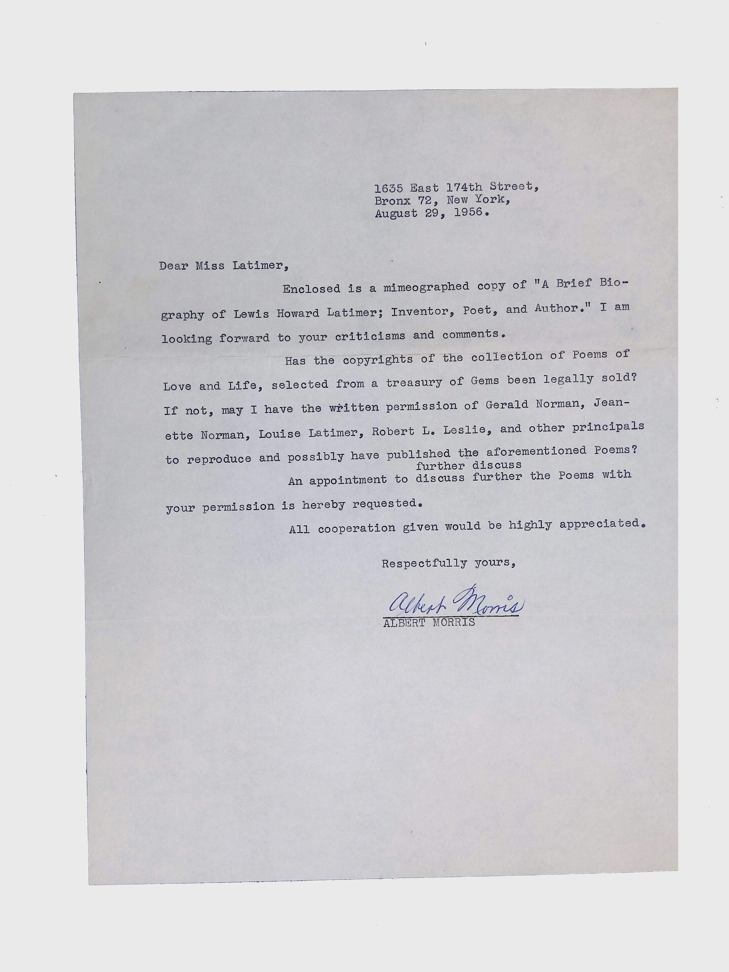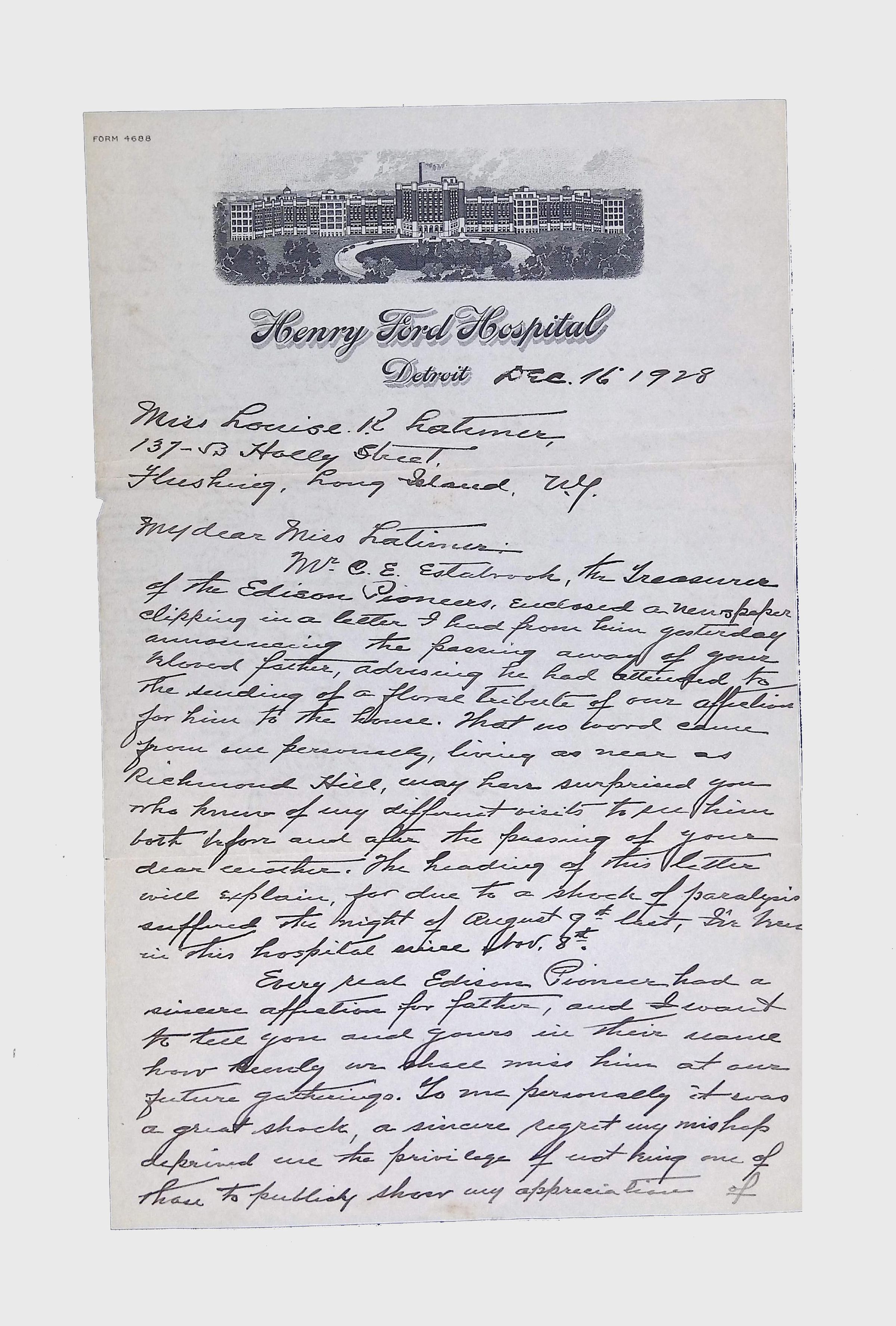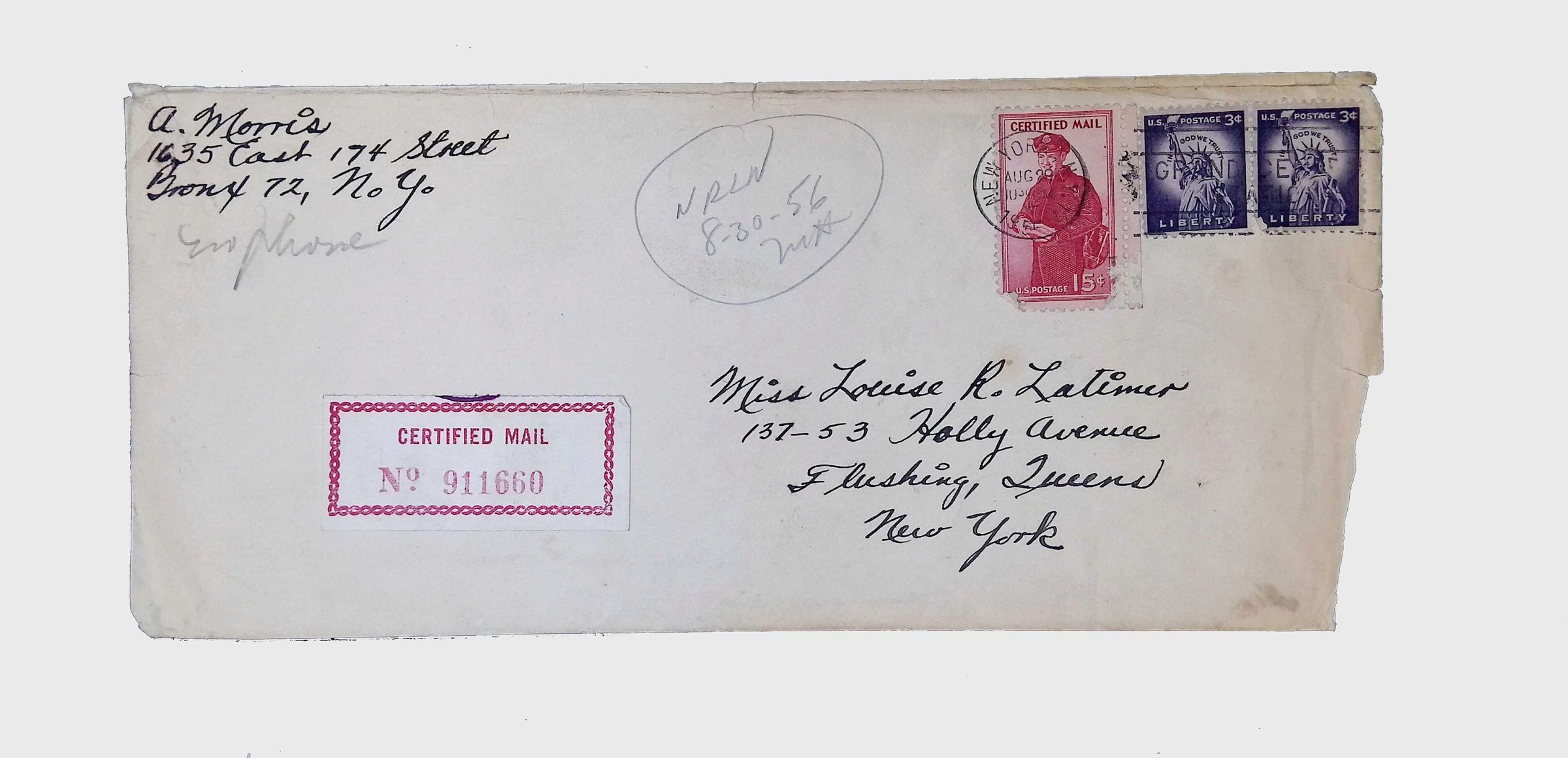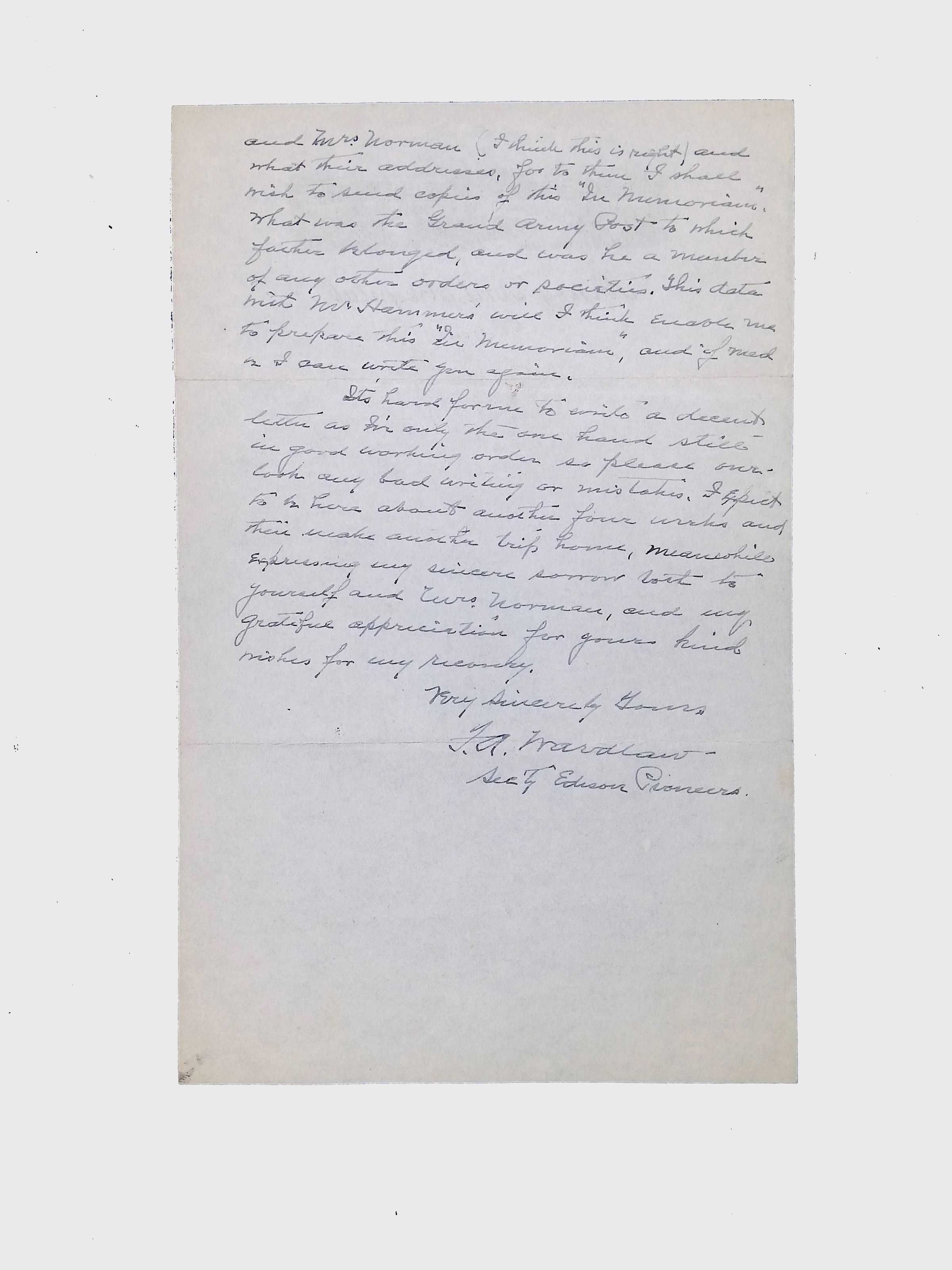 This folder contains letters by Frank A. Wardlaw, Secretary of the Edison Pioneers, to Louise Latimer in 1928-29 discussing his “In Memoriam” piece written after Lewis Latimer’s death, his condolences, and reminiscences about Latimer. It also contains correspondence from Albert Morris to Louise Latimer in 1956, with reference to “A Short Biography of Lewis Latimer” written by Morris, and other matters. Official Business Letters: Correspondence from various companies and institutions, some bearing official letterheads. Personal Letters: Handwritten letters between family members and associates. Legal and Administrative Documents: Typewritten statements, possibly related to financial or estate matters. Envelopes with Postmarks and Stamps: Some letters are preserved in their original mailed envelopes, with visible postal markings.Context