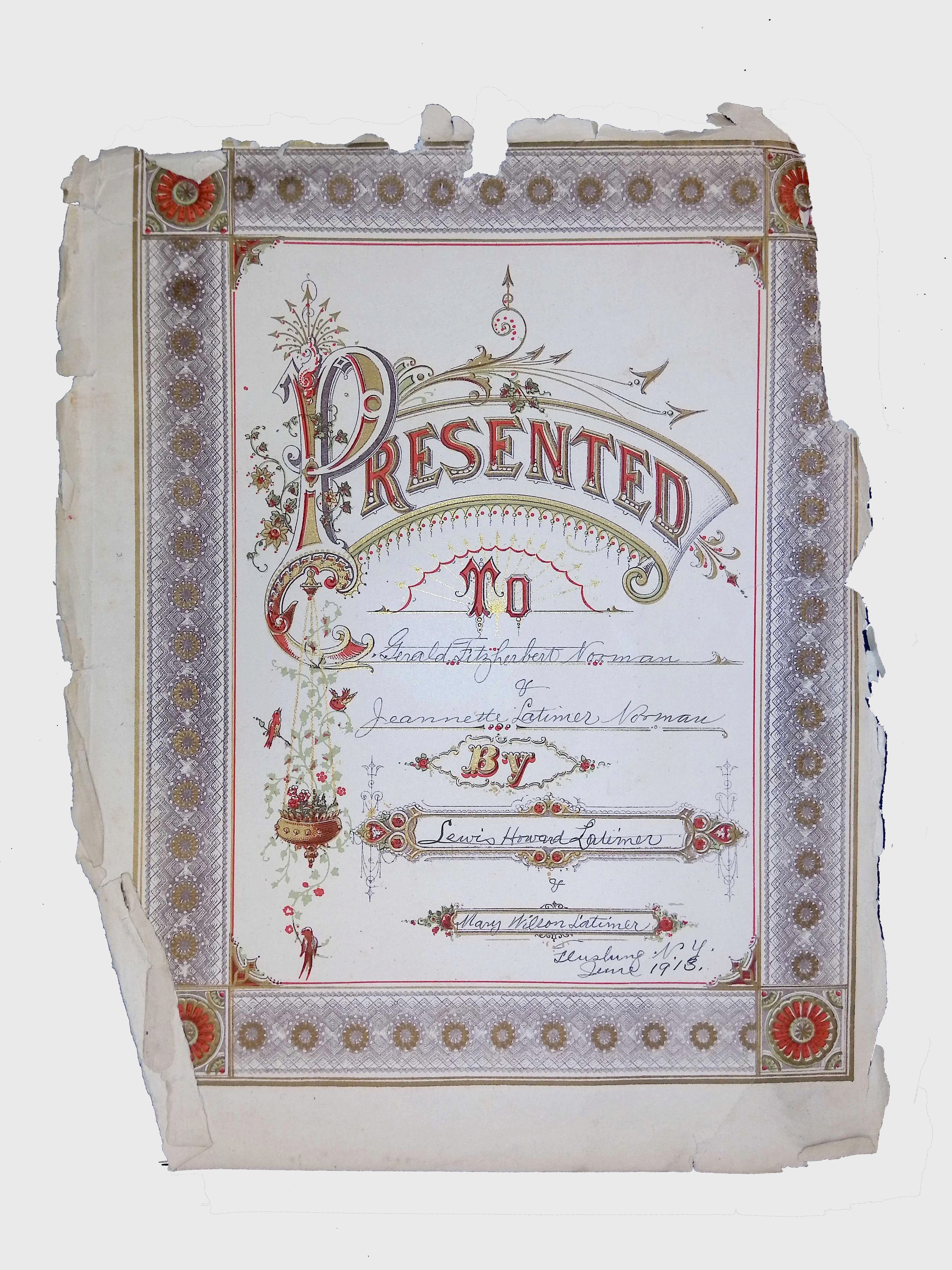 The certificate, ornately designed with gold embellishments, floral motifs, and elegant script, is probably the detached frontispiece to an album or book presented by Lewis and Mary Latimer to their daughter Jeannette and her husband, Gerald Fitzherbert Norman, in June 1913. It might be part of a gift on the occasion of Jeannette’s and Gerald’s third wedding anniversary.. The word "PRESENTED" is prominently displayed at the top, followed by handwritten inscriptions detailing the recipient and the purpose of the presentation. The edges of the document show signs of wear and deterioration, indicating its historical significance and age. This item offers insight into the cultural and social customs of formal recognition during the time period in which it was created.Context