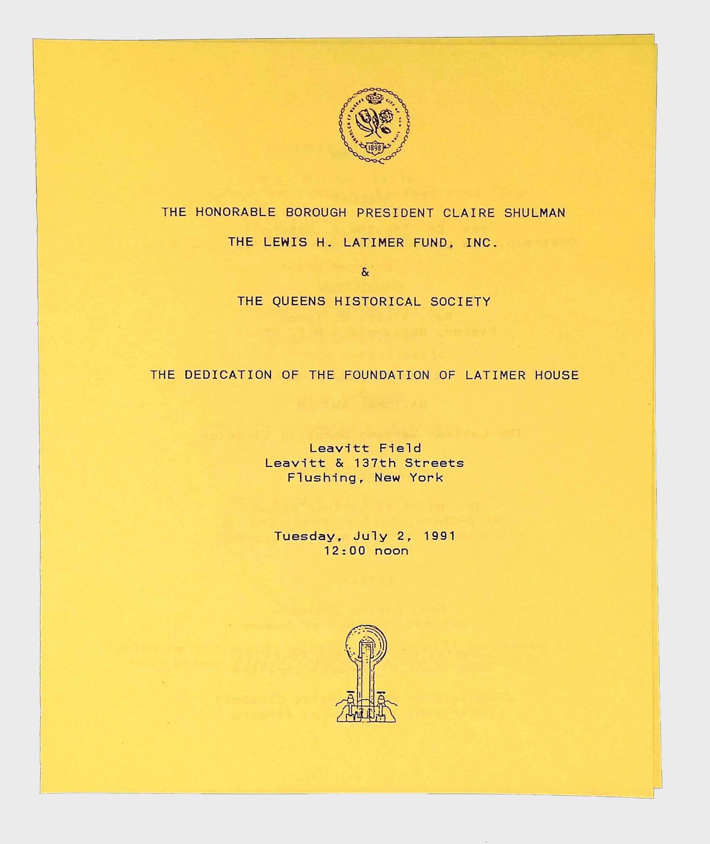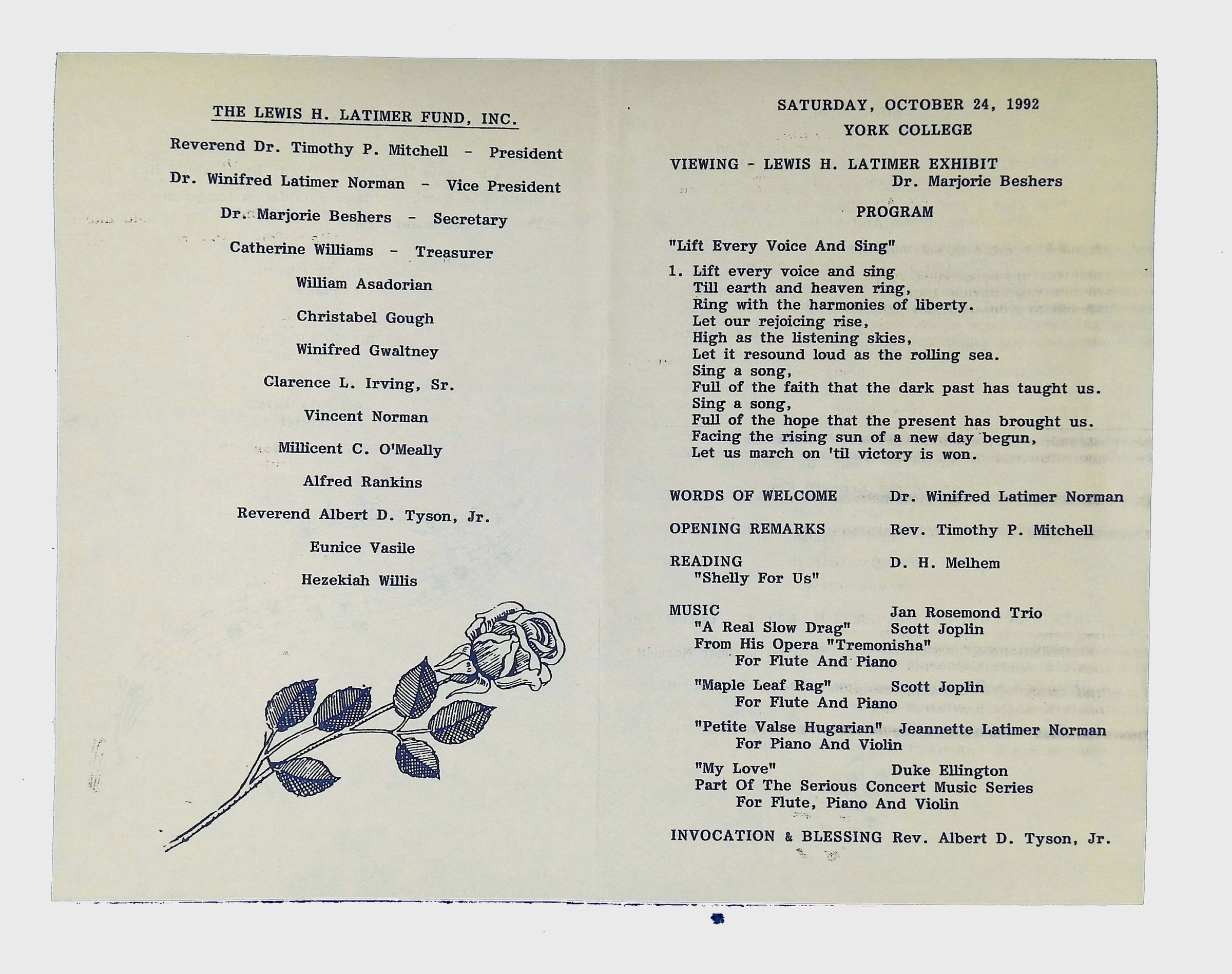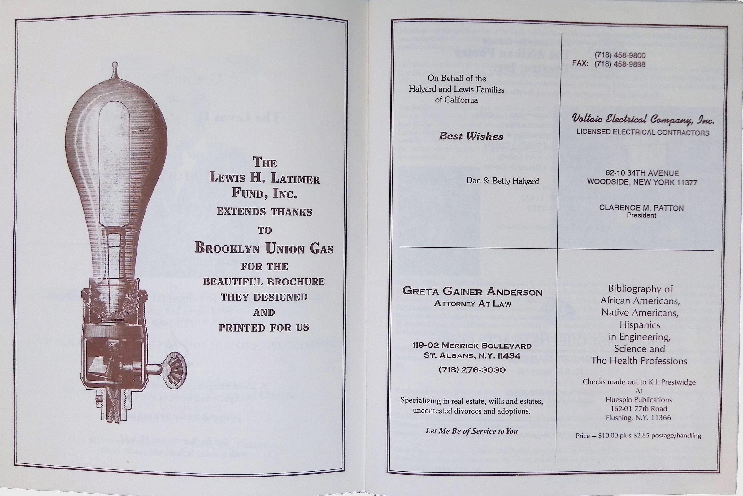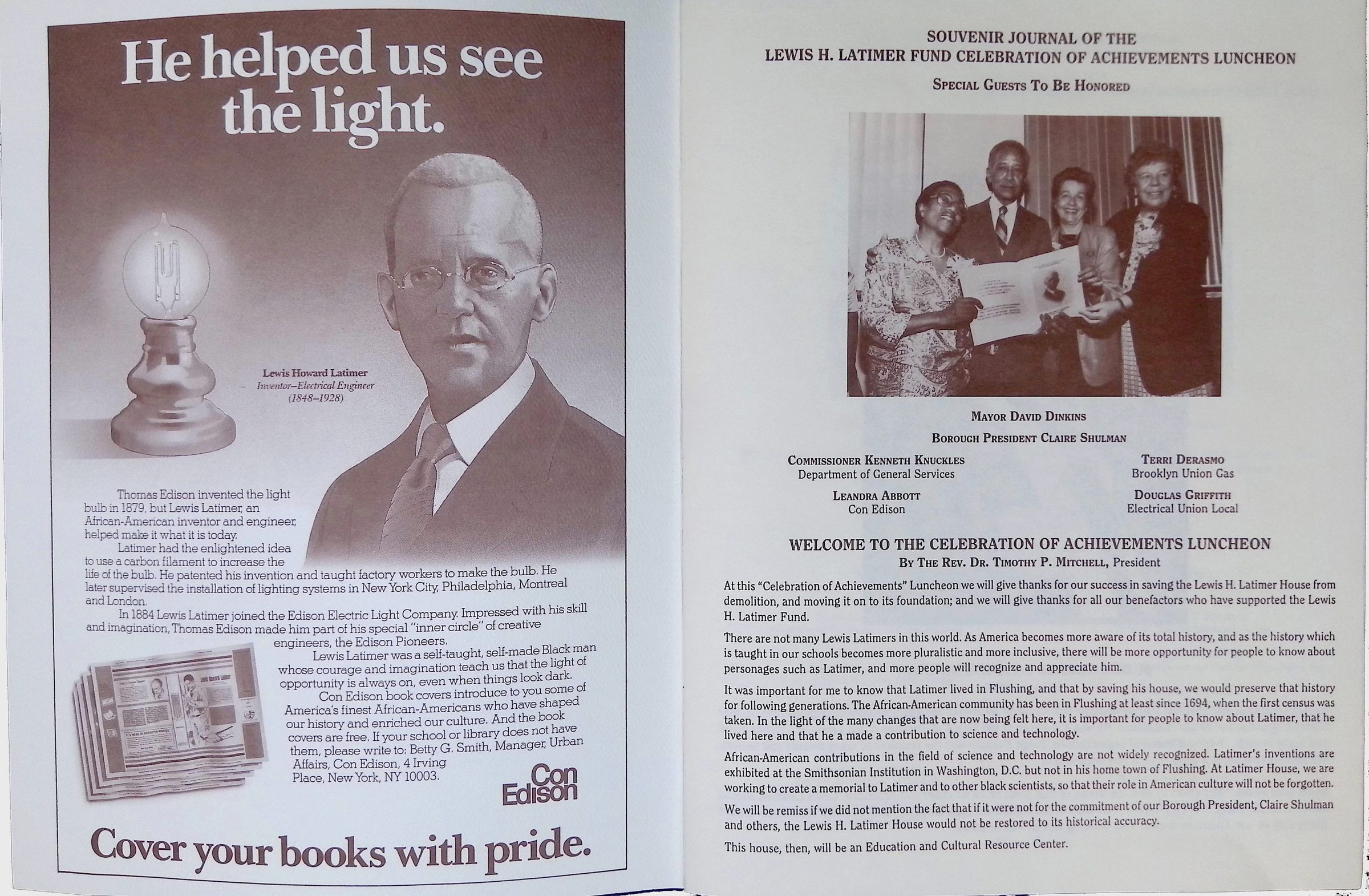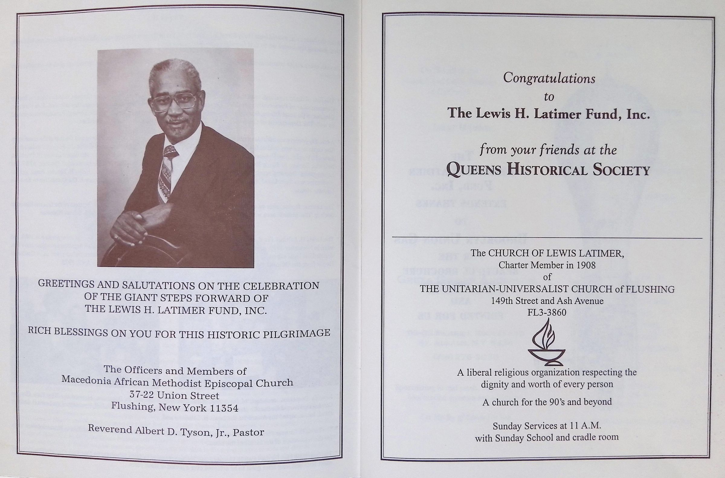 A collection of event programs, community outreach materials, and historical overviews celebrating the legacy of Lewis H. Latimer generated by the Lewis Latimer Fund, Inc. during the 1990s. Among those pictured or mentioned at Lewis Latimer’s grandchildren Winifred Norman and Gerald L. Norman, New York City Mayor David Dinkins, and Queens Borough President Claire Shulman..Context
