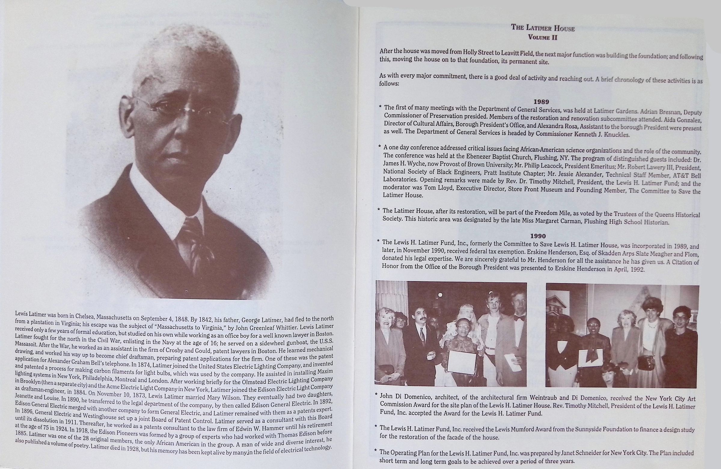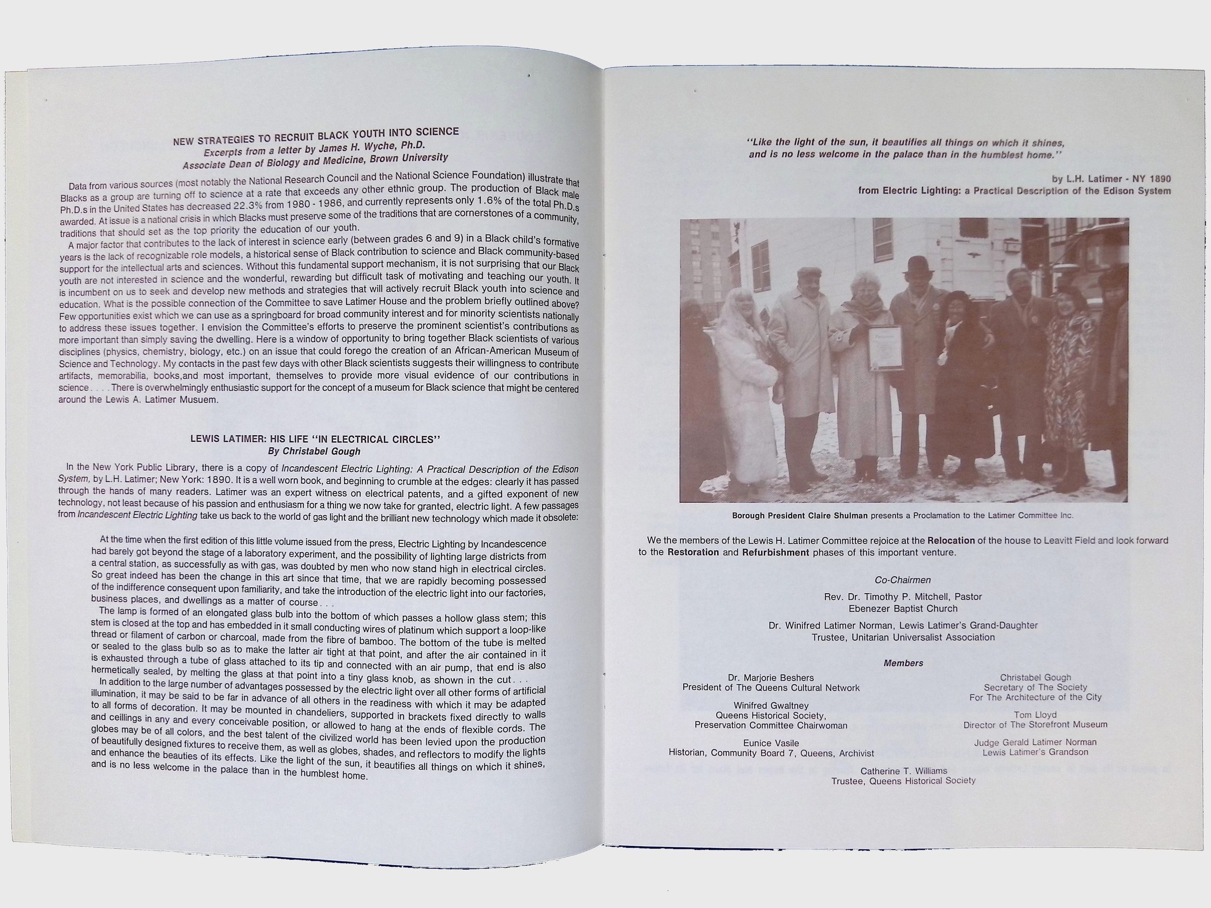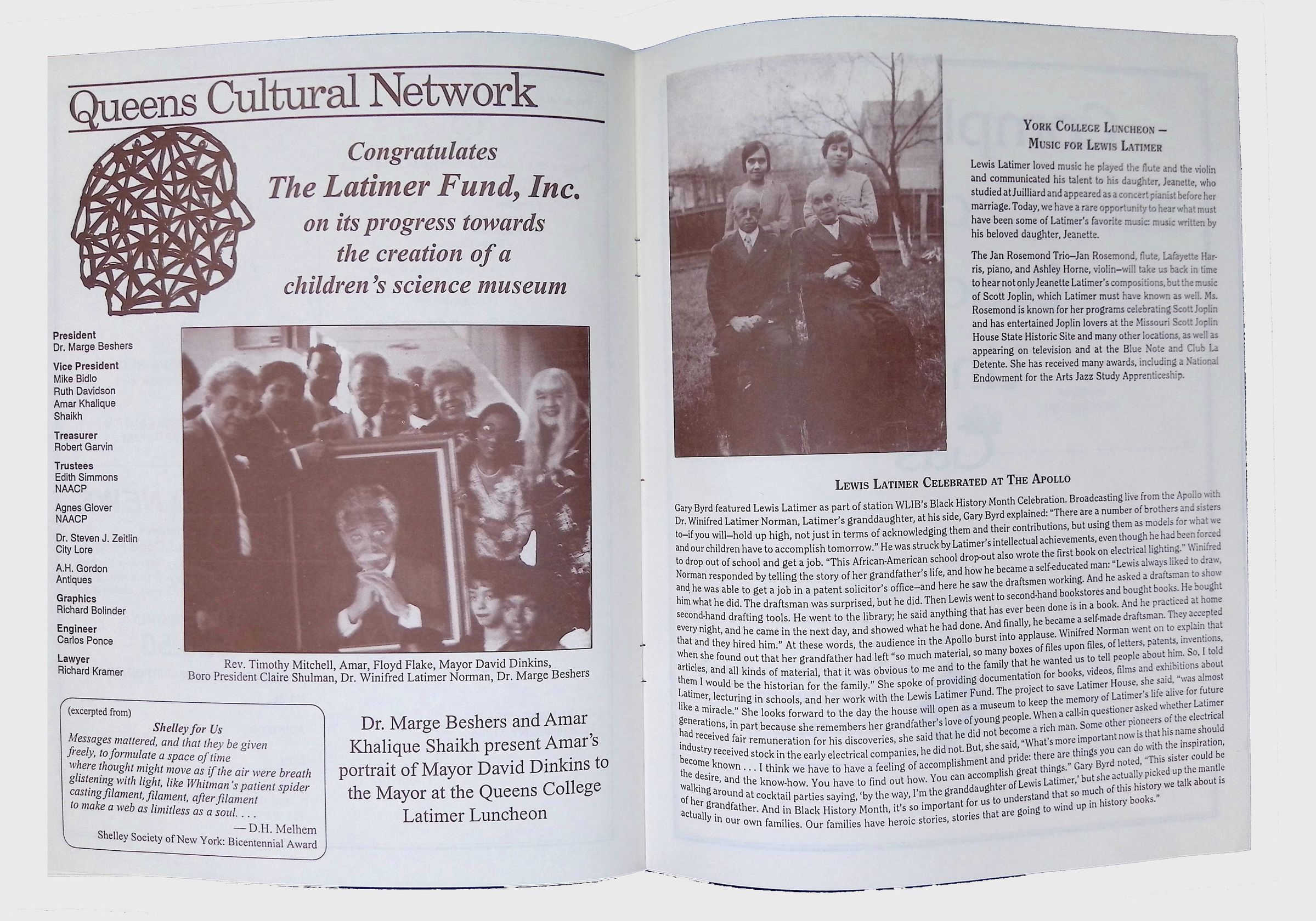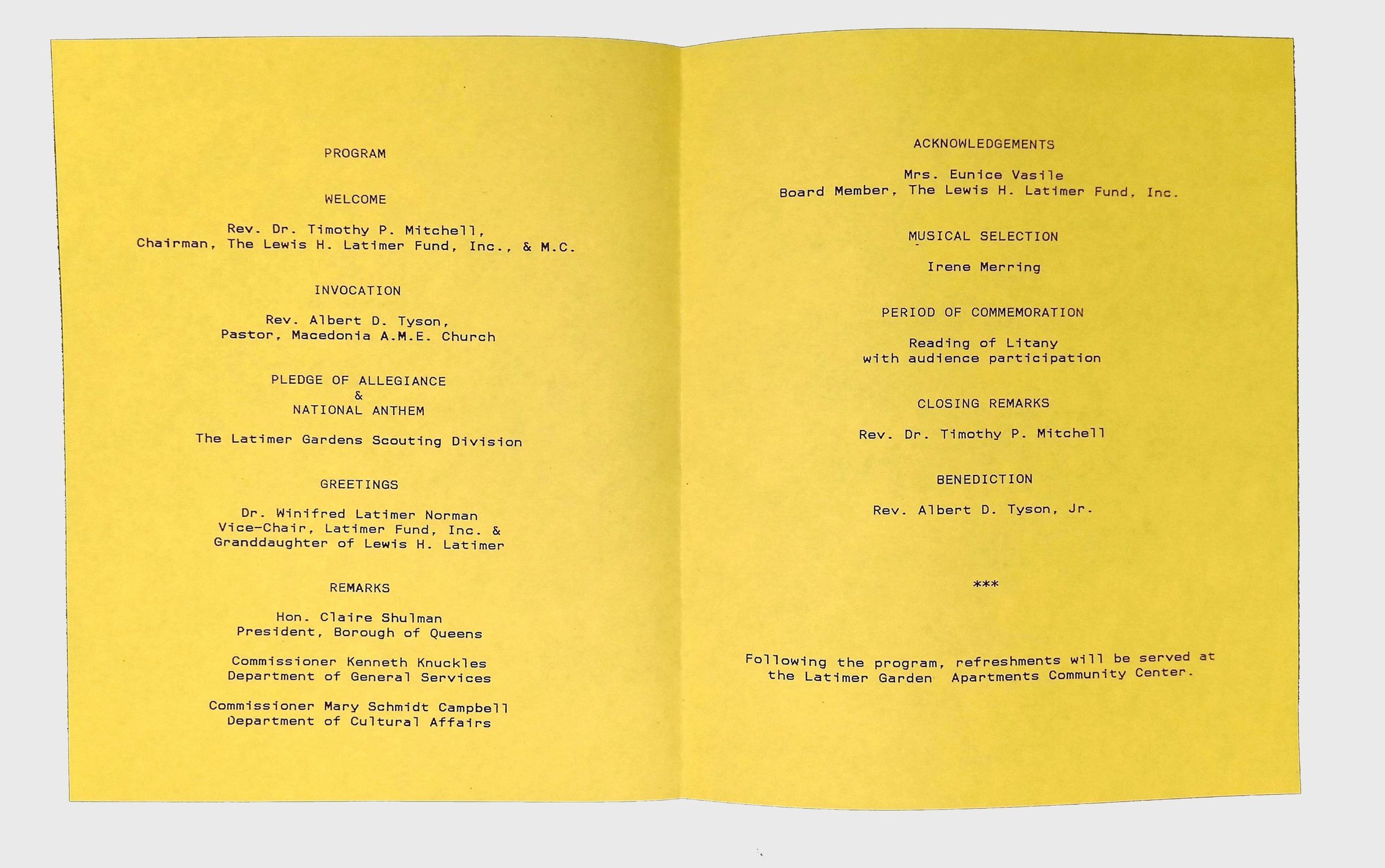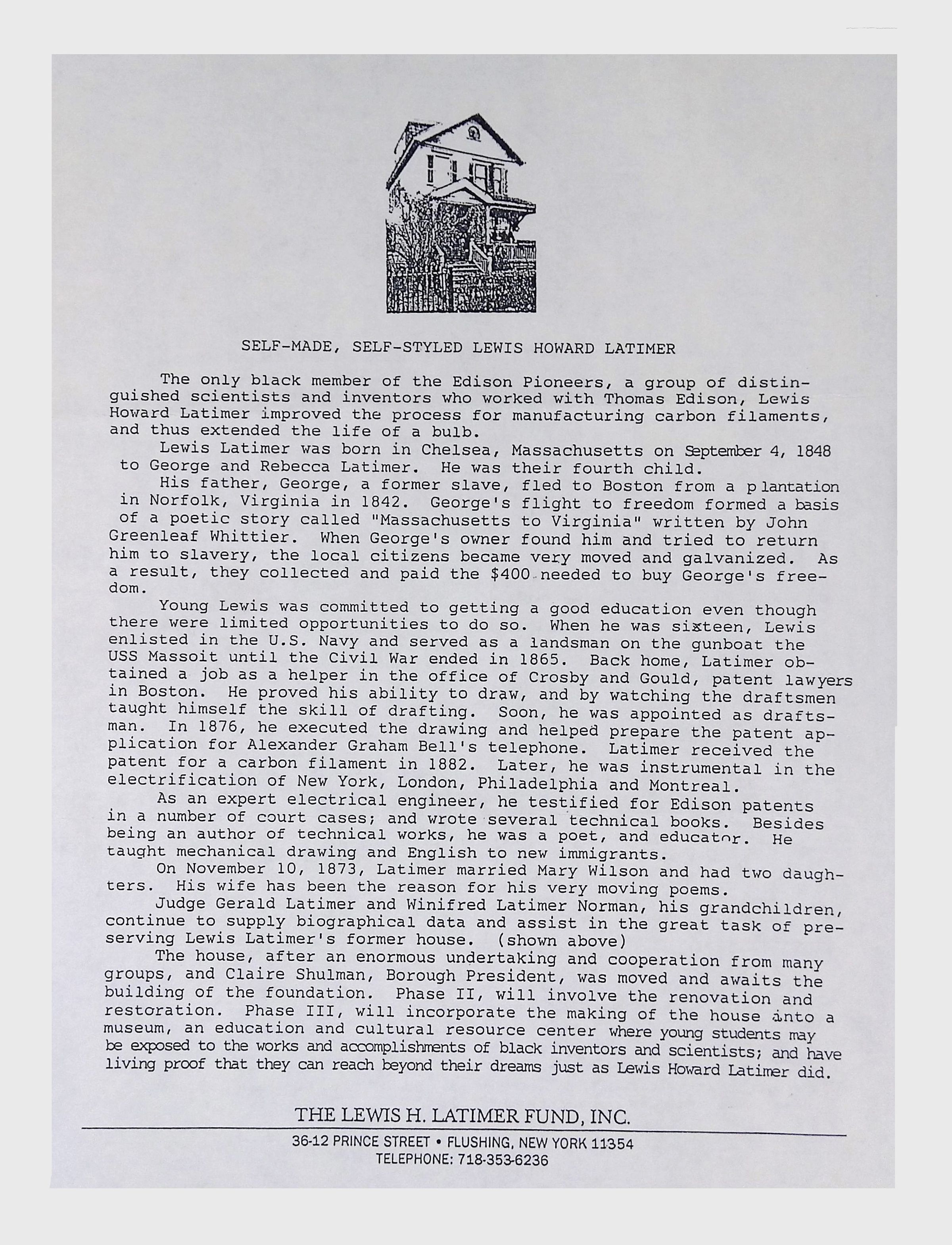 A collection of event programs, community outreach materials, and historical overviews celebrating the legacy of Lewis H. Latimer generated by the Lewis Latimer Fund, Inc. during the 1990s. Among those pictured or mentioned at Lewis Latimer’s grandchildren Winifred Norman and Gerald L. Norman, New York City Mayor David Dinkins, and Queens Borough President Claire Shulman..Context